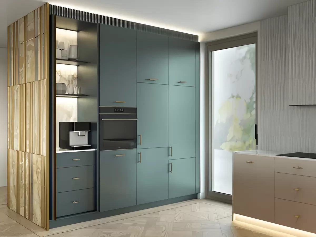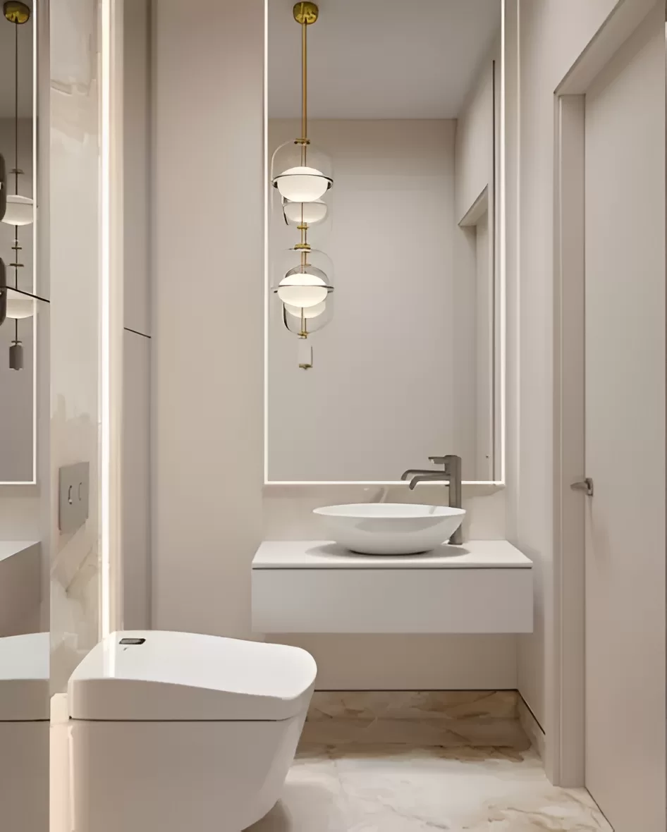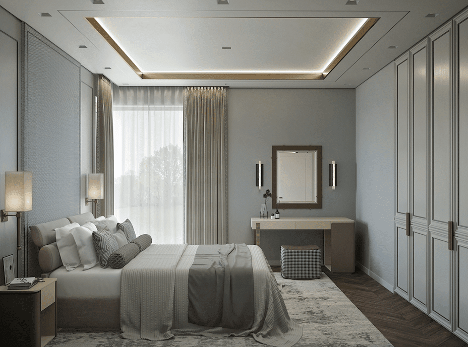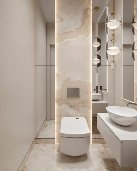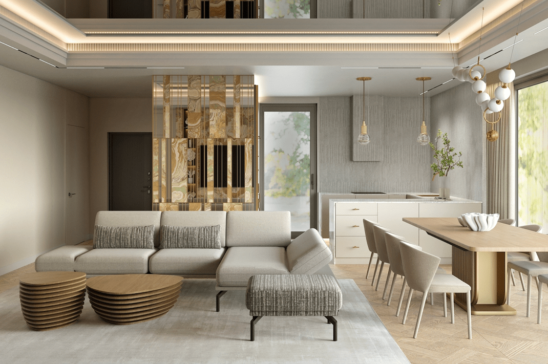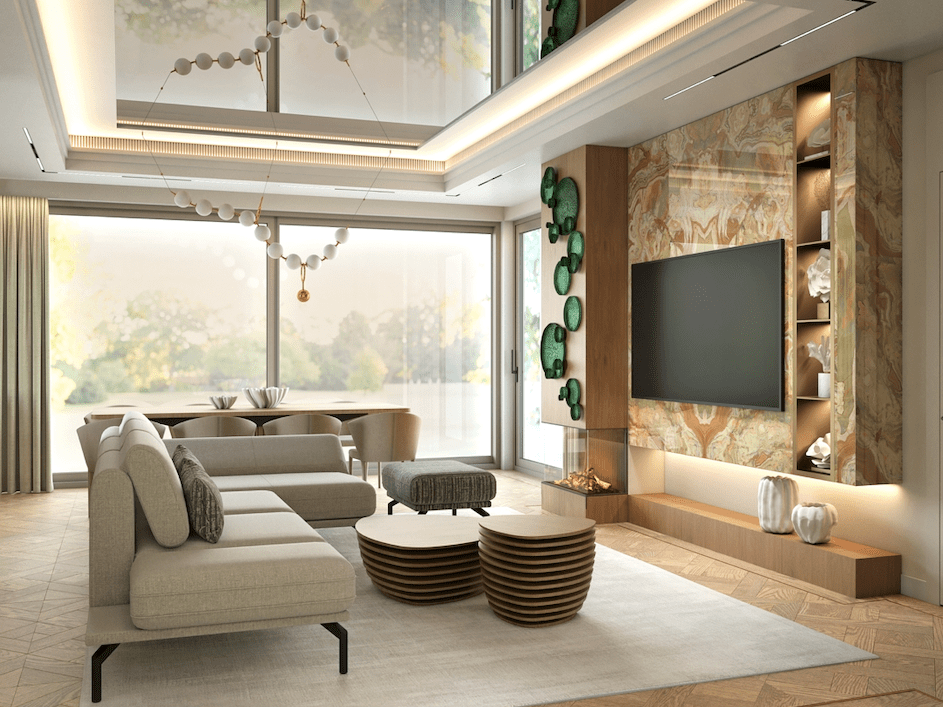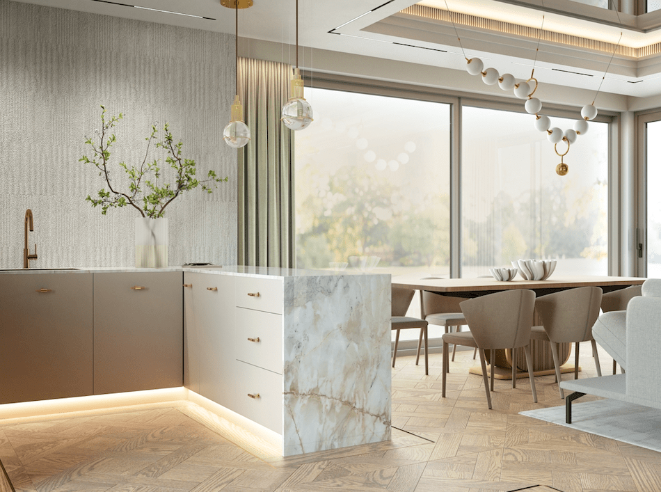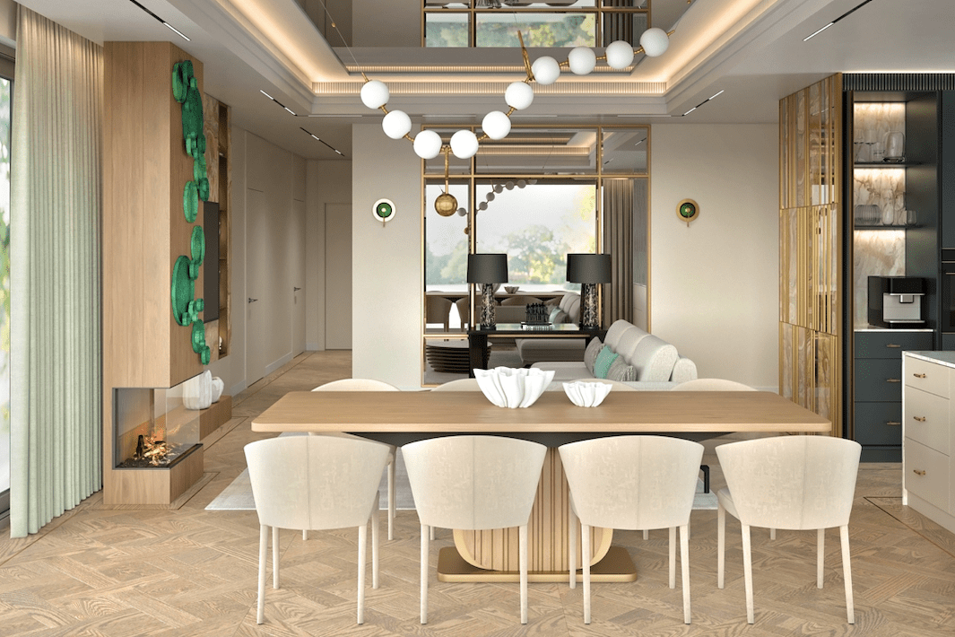 Salon stanowi reprezentacyjną część projektu, w której klasyczny styl pałacowy zyskuje świeże, współczesne oblicze. Płytki w odcieniach kamienia karmelowego wprowadzają ciepło i elegancję, a minimalistyczna zabudowa meblarska klasy premium nadaje przestrzeni wyrafinowanej prostoty. Całość dopełnia podłoga w niestandardowym układzie, która buduje indywidualny rytm wnętrza, tworząc wyjątkową atmosferę do codziennego życia i spotkań.