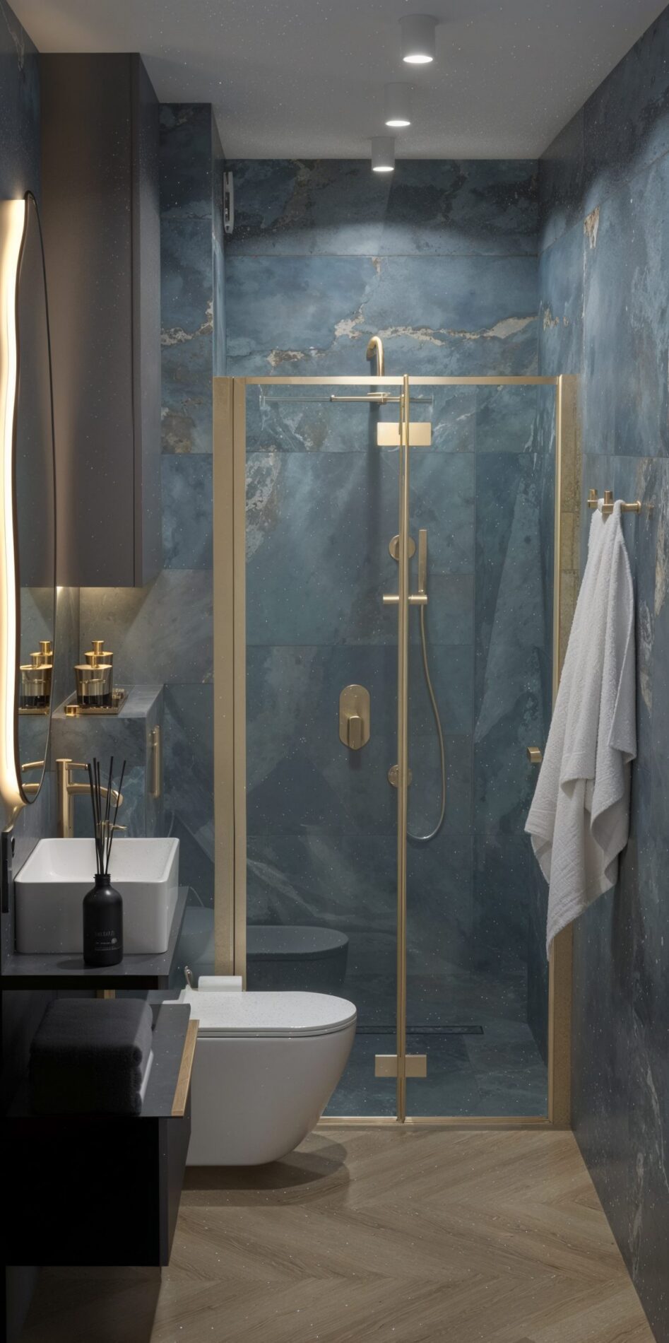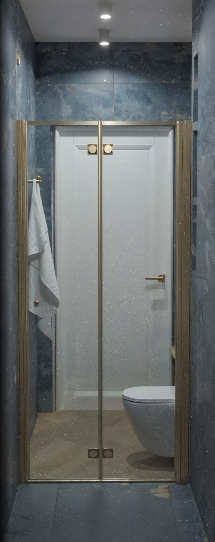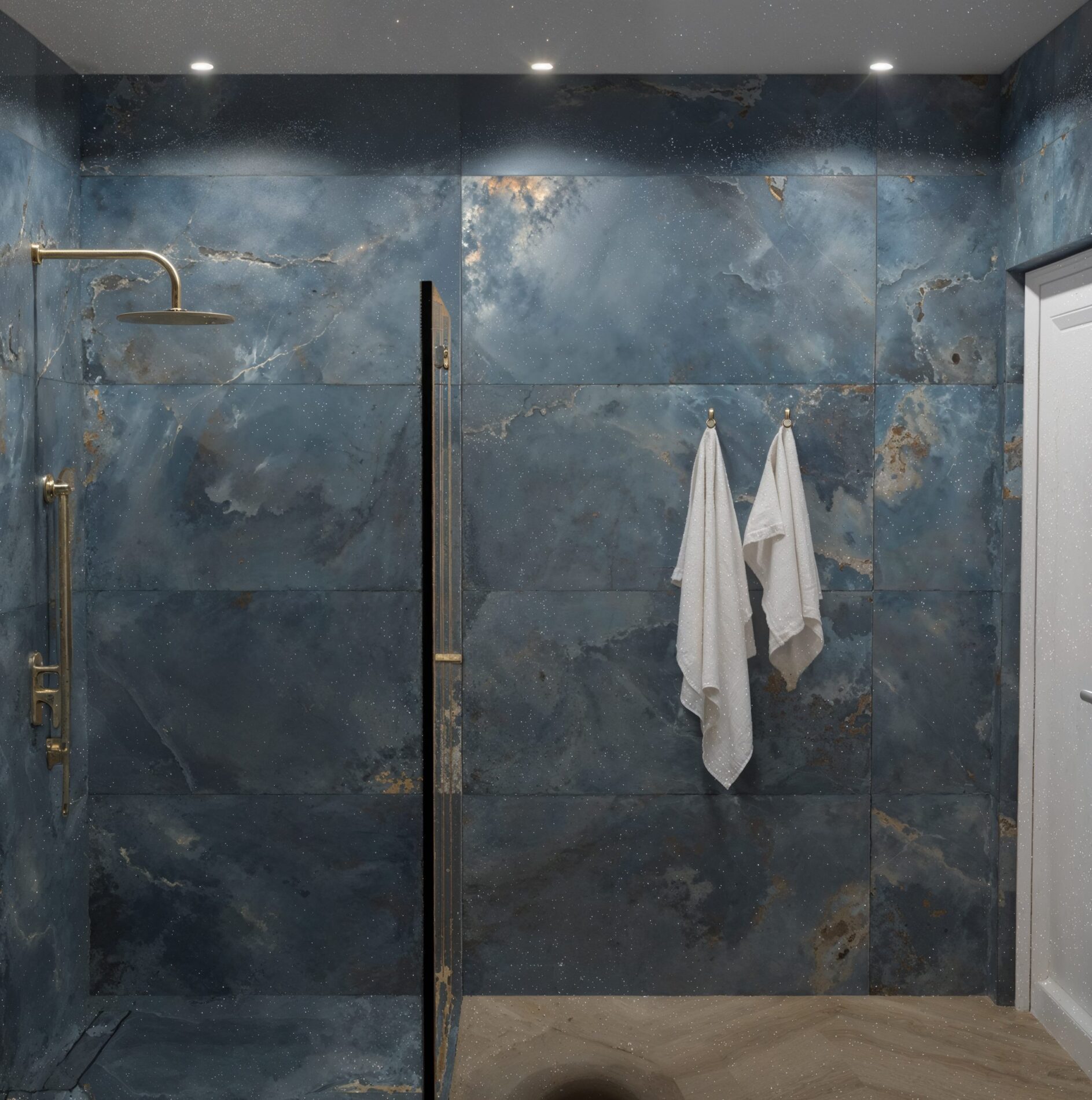 Projekt obejmuje dwie odmienne aranżacje, połączone wspólnym dbałością o detal. Pierwsza łazienka zachwyca głębokim odcieniem ciemnoniebieskich płytek z delikatnymi złotymi przetarciami, tworzącymi efekt oceanu, który dopełnia drewniana jodełka na podłodze. Druga to jasna, ciepła przestrzeń w tonacjach beżu i kremu, emanująca stonowaną elegancją i przytulnością.