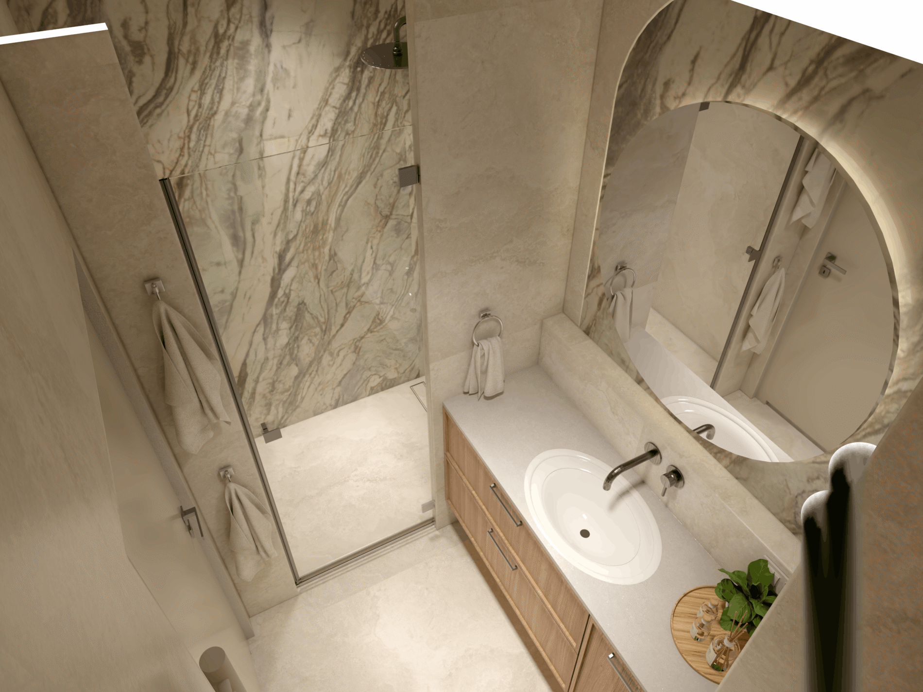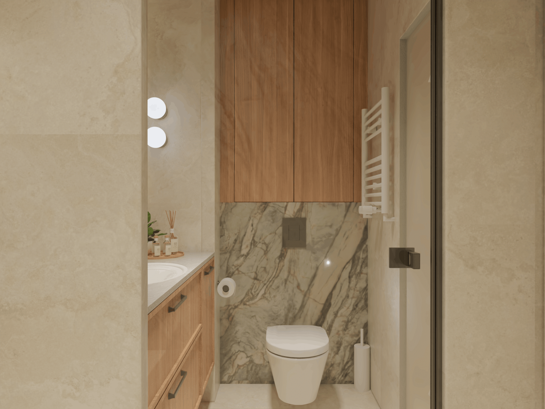 Łazienka została zaprojektowana w estetyce nowoczesnego minimalizmu z wyraźnym odniesieniem do naturalnych materiałów. Jasna, kamienna okładzina o subtelnym rysunku tworzy eleganckie tło dla ciepłej zabudowy drewnianej, nadając wnętrzu harmonijny i ponadczasowy charakter. Duże, okrągłe lustro optycznie powiększa przestrzeń i stanowi wyrazisty, a jednocześnie miękki akcent kompozycyjny.