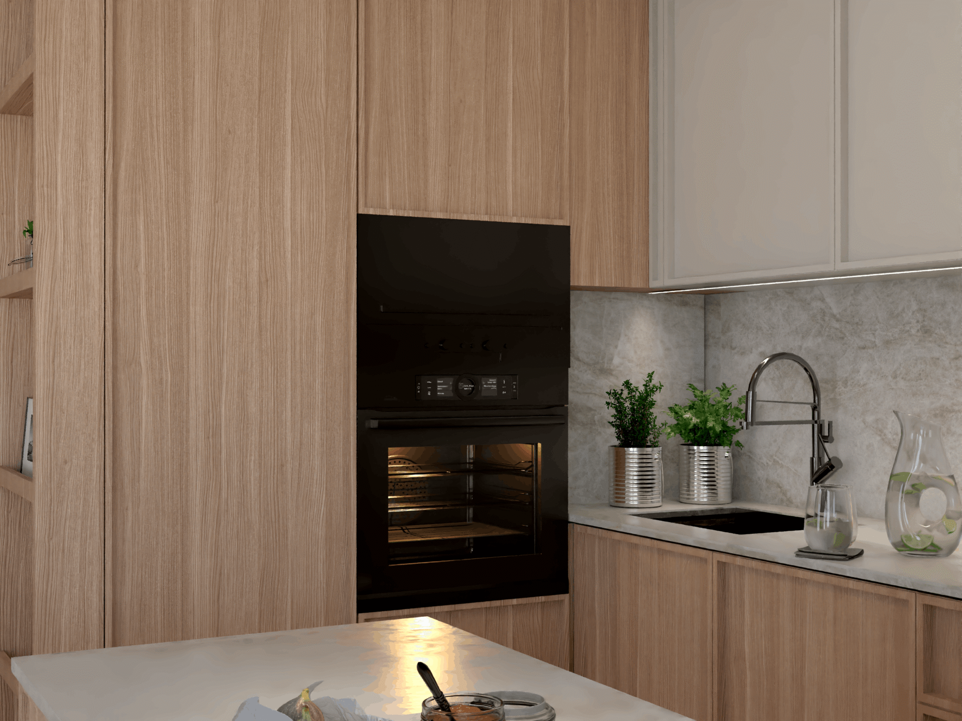 Starannie zaplanowane oświetlenie podszafkowe oraz liniowe akcenty świetlne podkreślają strukturę materiałów i zwiększają komfort użytkowania. Kuchnia płynnie łączy estetykę z ergonomią, tworząc ponadczasową przestrzeń do codziennego funkcjonowania.