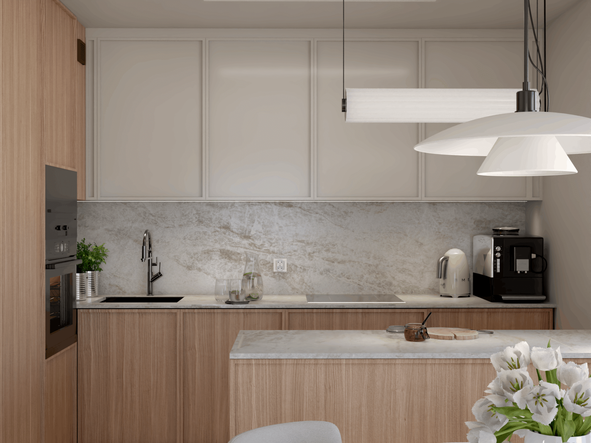 Kuchnia została zaprojektowana w duchu nowoczesnego minimalizmu, z naciskiem na funkcjonalność i naturalne materiały. Zabudowa meblowa w ciepłym odcieniu drewna tworzy spójną, elegancką bryłę, która porządkuje przestrzeń i ukrywa sprzęty AGD, podkreślając czystość formy. Jasny blat oraz kamienna okładzina ścienna wprowadzają wizualną lekkość i równoważą ciepło drewna.