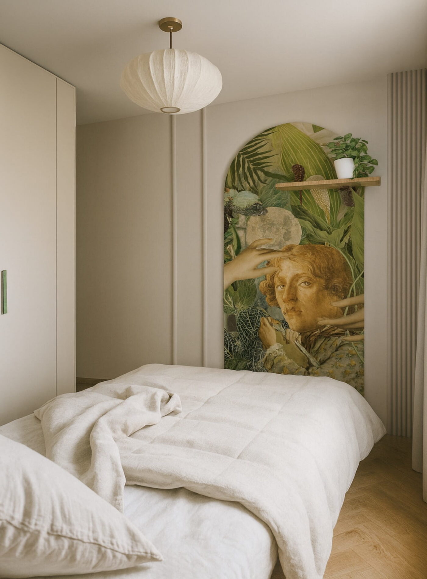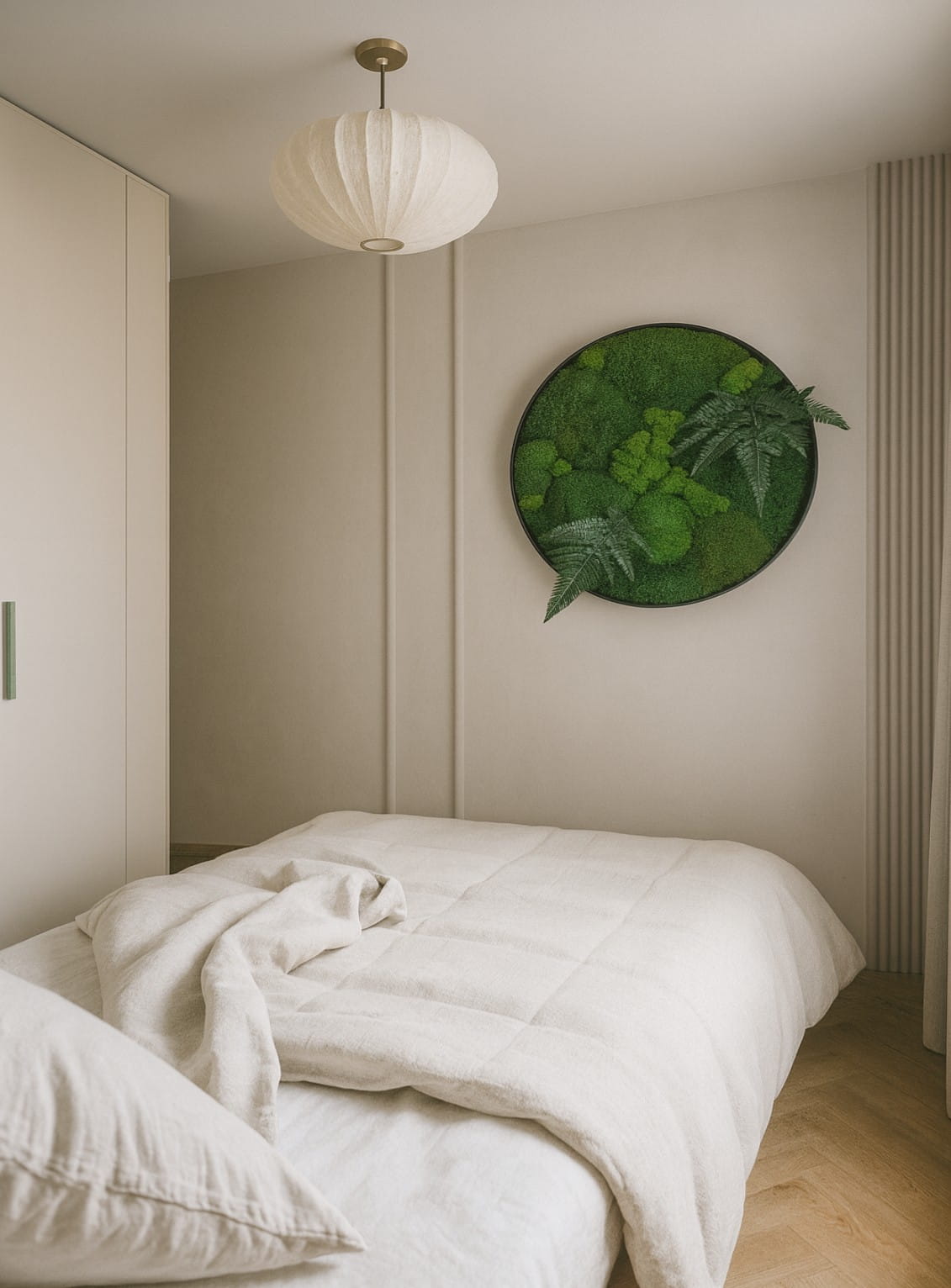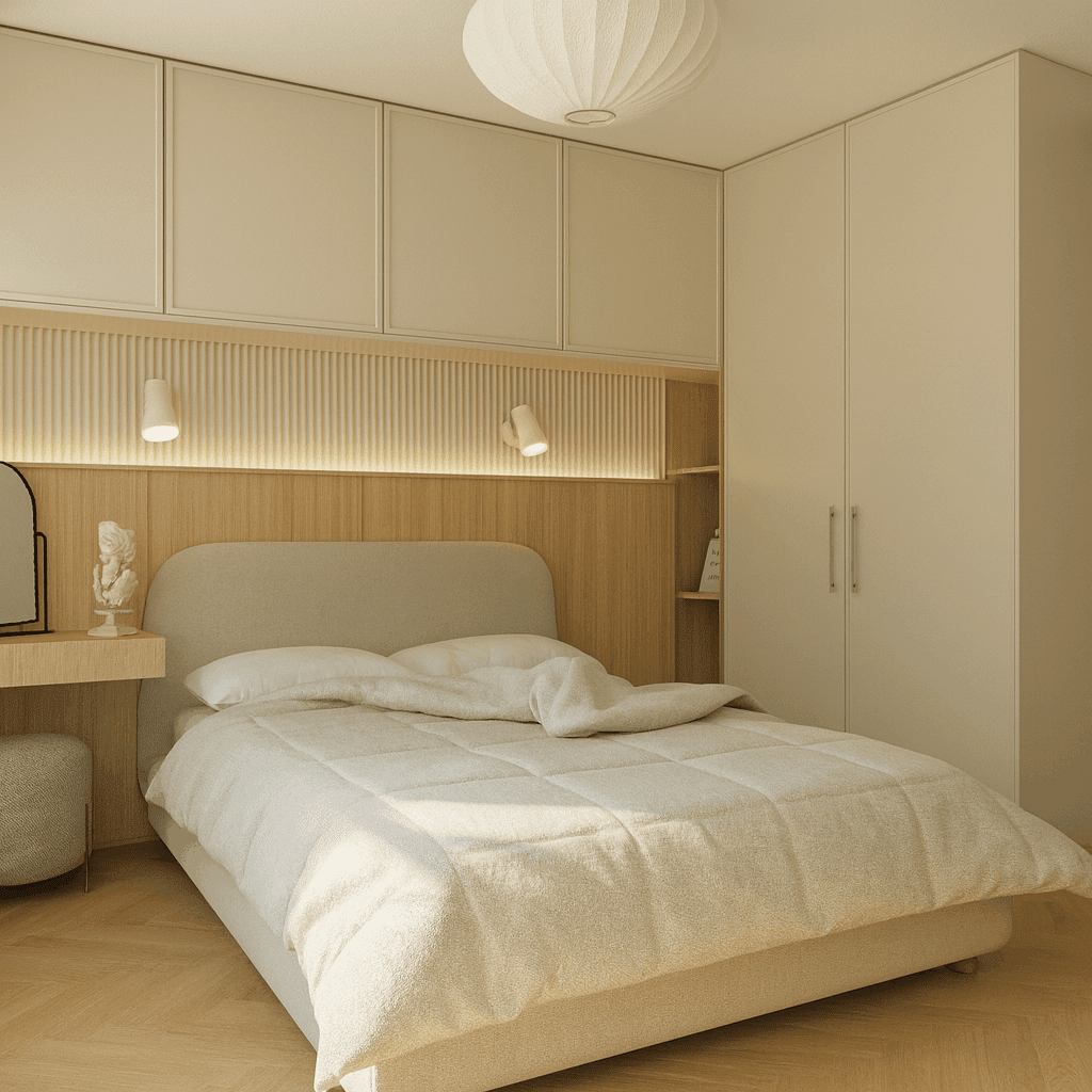 Sypialnia została zaprojektowana jako jasna, przytulna przestrzeń sprzyjająca wyciszeniu i odpoczynkowi. Zabudowa ściany za łóżkiem, łącząca ciepłe drewno z delikatnymi, pionowymi strukturami, porządkuje wnętrze i nadaje mu elegancki, spójny charakter. Tapicerowane łóżko oraz miękkie tkaniny podkreślają komfortową funkcję pomieszczenia.
