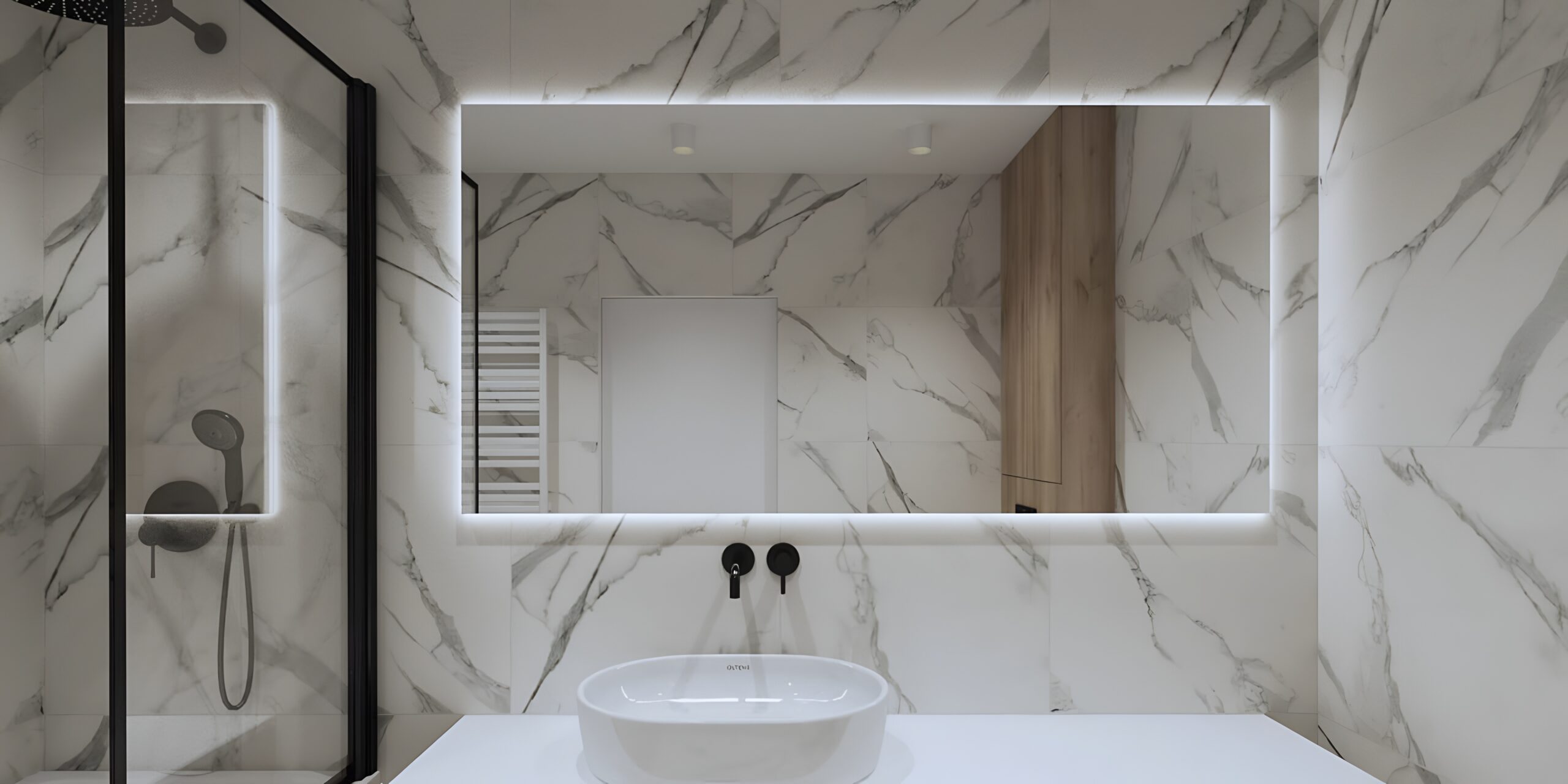 Łazienka łączy stonowaną paletę szarości z naturalnym akcentem drewna, ułożonym w klasyczną jodełkę na ścianach. Czarna armatura podkreśla nowoczesny charakter wnętrza, a harmonijne zestawienie materiałów nadaje przestrzeni wyrafinowanego stylu. To miejsce, w którym funkcjonalność spotyka się z eleganckim minimalizmem, tworząc przyjazną i stylową strefę codziennej pielęgnacji.