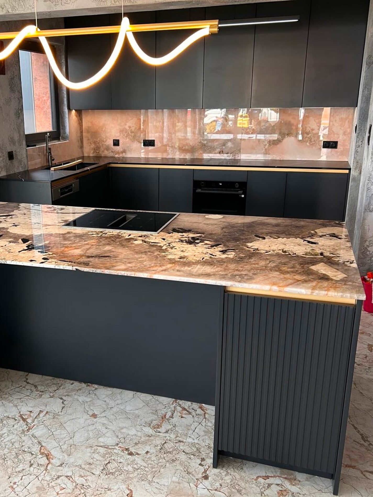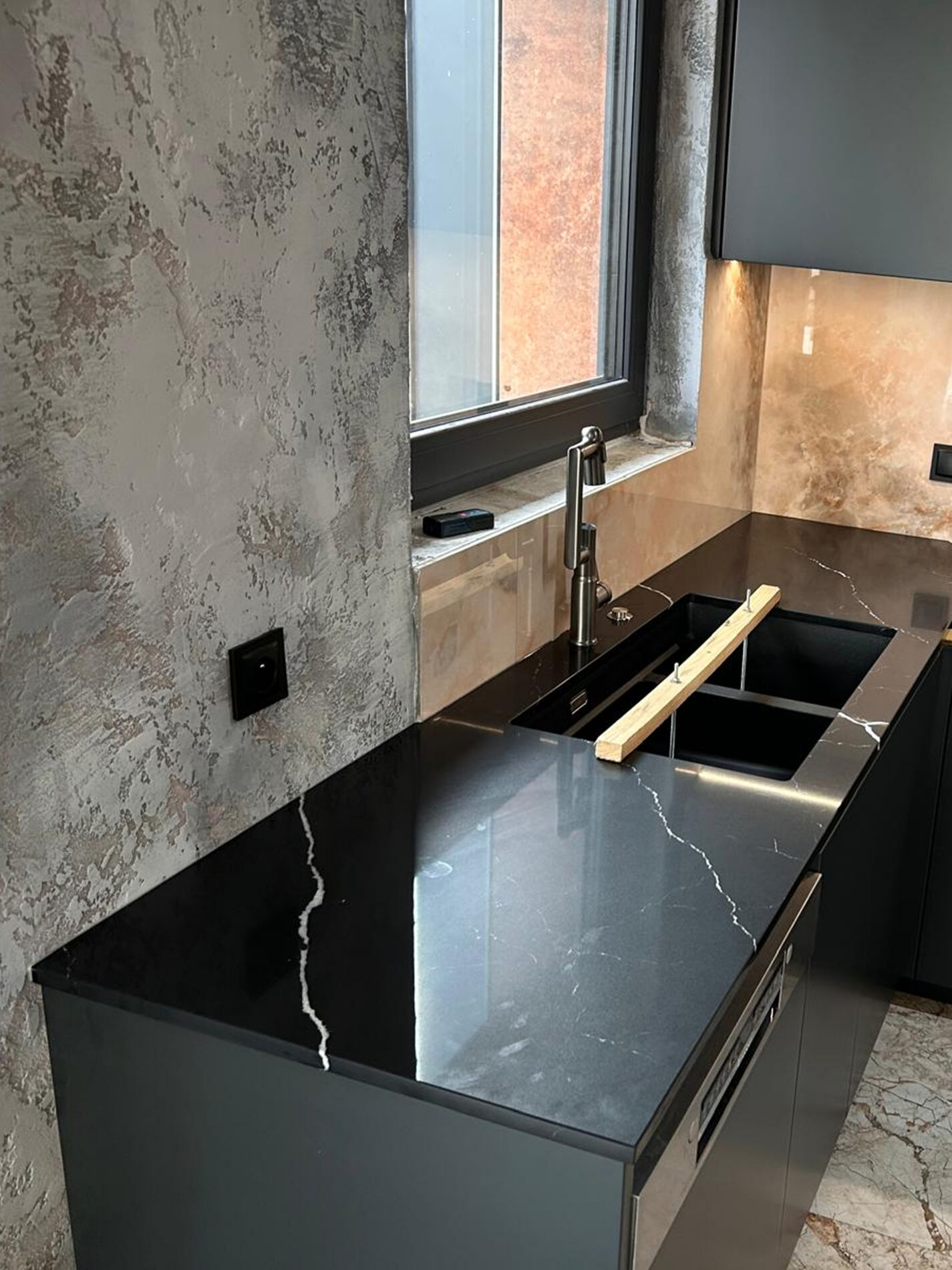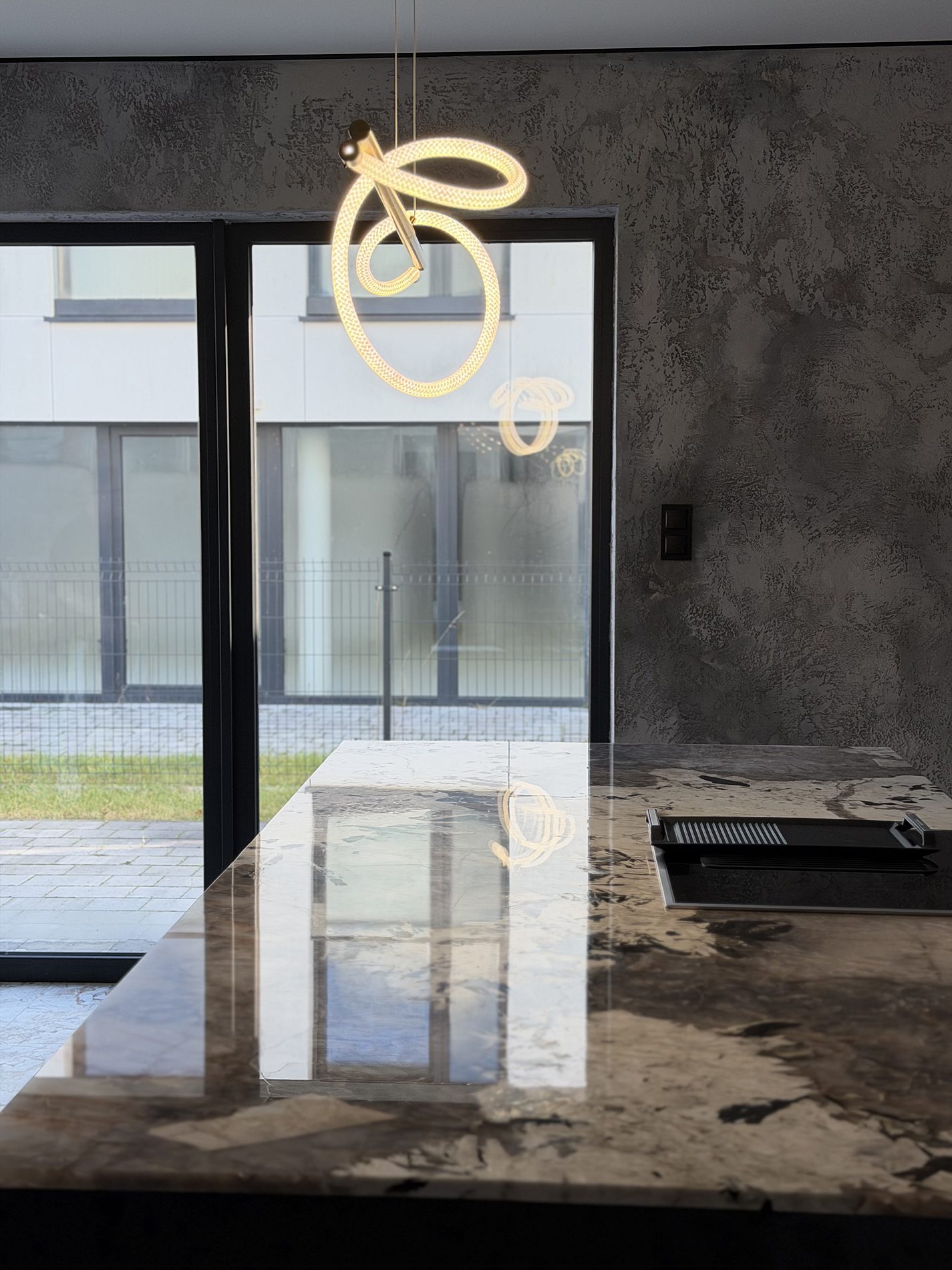 Cekolowanie i malowanie ścian oraz sufitów, układanie paneli podłogowych w całym mieszkaniu, układanie płytek podłogowych w łazience i kuchni, położenie gresu na ścianach w kuchni, montaż drzwi wewnętrznych, montaż armatury sanitarnej, montaż listew, wykonanie tynków dekoracyjnych przypodłogowych, montaż oświetlenia głównego, montaż kontaktów i włączników. Wykonano oraz zamontowano elementy ryflowane w wyspie kuchennej. Zrealizowano montaż blatów kamiennych, w tym podcięcia pod płytę grzewczą, zlew i okap