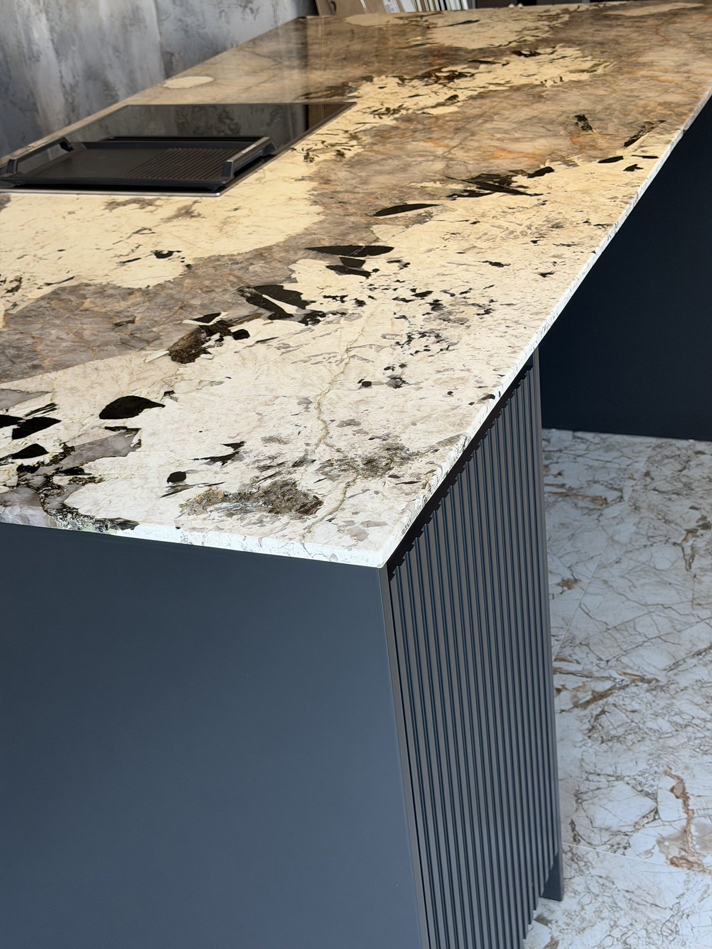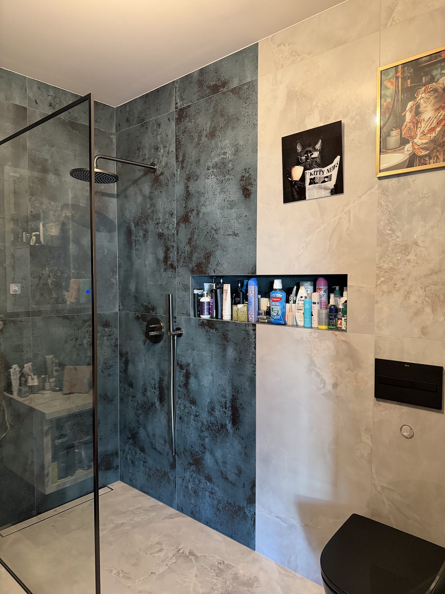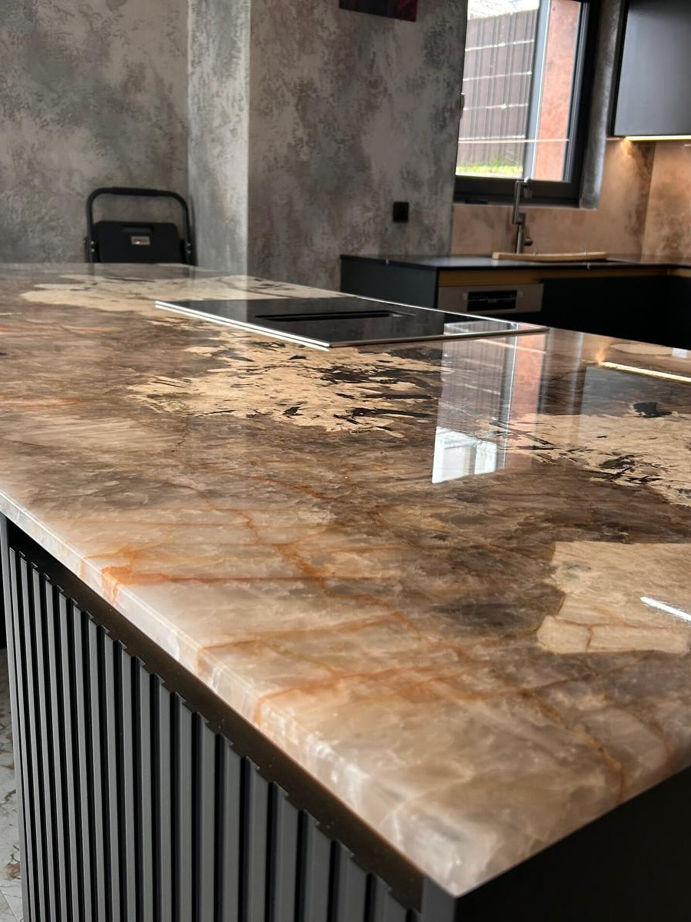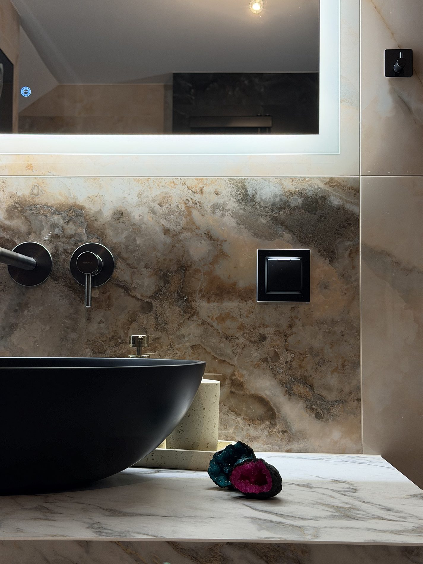 Cekolowanie i malowanie ścian oraz sufitów, układanie paneli podłogowych w całym mieszkaniu, układanie płytek podłogowych w łazience i kuchni, położenie gresu na ścianach w kuchni, montaż drzwi wewnętrznych, montaż armatury sanitarnej, montaż listew, wykonanie tynków dekoracyjnych przypodłogowych, montaż oświetlenia głównego, montaż kontaktów i włączników. Wykonano oraz zamontowano elementy ryflowane w wyspie kuchennej. Zrealizowano montaż blatów kamiennych, w tym podcięcia pod płytę grzewczą, zlew i okap