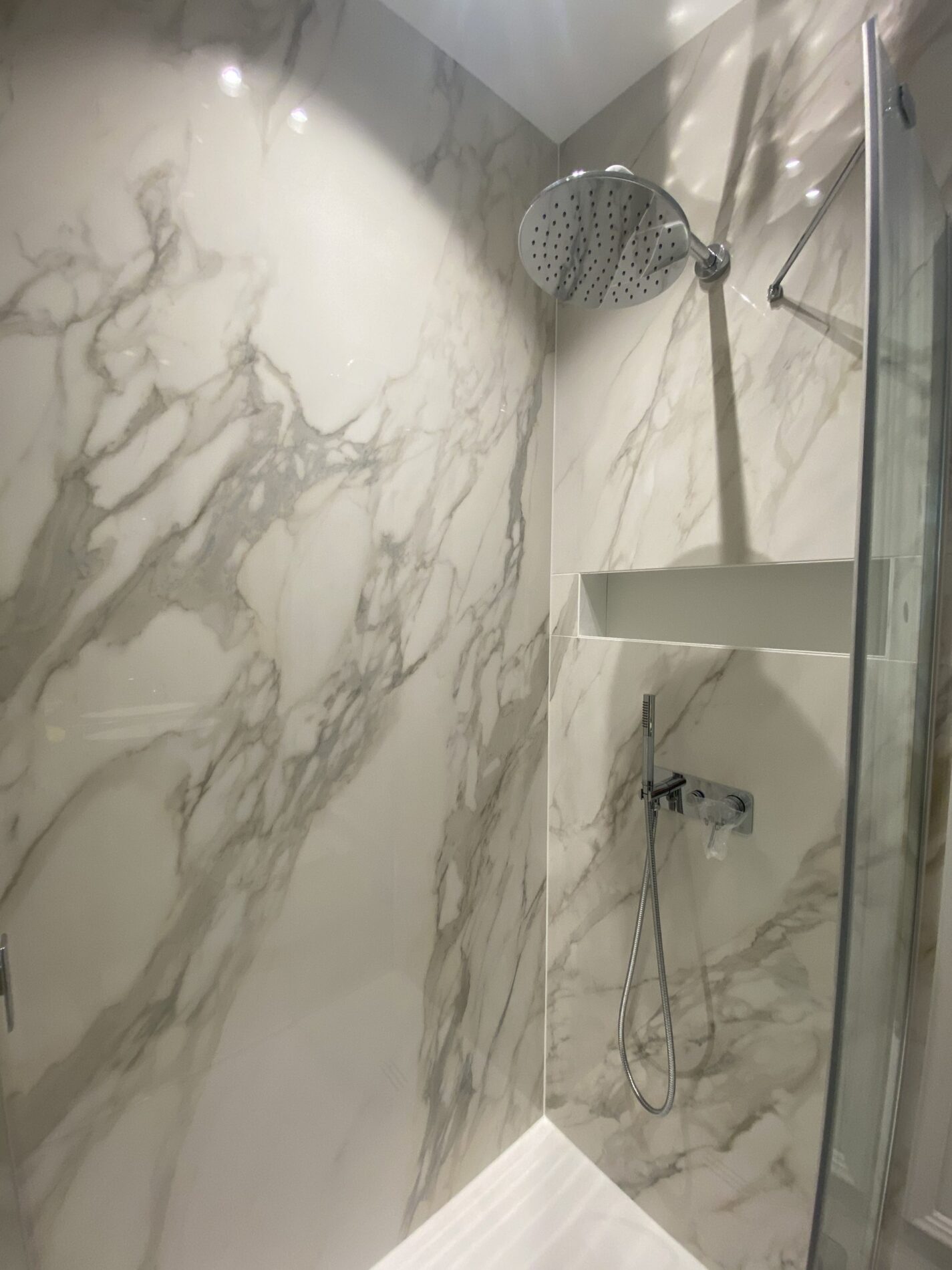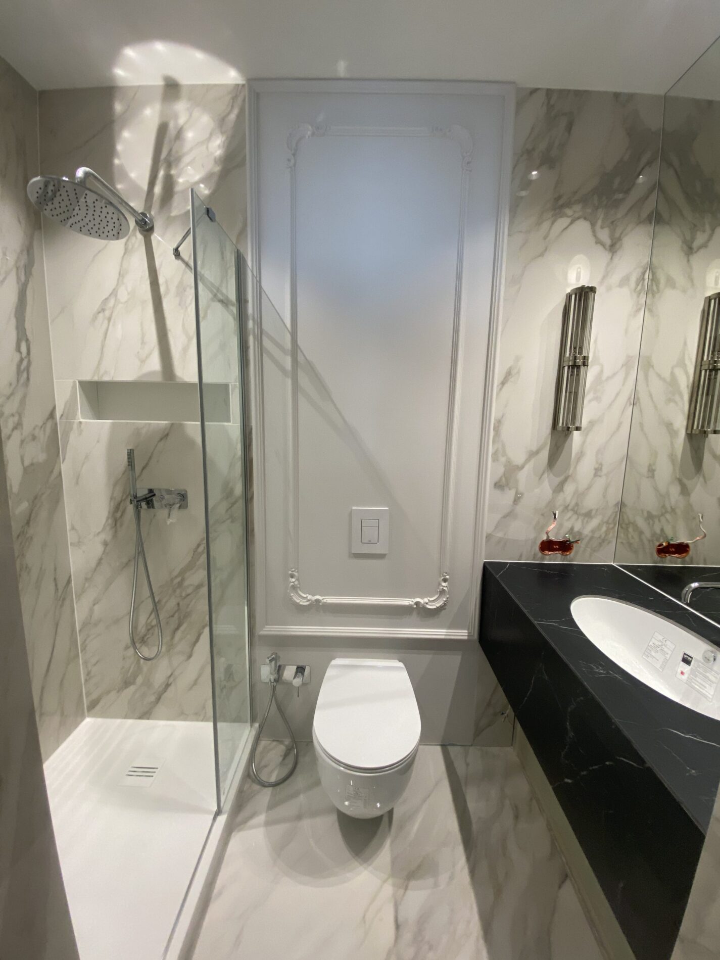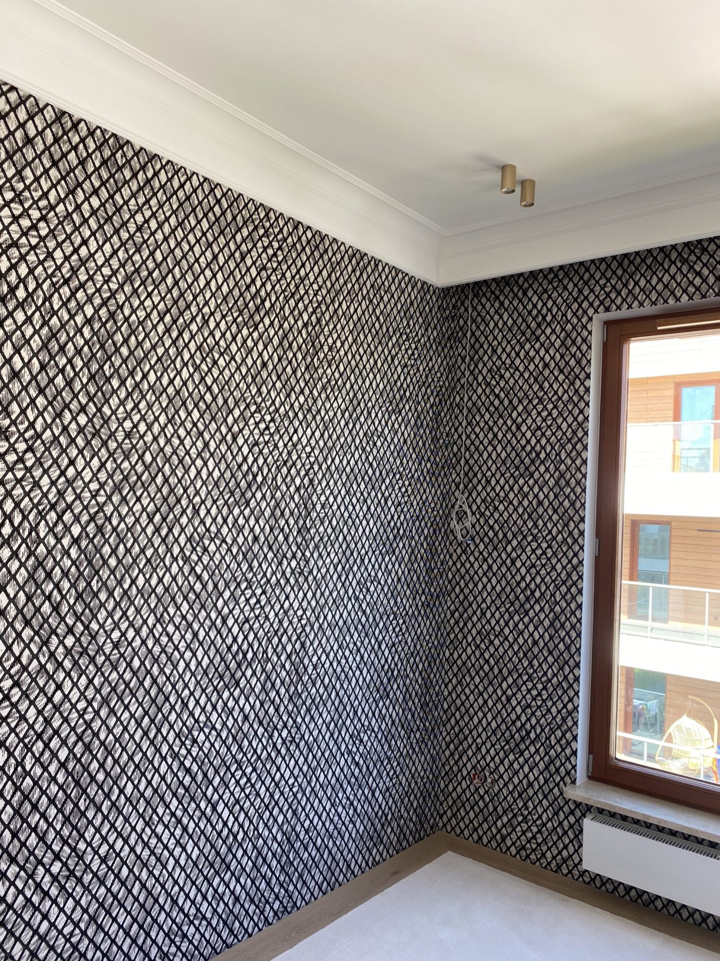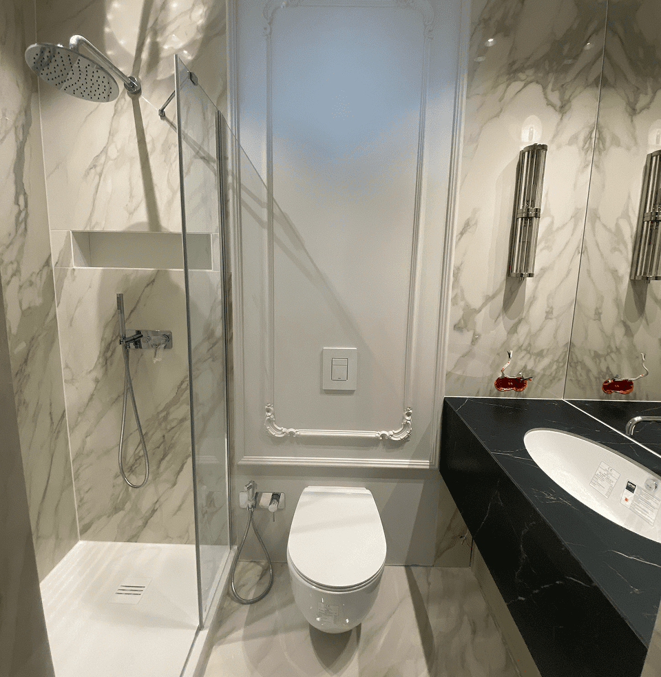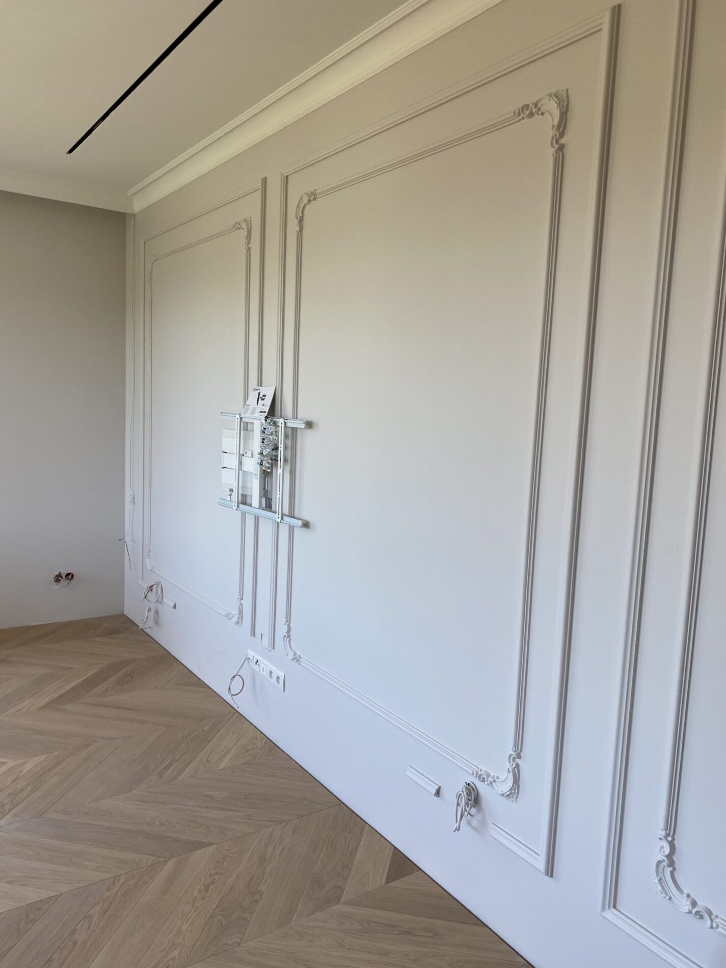 Wykonanie pełnego cekolowania i malowania ścian farbami klasy premium, układanie dębowej deski podłogowej w jodełkę francuską, montaż drzwi wewnętrznych ukrytych z opaską zlicowaną ze ścianą, montaż sztukaterii ściennej i sufitowej w stylistyce modern classic, układanie gresów wielkoformatowych 120×280 z przycinaniem na ścianach i podłodze w łazience, wykonanie tapety materiałowej na ścianie.