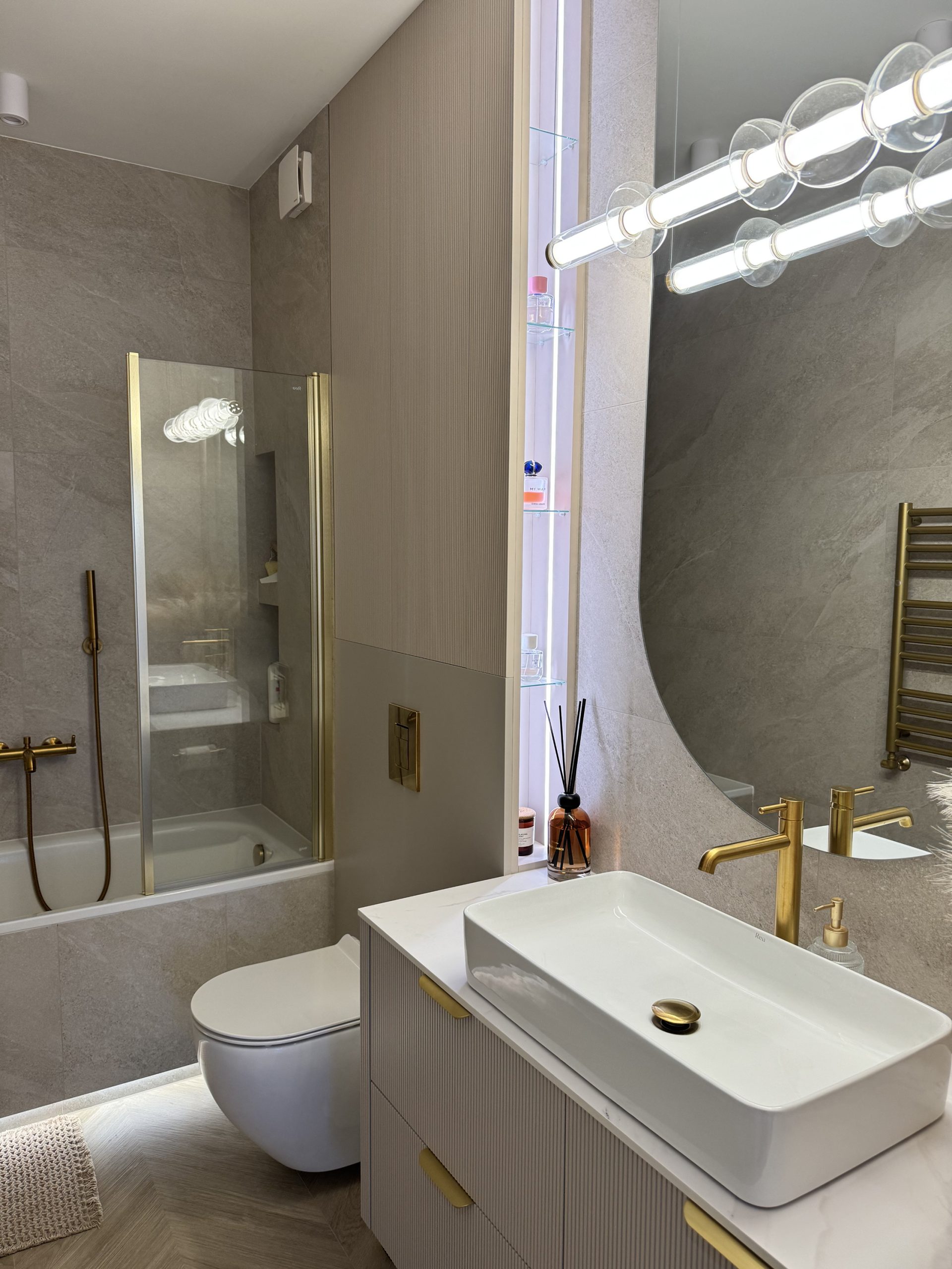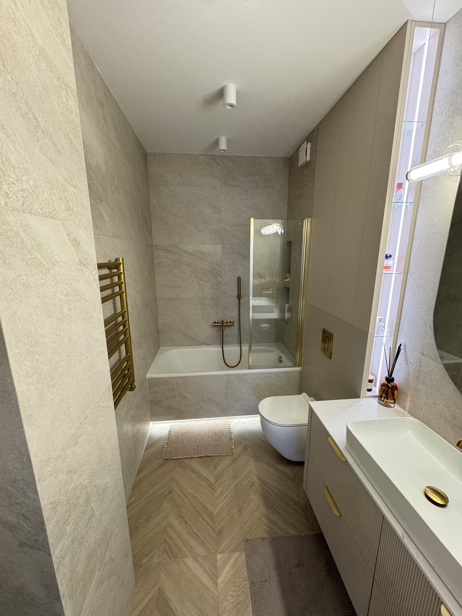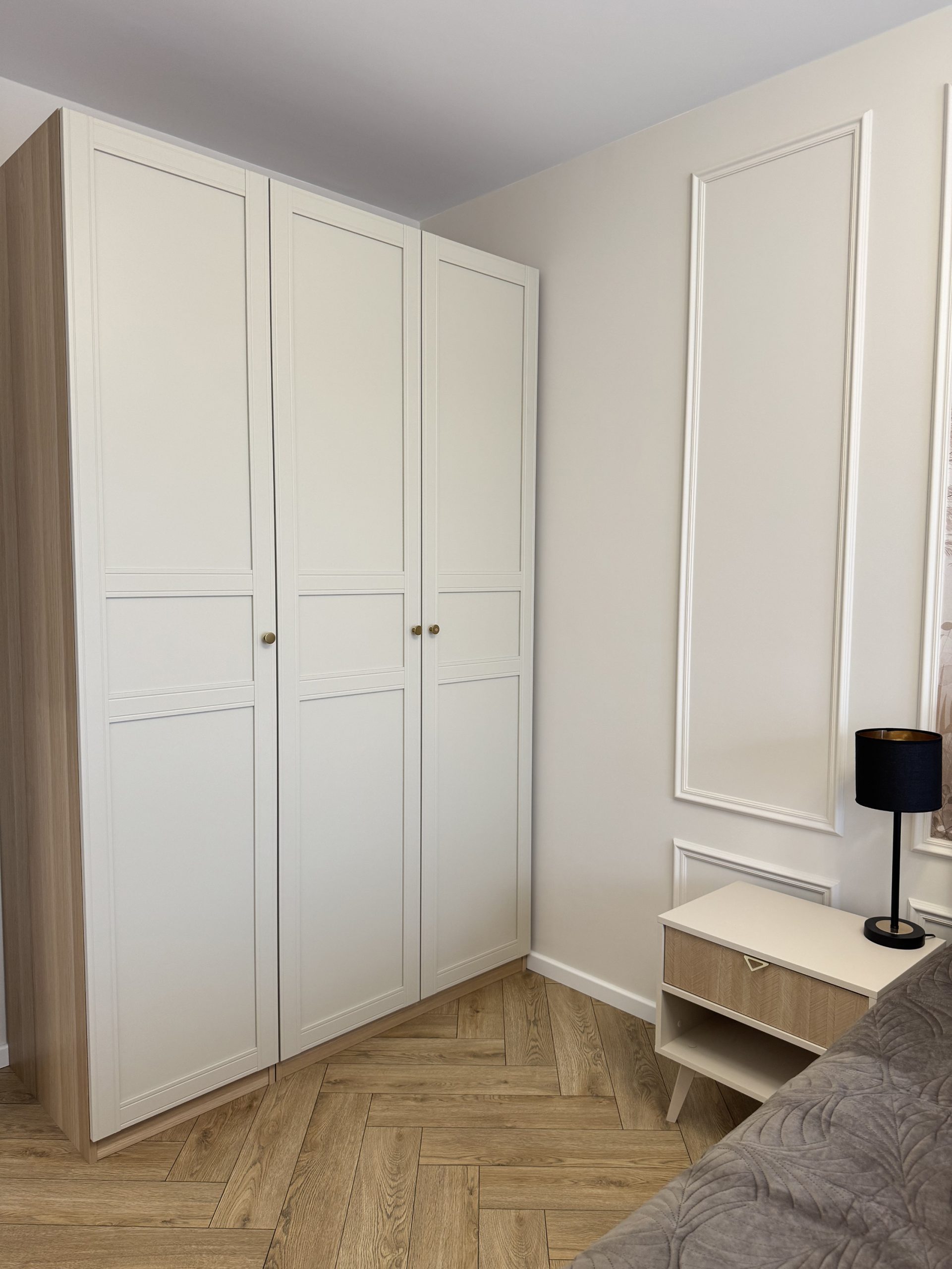 Cekolowanie i malowanie ścian oraz sufitów, układanie paneli podłogowych w całym mieszkaniu, układanie płytek podłogowych w łazience i kuchni, położenie gresu na ścianach w kuchni, montaż drzwi wewnętrznych, montaż armatury sanitarnej, montaż listew przypodłogowych, montaż oświetlenia głównego, montaż kontaktów i włączników.
