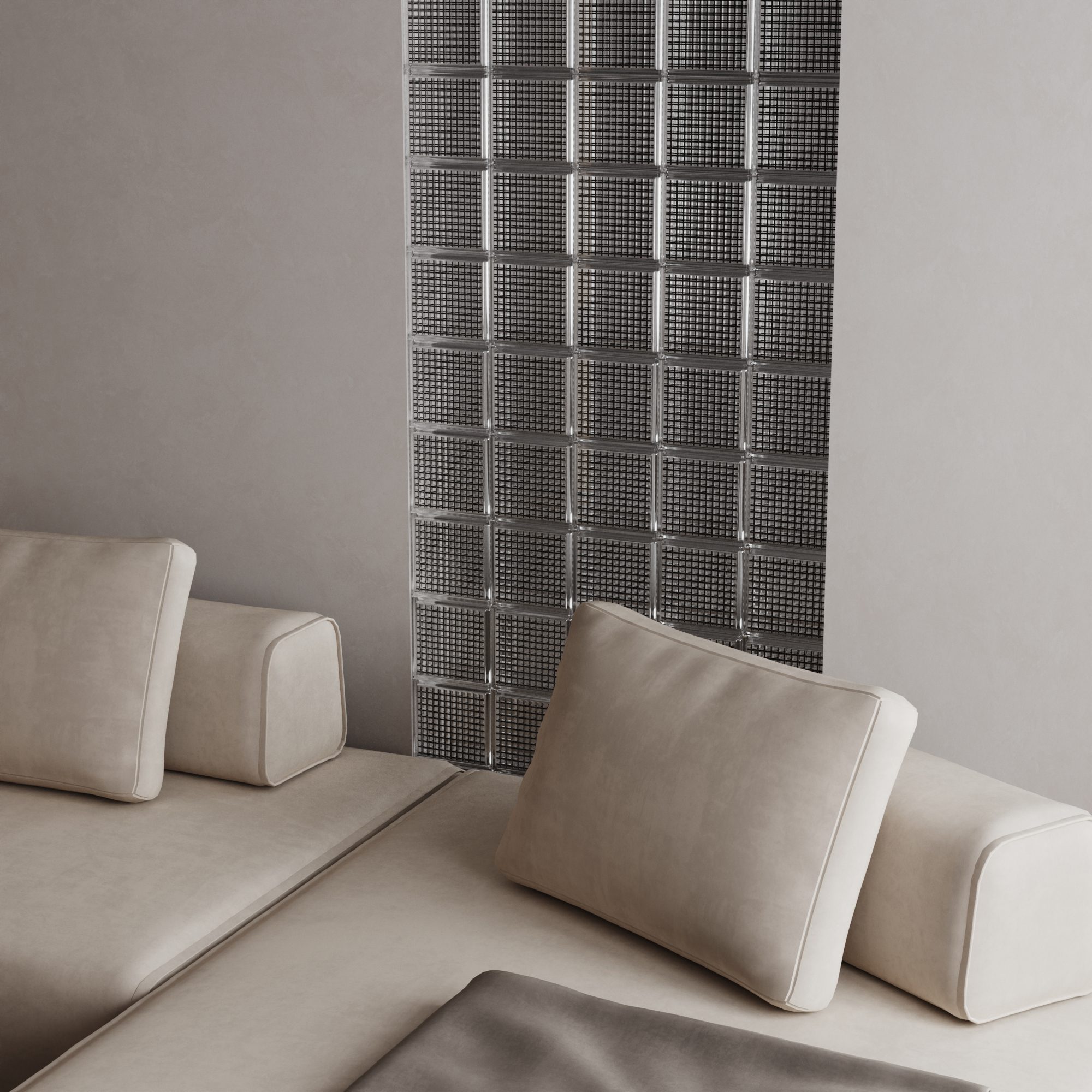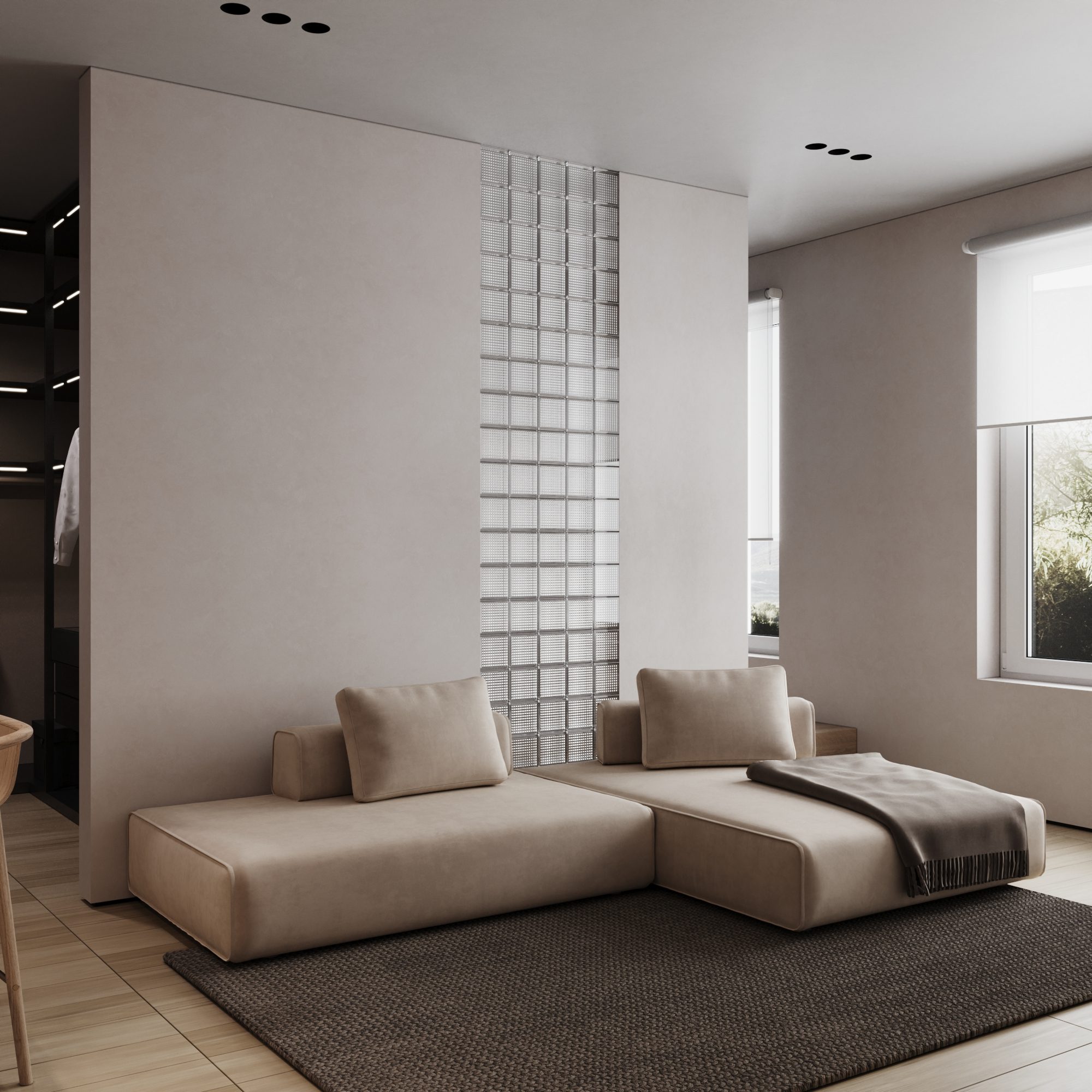 Przestrzeń dzienna zaprojektowana została w duchu nowoczesnej elegancji, gdzie minimalizm łączy się z komfortem. Centralnym elementem wnętrza jest modułowa sofa o geometrycznych liniach, której szerokie siedziska sprzyjają swobodnemu odpoczynkowi. Towarzyszy jej subtelna ściana z luksferów, wprowadzająca naturalne światło i nadająca aranżacji lekkości. Podłoga z naturalnego drewna zestawiona z ciemnym dywanem w strukturze plecionki ociepla wnętrze i podkreśla jego spójny charakter. Całość uzupełniają proste rolety oraz punktowe oświetlenie, które nadają przestrzeni harmonii i wysublimowanego klimatu.