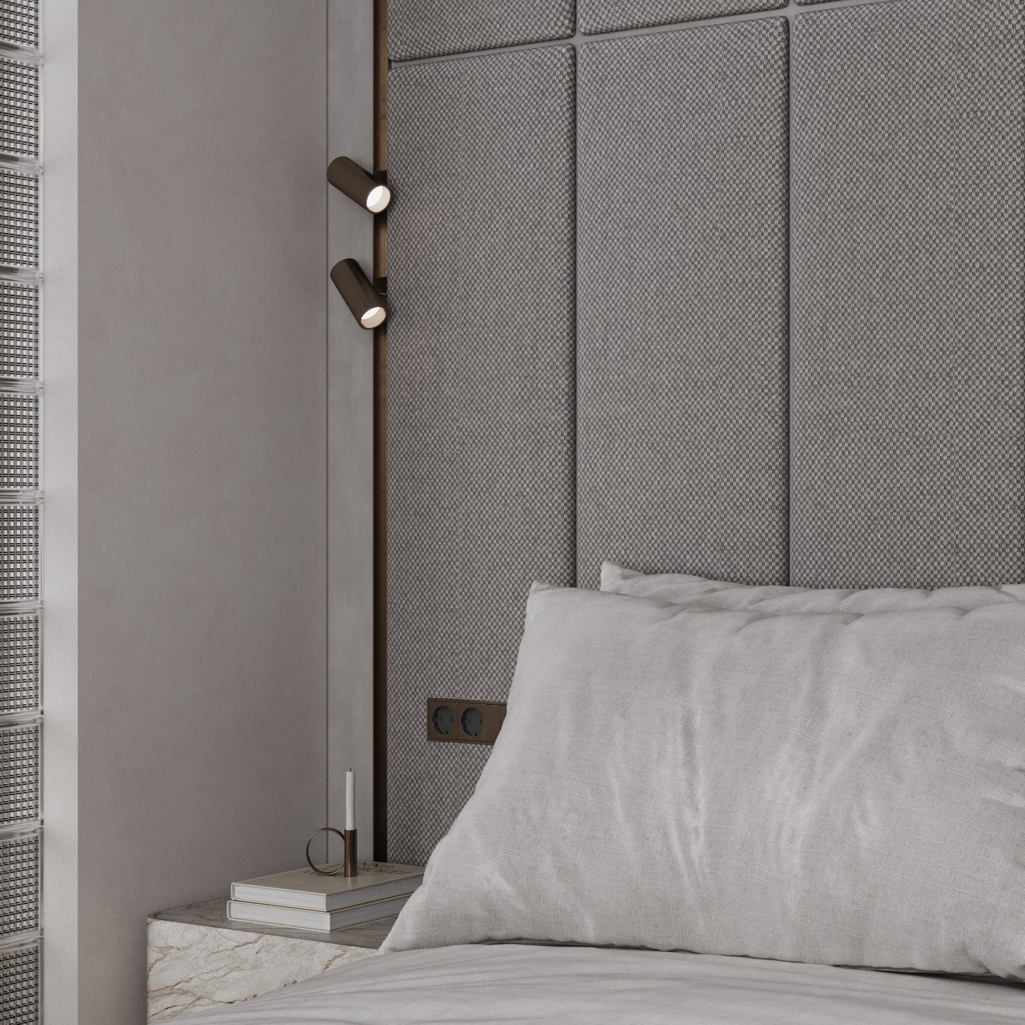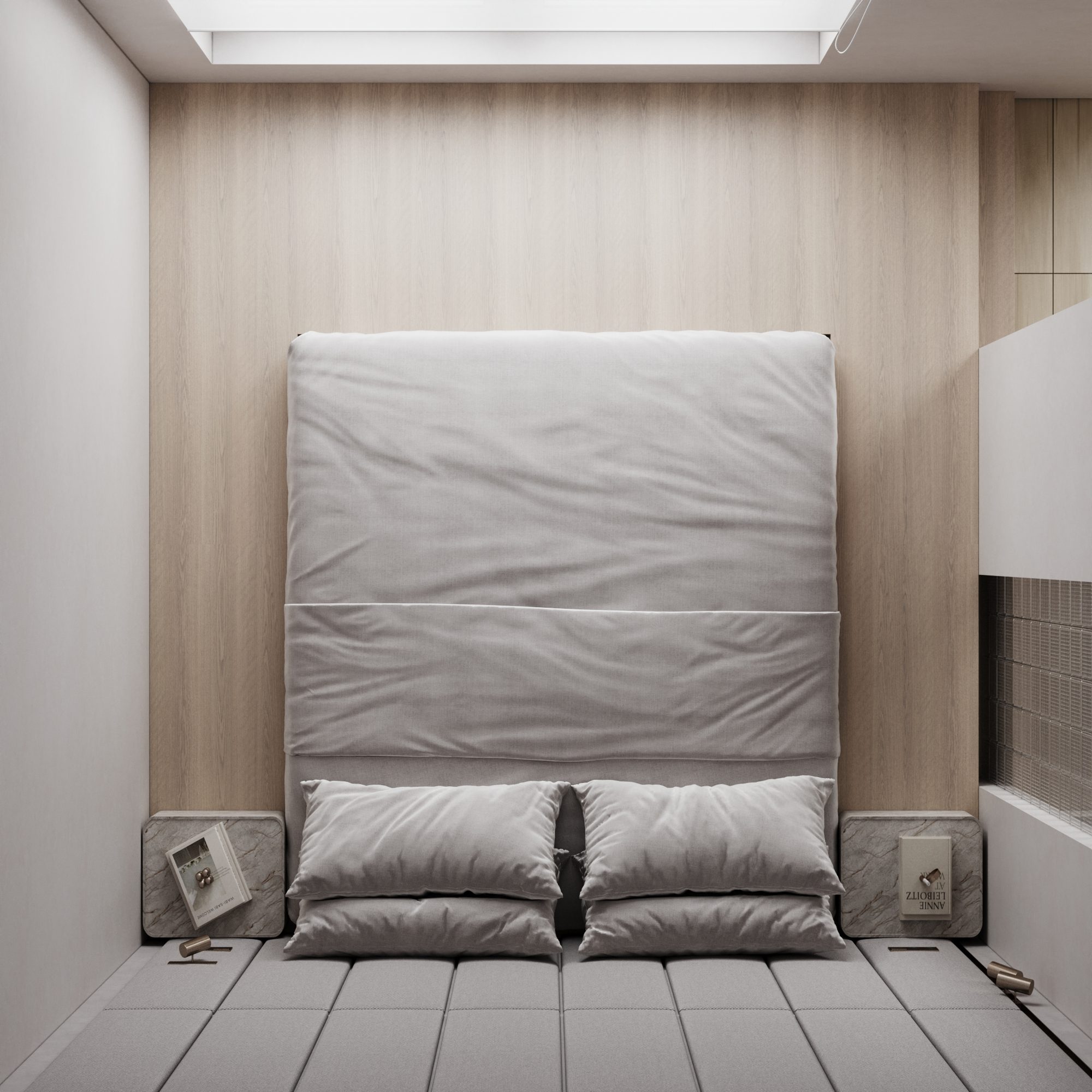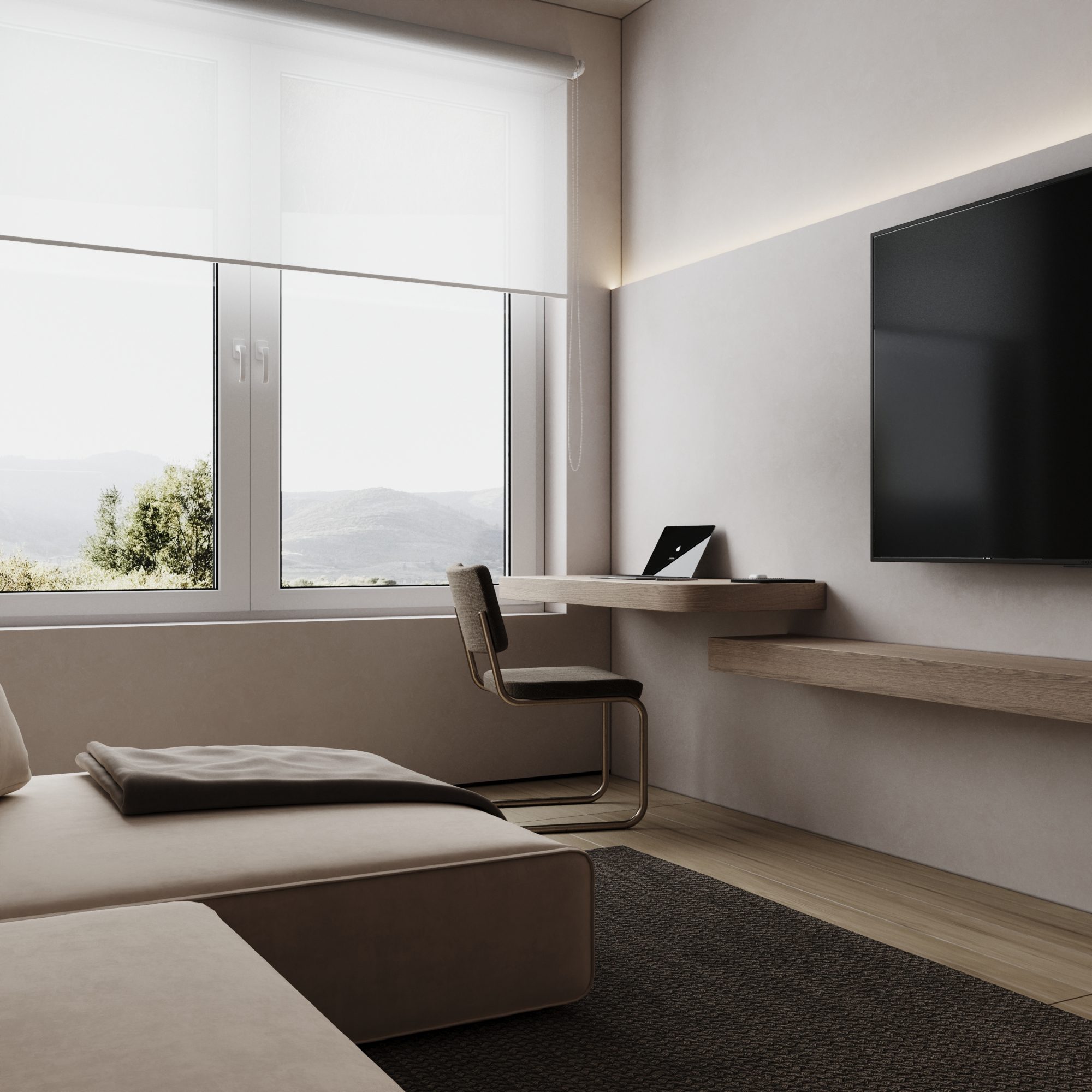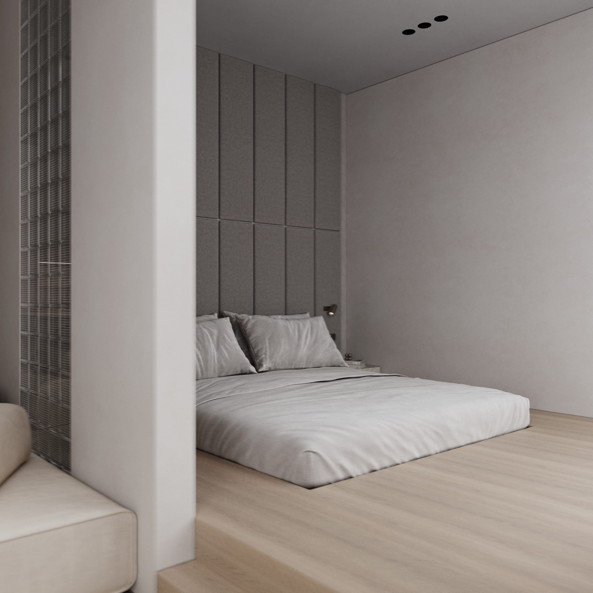 Sypialnia utrzymana jest w tonacji stonowanych barw, które sprzyjają wyciszeniu i relaksowi. Beżowe odcienie zestawione z miękkimi tkaninami i prostymi formami mebli tworzą atmosferę spokoju i harmonii. Centralnym punktem aranżacji pozostaje łóżko o szerokim, wygodnym zagłówku, które nadaje wnętrzu charakteru i elegancji. Naturalna podłoga drewniana ociepla przestrzeń, a delikatne światło zarówno naturalne, jak i punktowe buduje przytulny nastrój. Dyskretne detale w formie rolet i subtelnych dodatków sprawiają, że sypialnia staje się miejscem odpoczynku, w którym minimalizm przeradza się w komfort.
