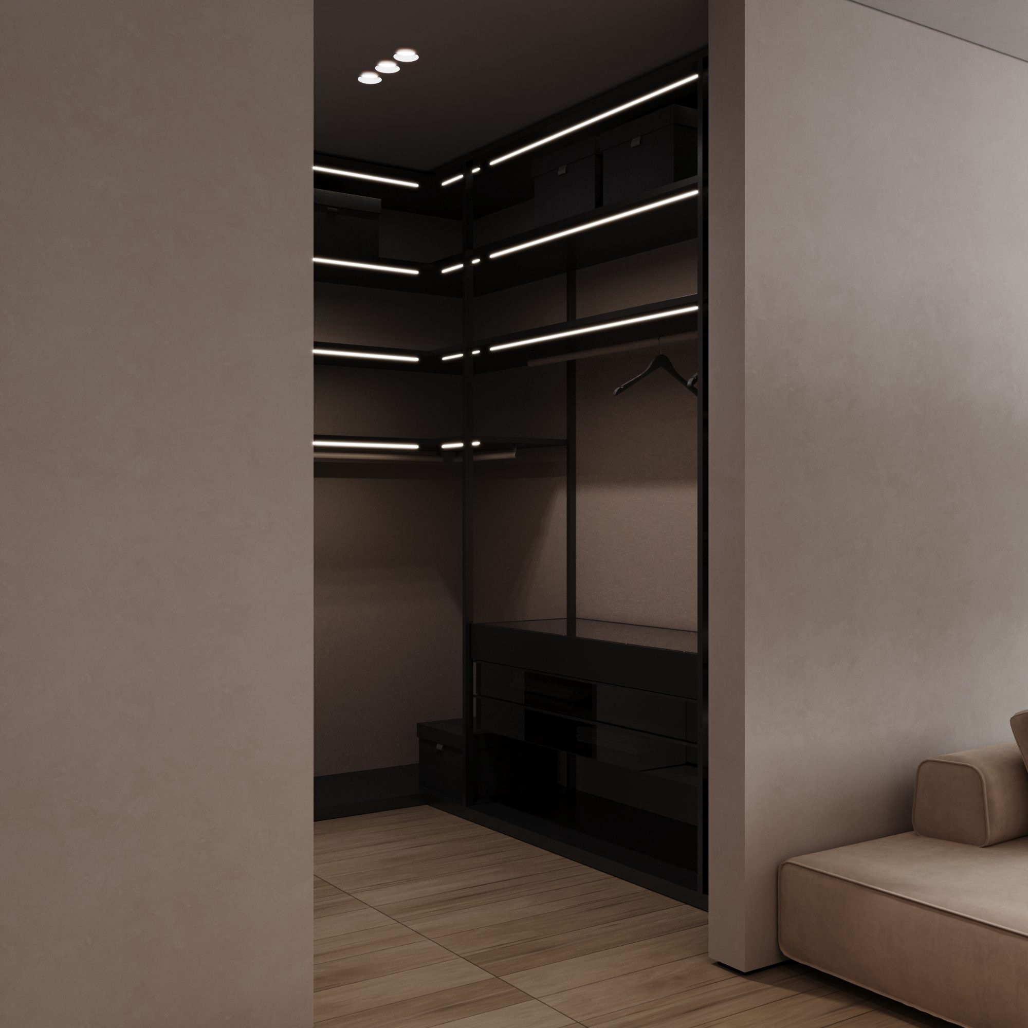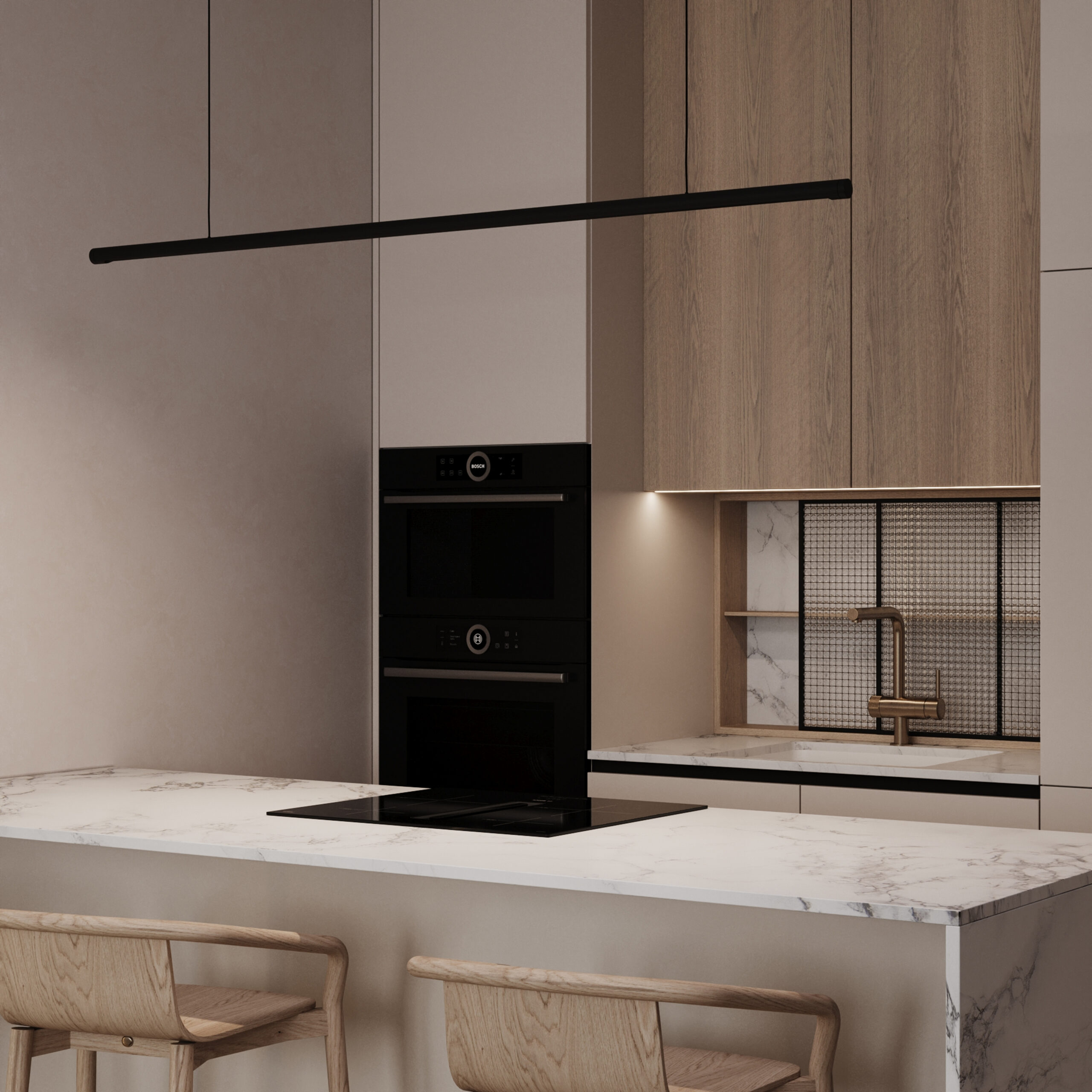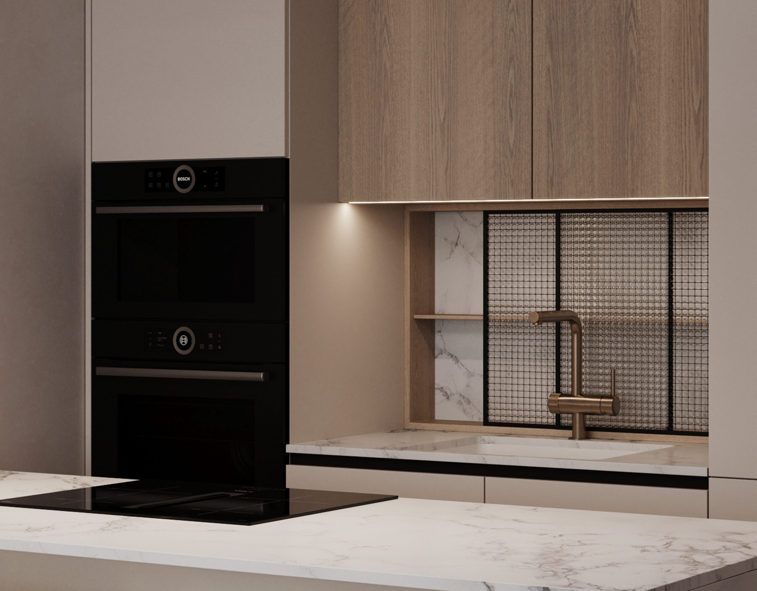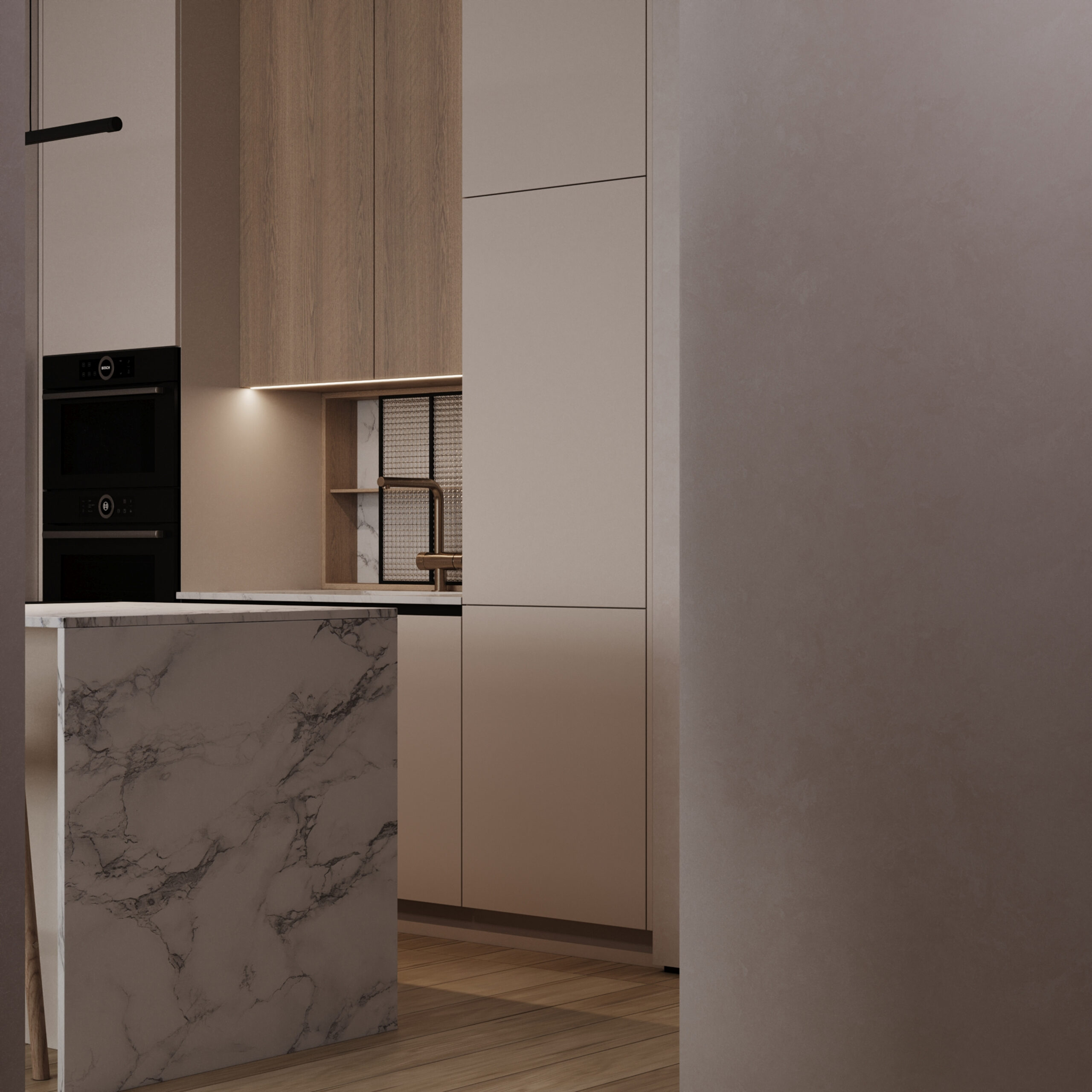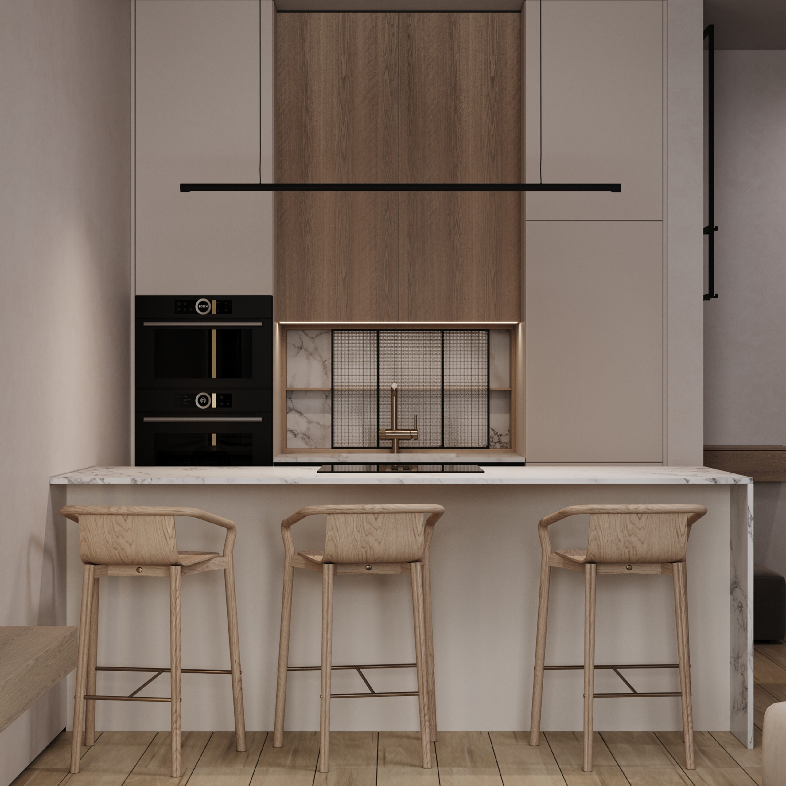 Kuchnia została zaprojektowana w oparciu o zasadę czystych linii i subtelnych kontrastów. Neutralne beże i jasne fronty mebli tworzą tło dla eleganckich akcentów w postaci ciemnych elementów wykończenia. Powierzchnie robocze zostały utrzymane w minimalistycznym charakterze, dzięki czemu wnętrze emanuje porządkiem i funkcjonalnością. Naturalne drewno podłogi nadaje całości przytulności, a odpowiednio rozmieszczone oświetlenie punktowe podkreśla detale i eksponuje nowoczesny charakter aranżacji. To przestrzeń, w której prostota łączy się z elegancją, a codzienność nabiera wyrafinowanej formy.
