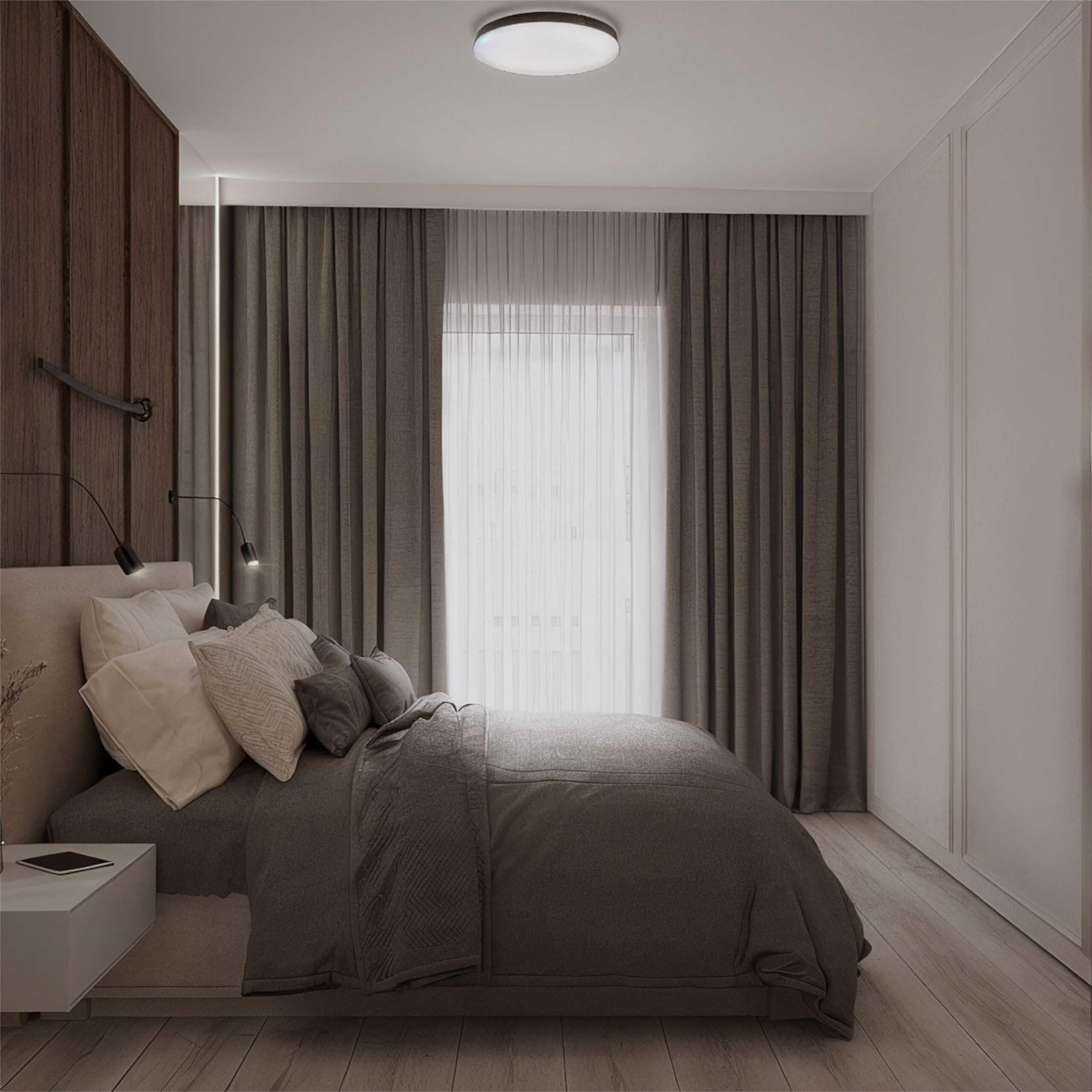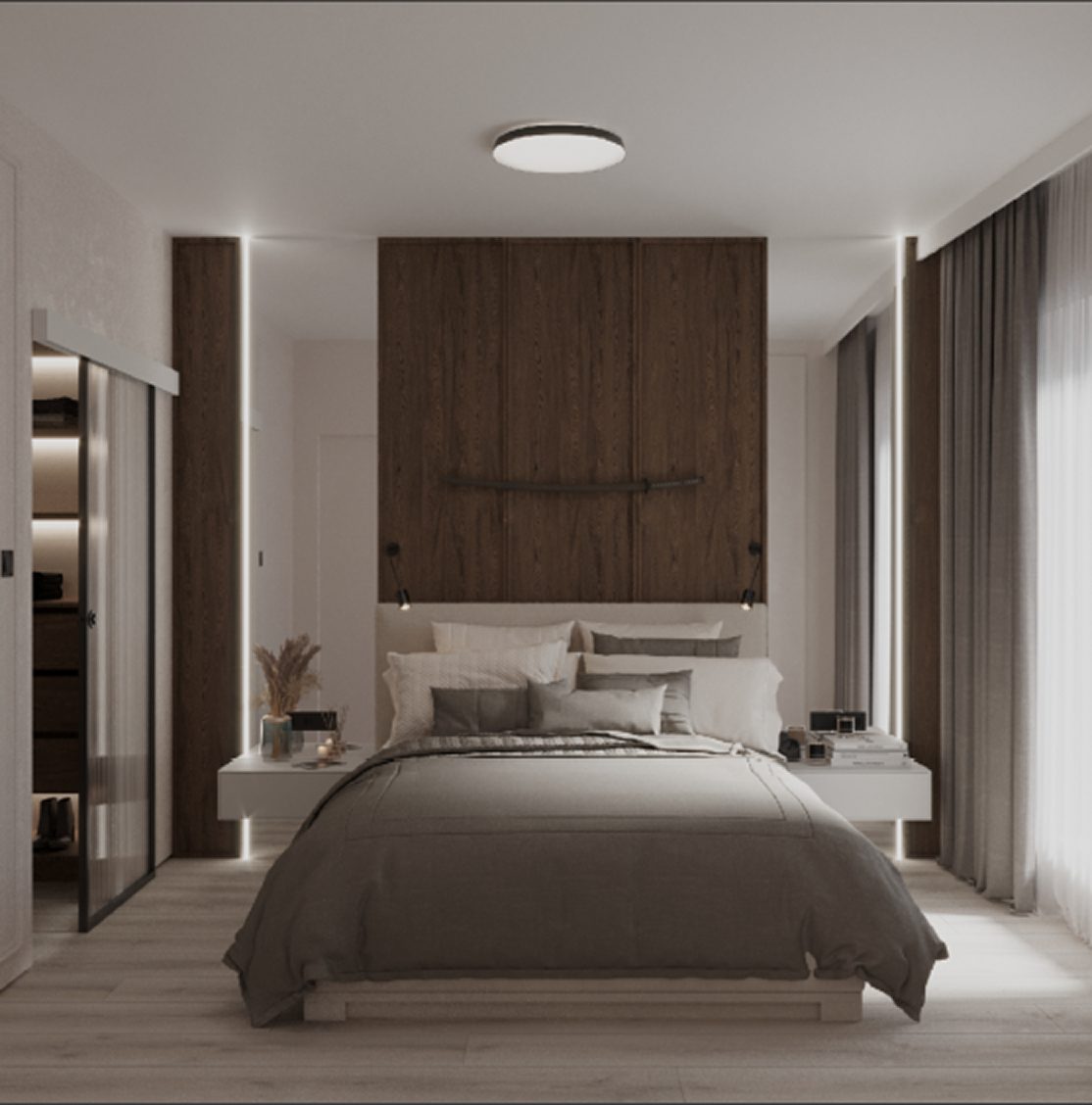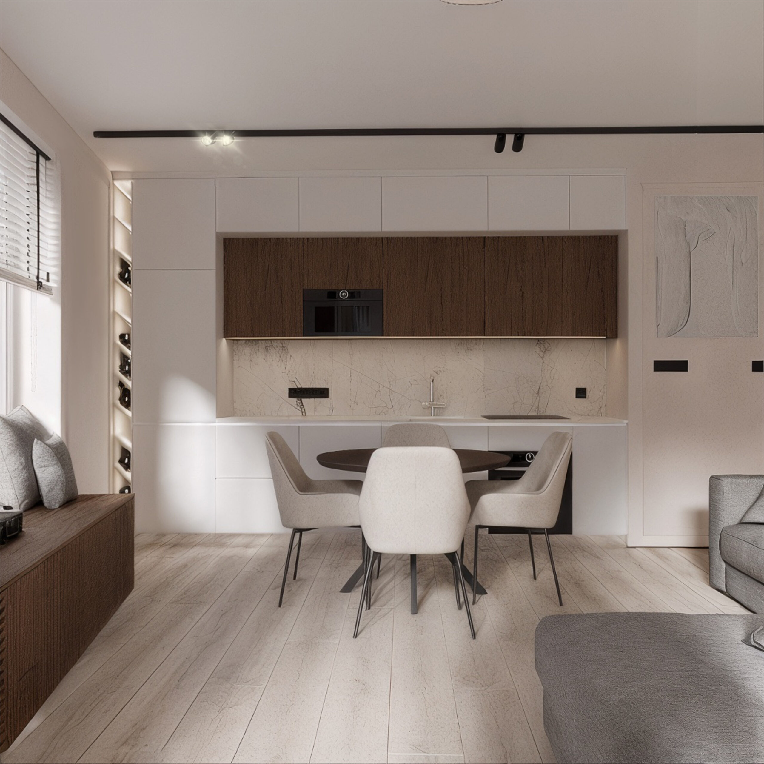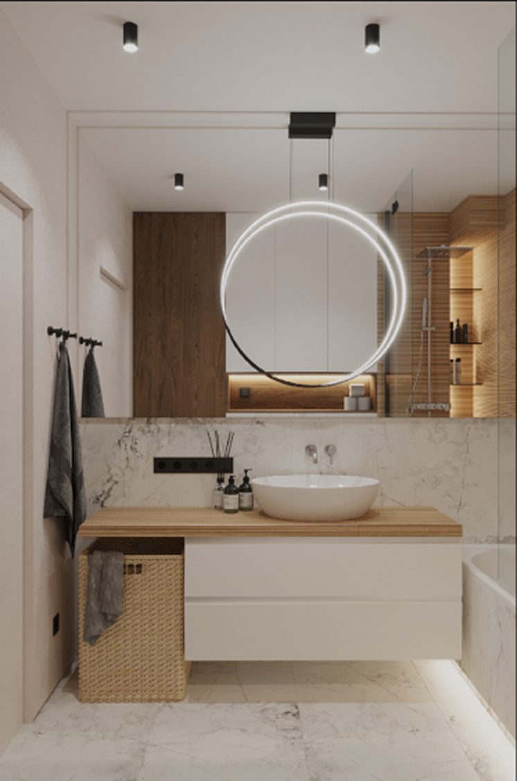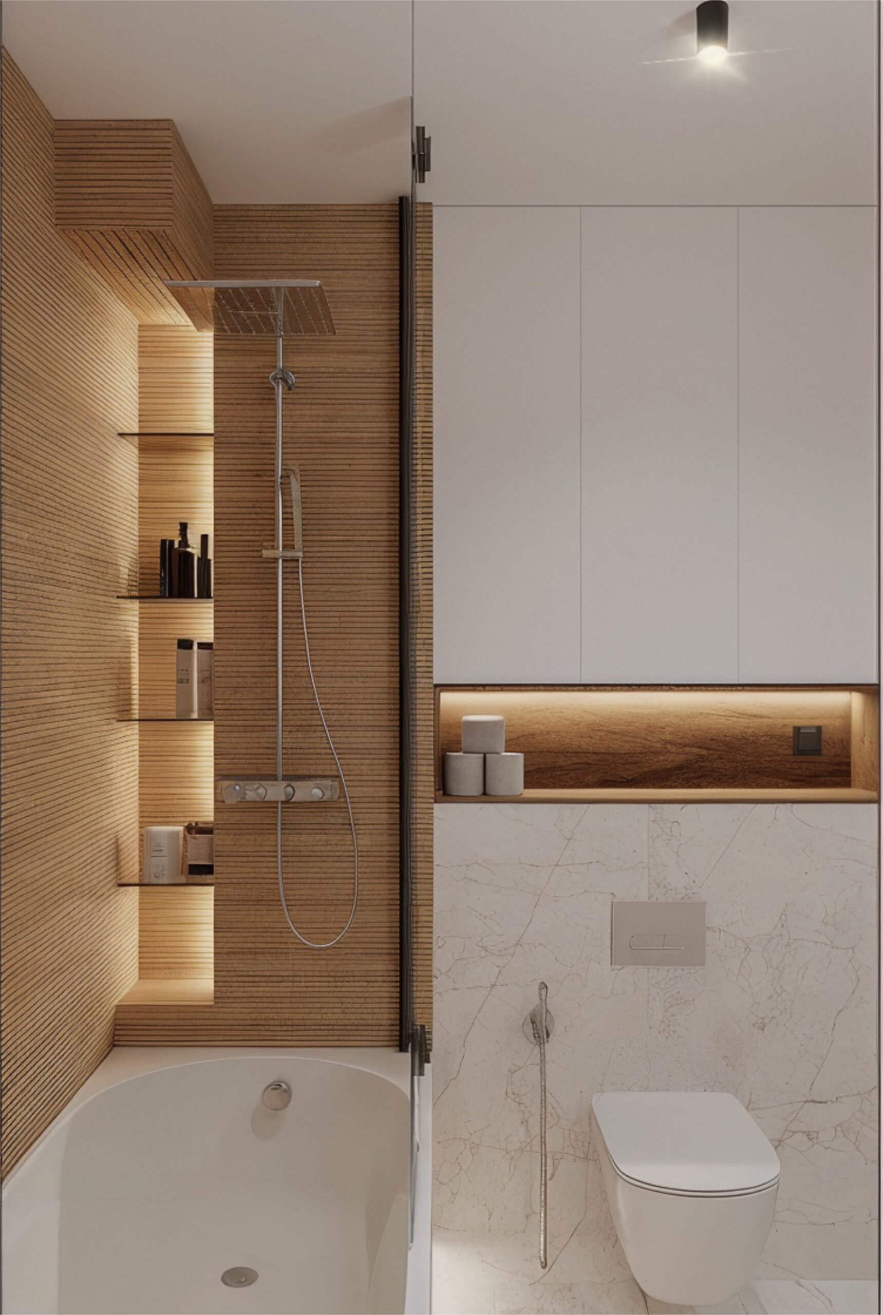 Łazienka łączy jasną, spokojną kolorystykę z naturalnym akcentem ciemnego drewna, tworząc przestrzeń sprzyjającą relaksowi. Płytki w tonacjach Patagonii zestawiono z drewnopodobnymi, strukturalnymi detalami, co nadaje wnętrzu wyważony i ponadczasowy charakter. Subtelna sztukateria ścienna oraz minimalistyczne wyposażenie wprowadzają elegancję, a starannie dobrane detale zapewniają komfort codziennego użytkowania.