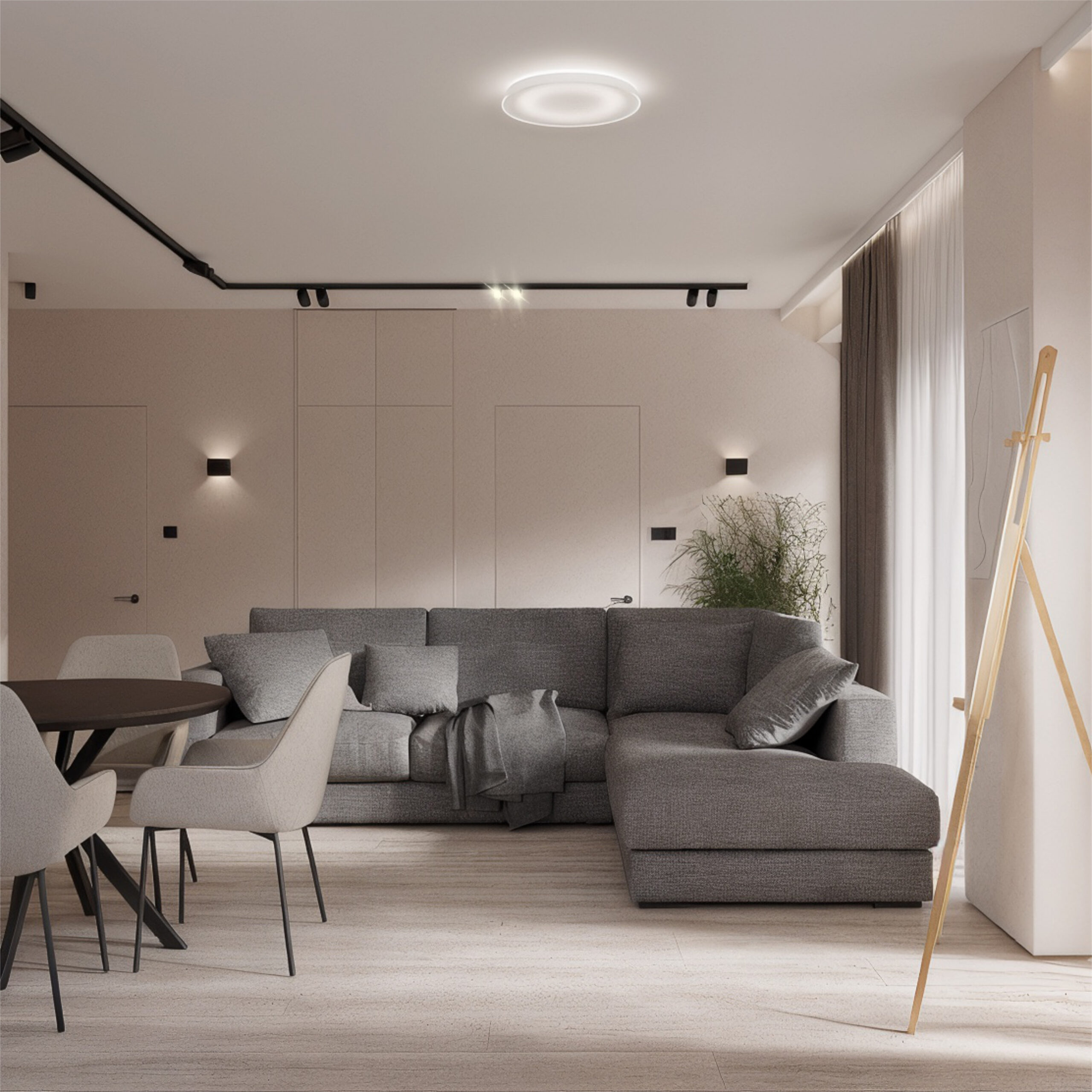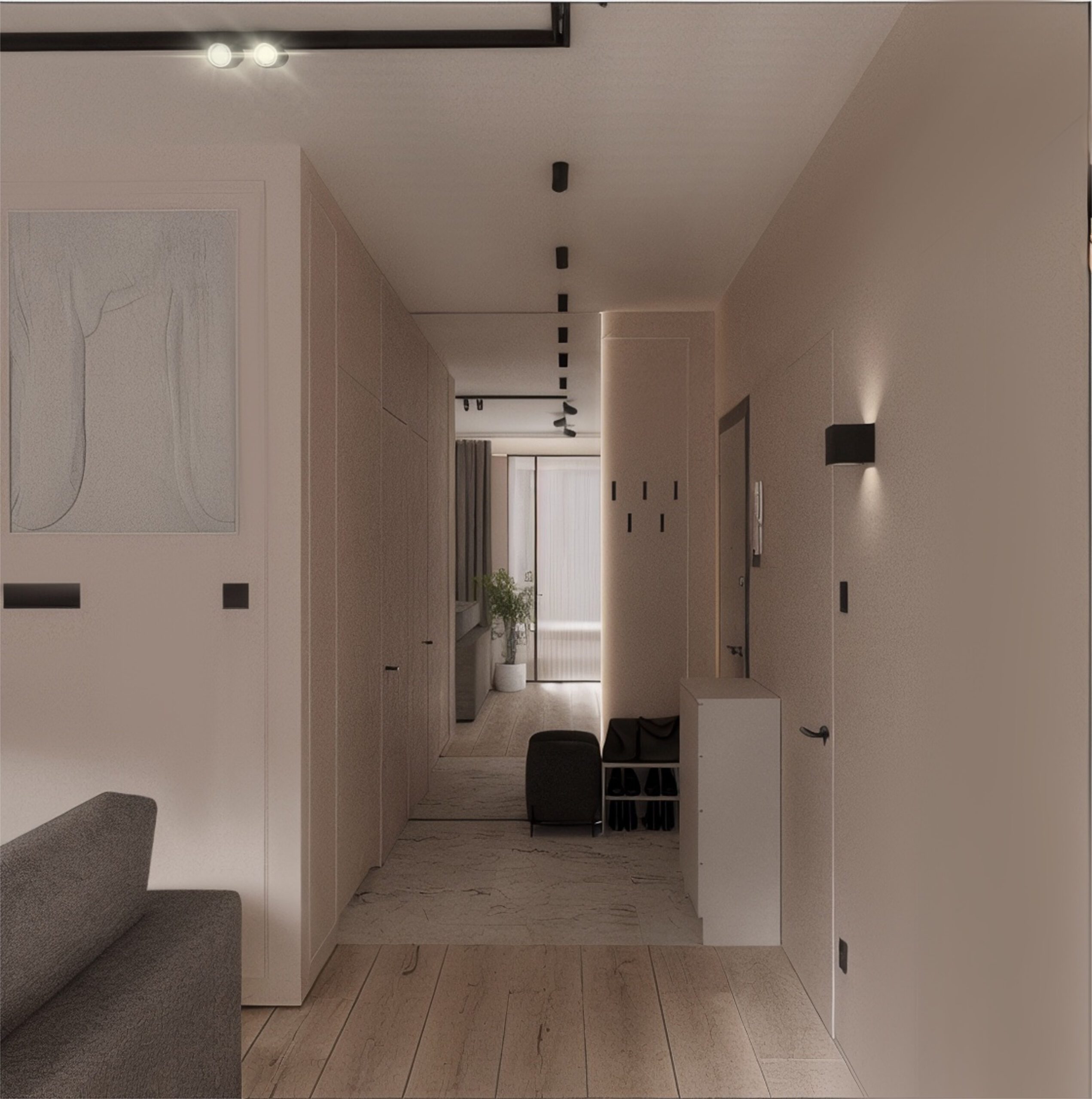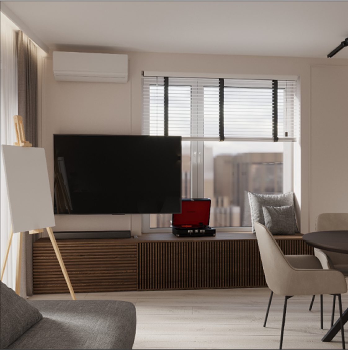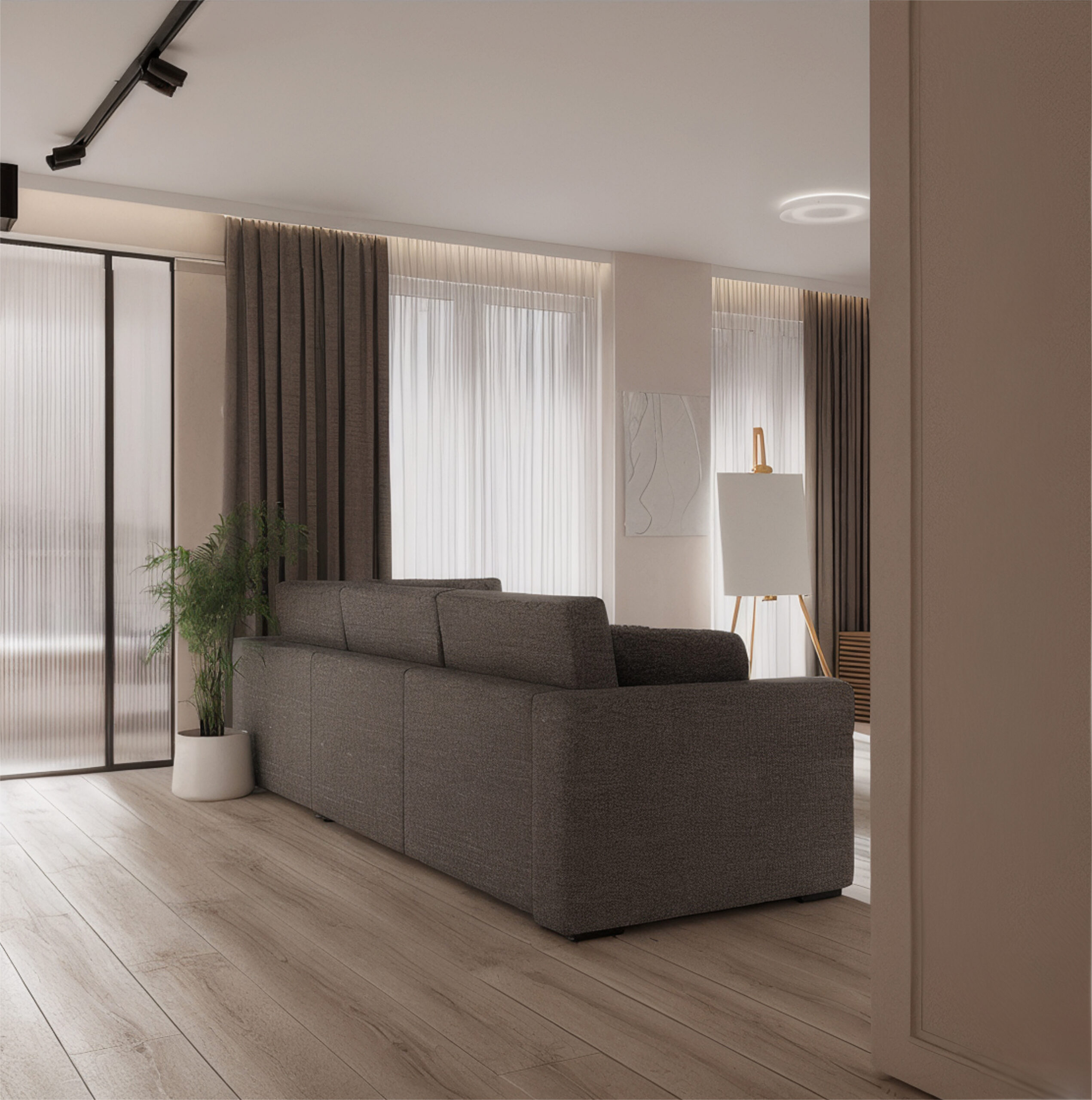 Łazienka łączy jasną, spokojną kolorystykę z naturalnym akcentem ciemnego drewna, tworząc przestrzeń sprzyjającą relaksowi. Płytki w tonacjach Patagonii zestawiono z drewnopodobnymi, strukturalnymi detalami, co nadaje wnętrzu wyważony i ponadczasowy charakter. Subtelna sztukateria ścienna oraz minimalistyczne wyposażenie wprowadzają elegancję, a starannie dobrane detale zapewniają komfort codziennego użytkowania.