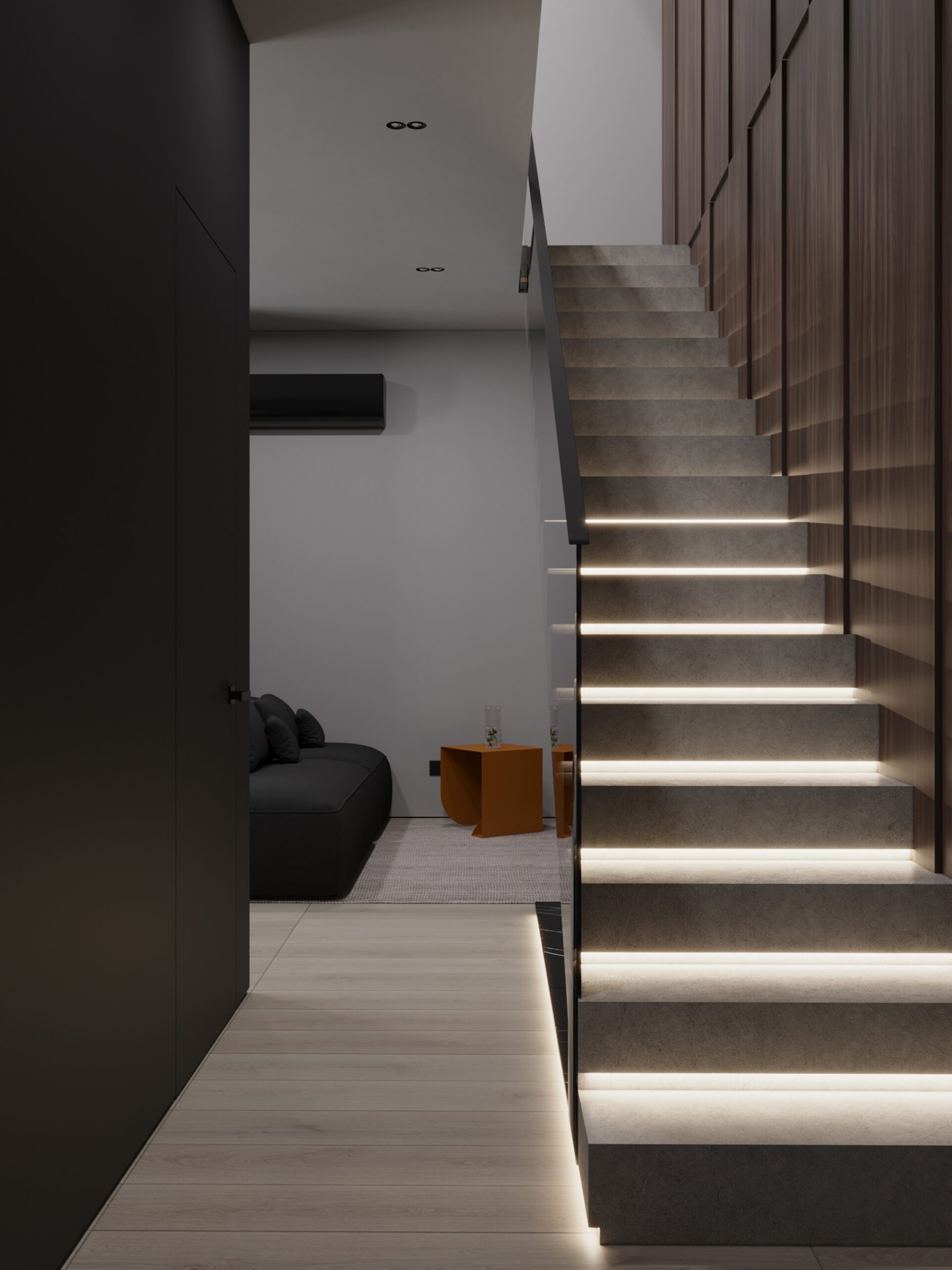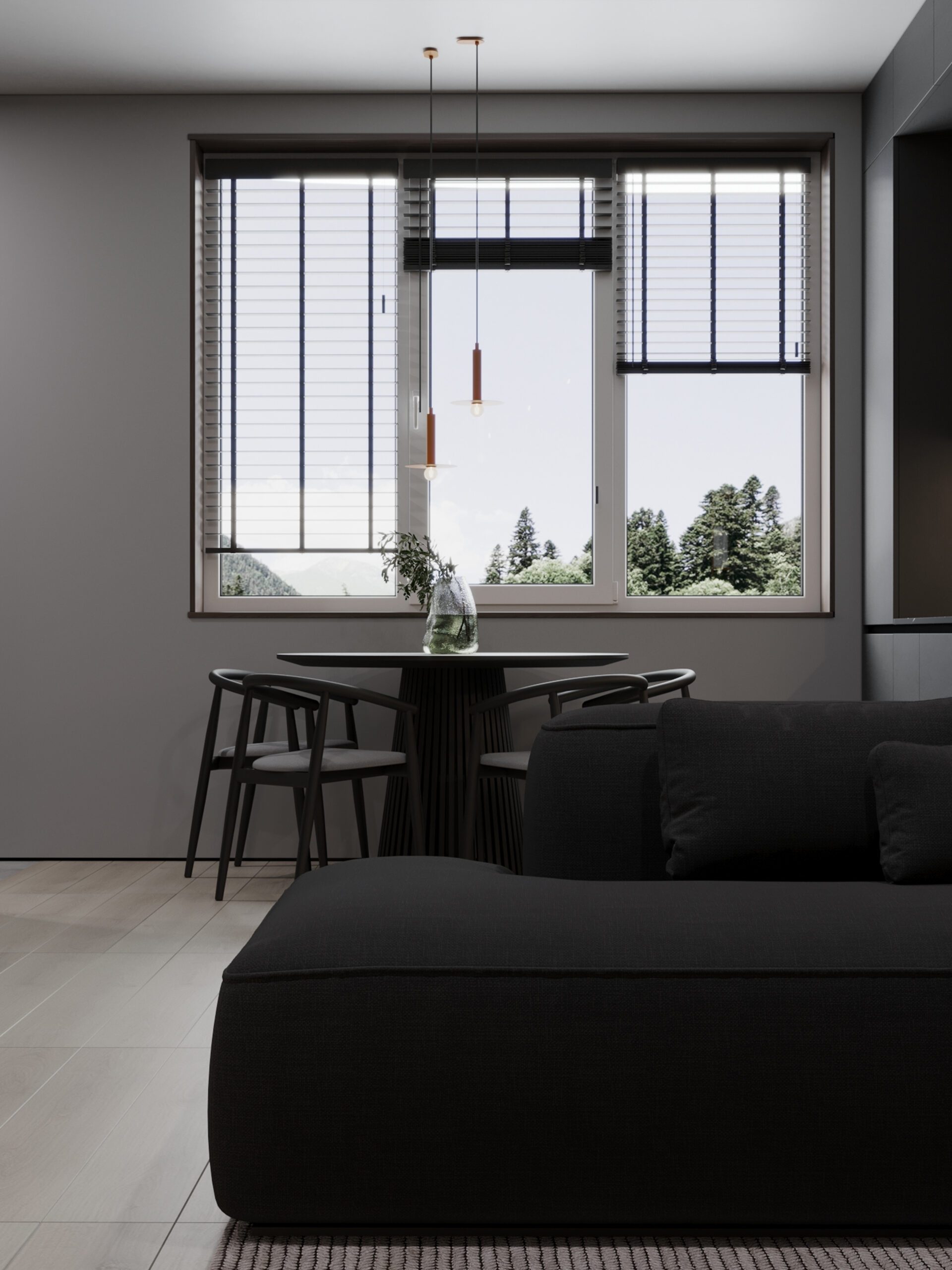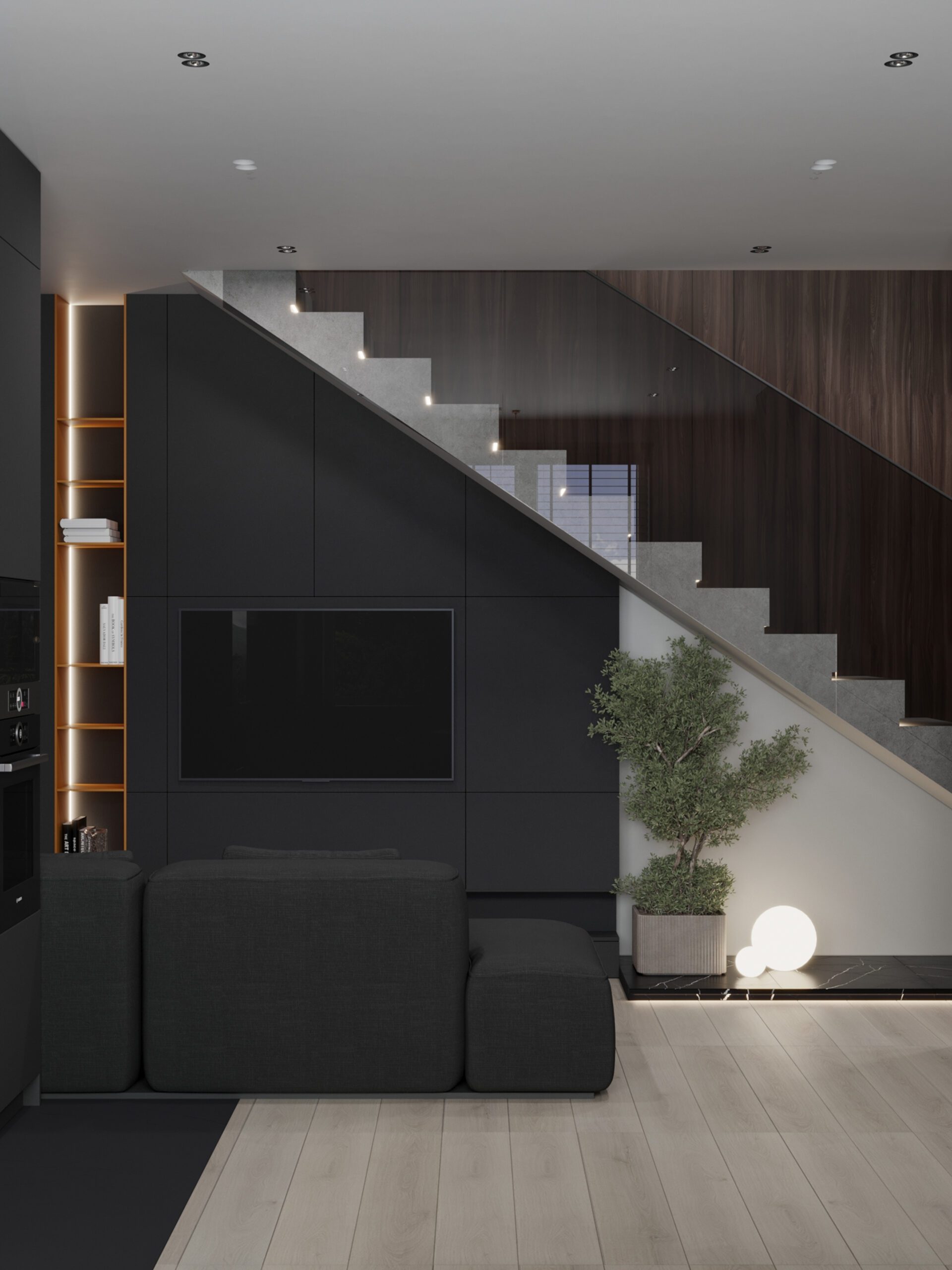 Salon wyróżnia się wyważonym połączeniem grafitu, czerni i ciemnego drewna z jasnymi elementami podłogi, które rozświetlają wnętrze. Minimalistyczne meble o prostych formach harmonizują z subtelnym oświetleniem, tworząc przestrzeń elegancką i funkcjonalną zarazem. Każdy detal, od wykończeń po dodatki dekoracyjne, został dobrany tak, aby wnętrze było zarówno reprezentacyjne, jak i przyjazne do codziennego życia.