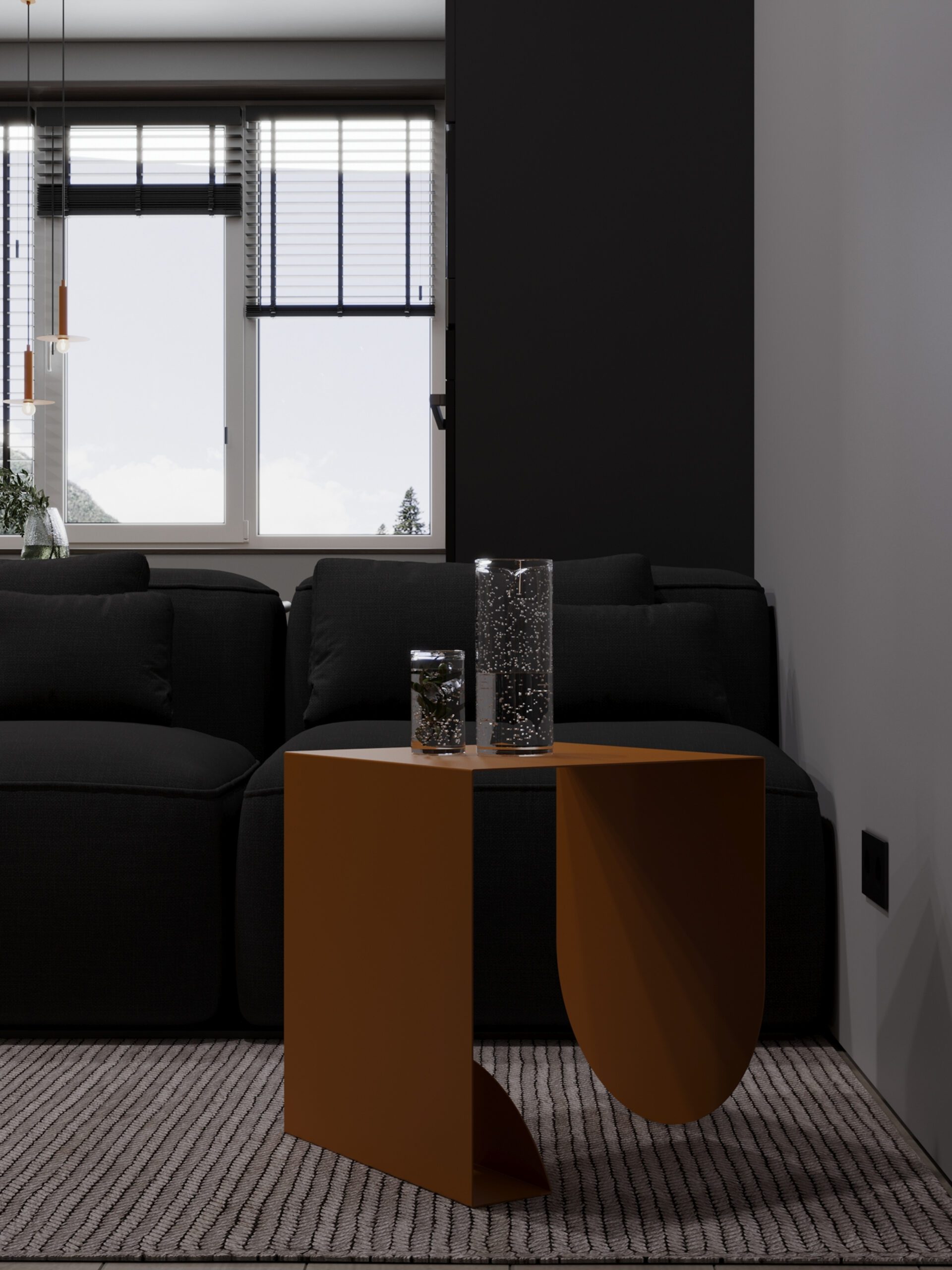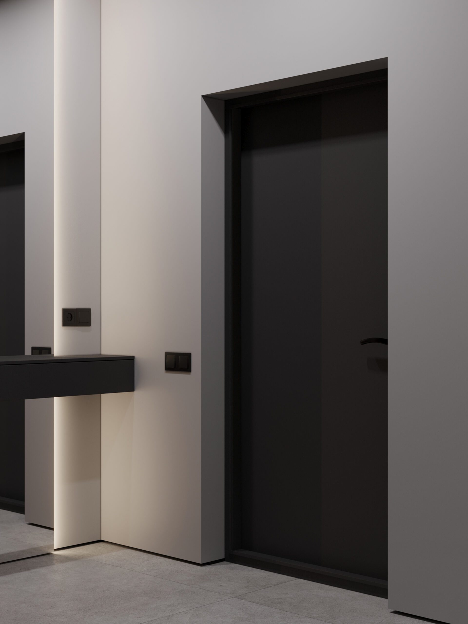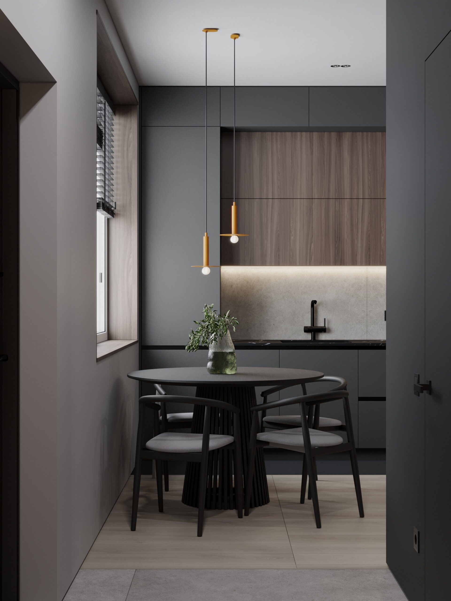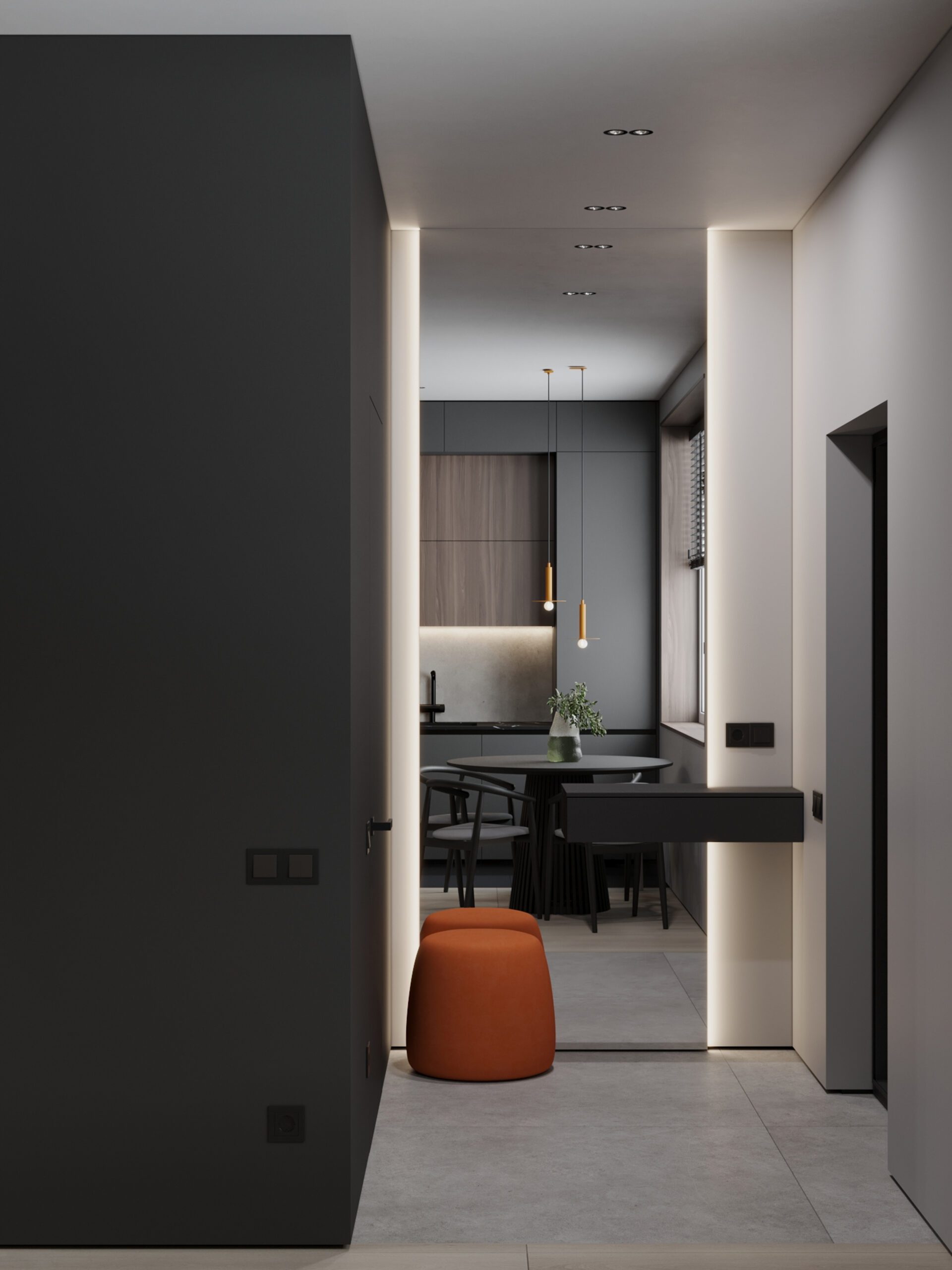 Salon wyróżnia się wyważonym połączeniem grafitu, czerni i ciemnego drewna z jasnymi elementami podłogi, które rozświetlają wnętrze. Minimalistyczne meble o prostych formach harmonizują z subtelnym oświetleniem, tworząc przestrzeń elegancką i funkcjonalną zarazem. Każdy detal, od wykończeń po dodatki dekoracyjne, został dobrany tak, aby wnętrze było zarówno reprezentacyjne, jak i przyjazne do codziennego życia.
