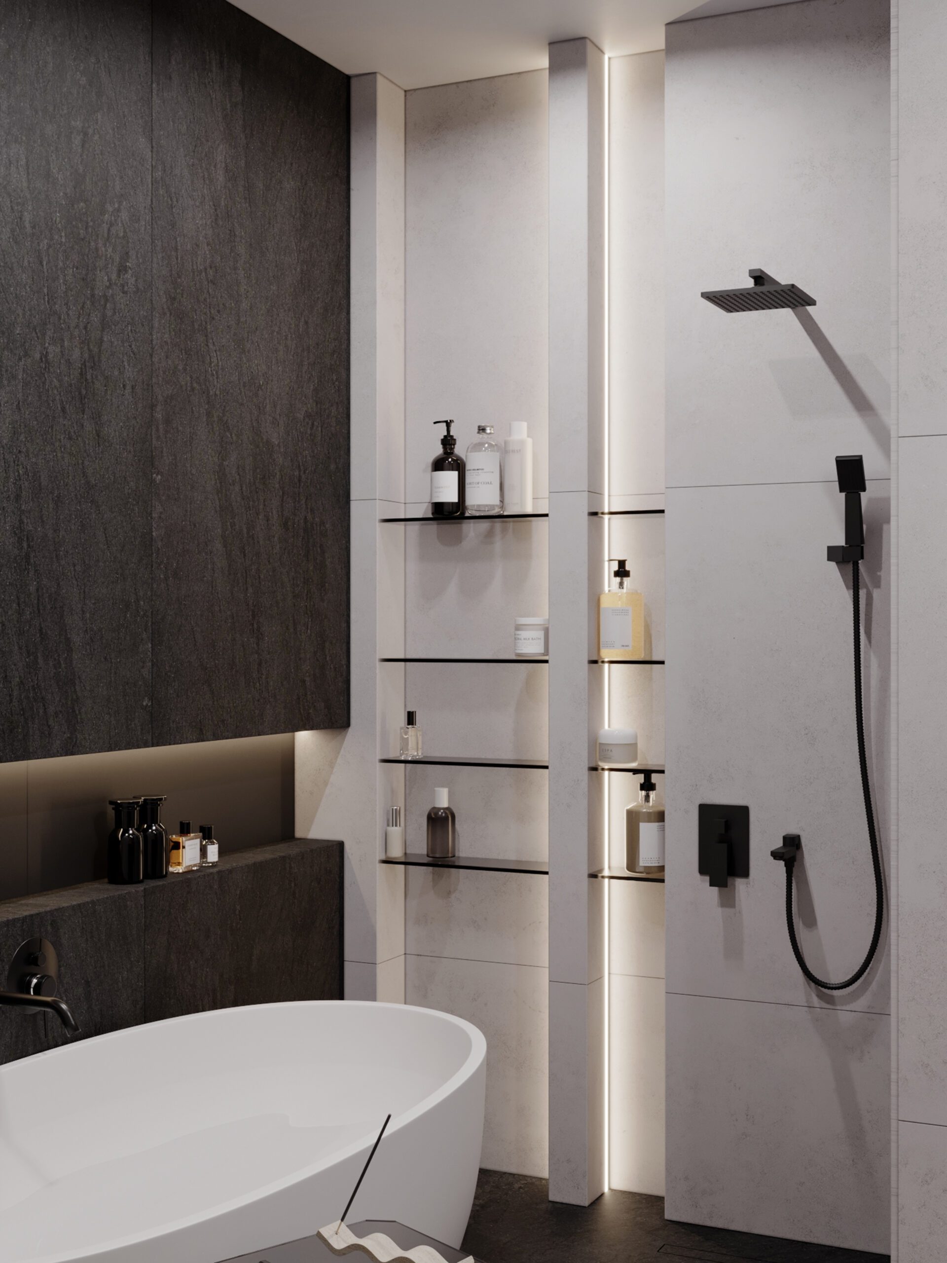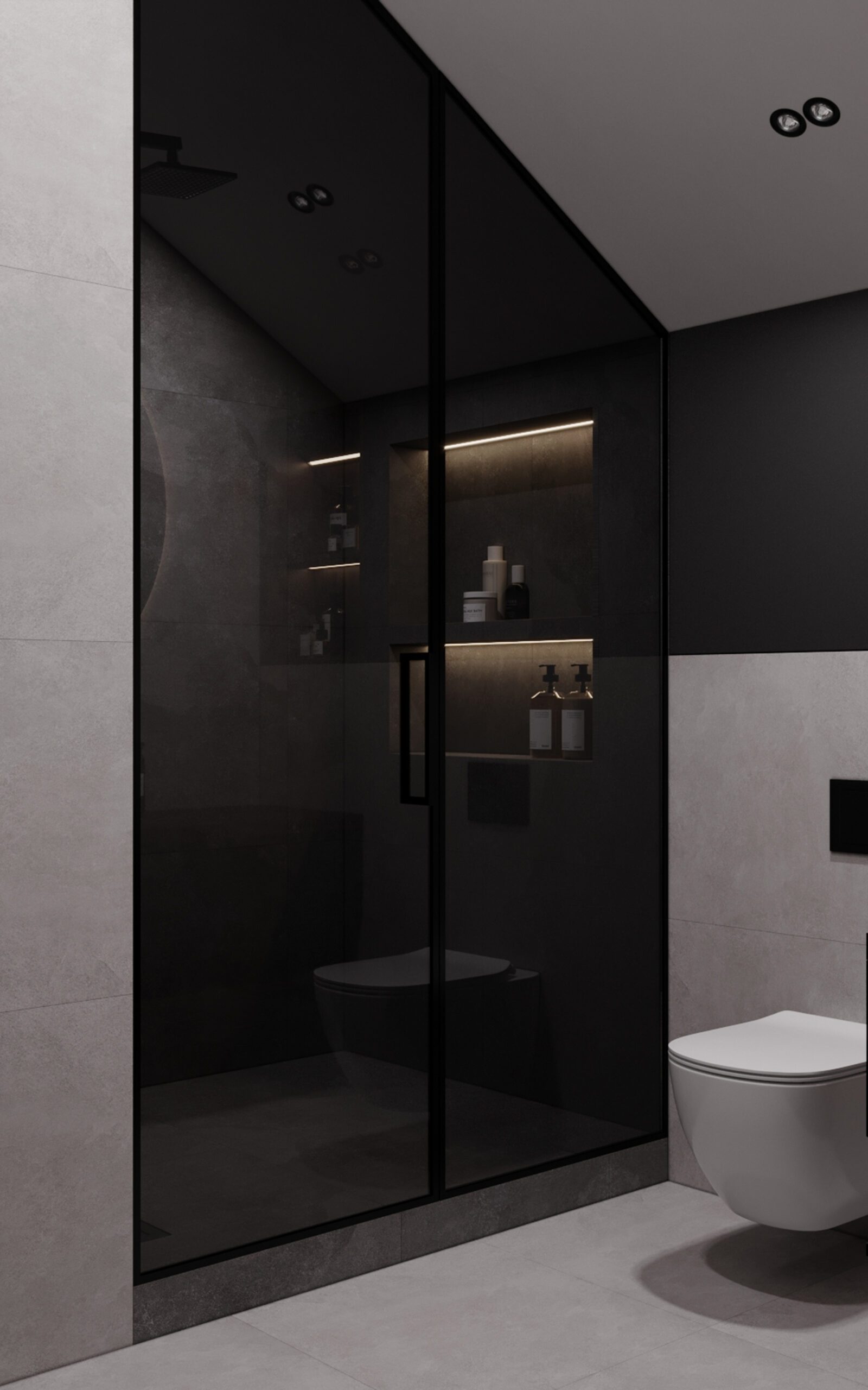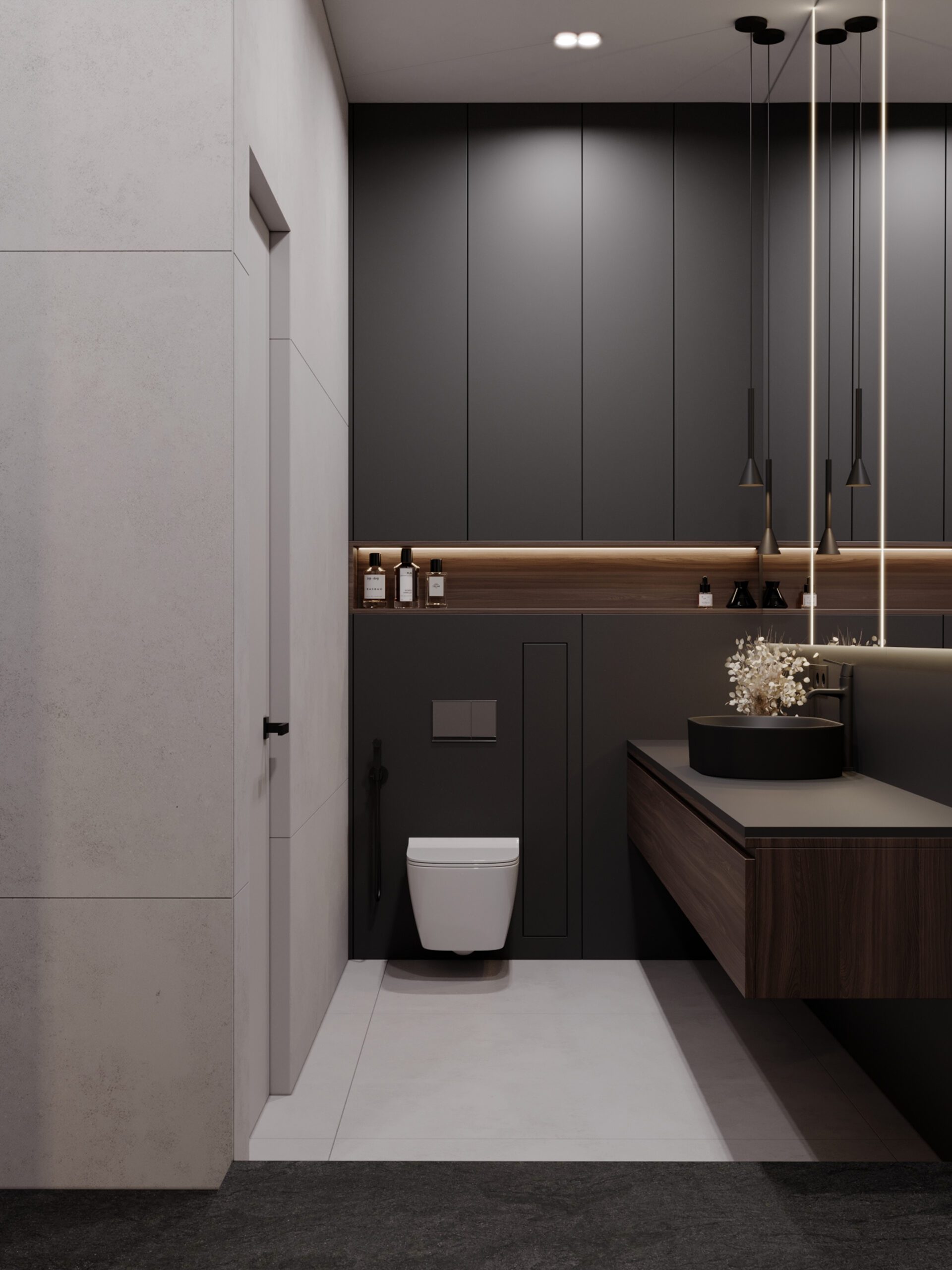 Łazienka łączy wyrafinowaną prostotę z industrialnym charakterem. Szare, matowe płytki tworzą stonowaną bazę, którą ożywia ciemne drewno zastosowane na podłodze i zabudowie. Dyskretne oświetlenie LED subtelnie podkreśla faktury powierzchni, a minimalistyczna armatura wpisuje się w harmonijną całość. To przestrzeń, w której każdy element został przemyślany, zapewniając wygodę użytkowania i estetyczny efekt, jednocześnie zachowując chłodną elegancję wnętrza.