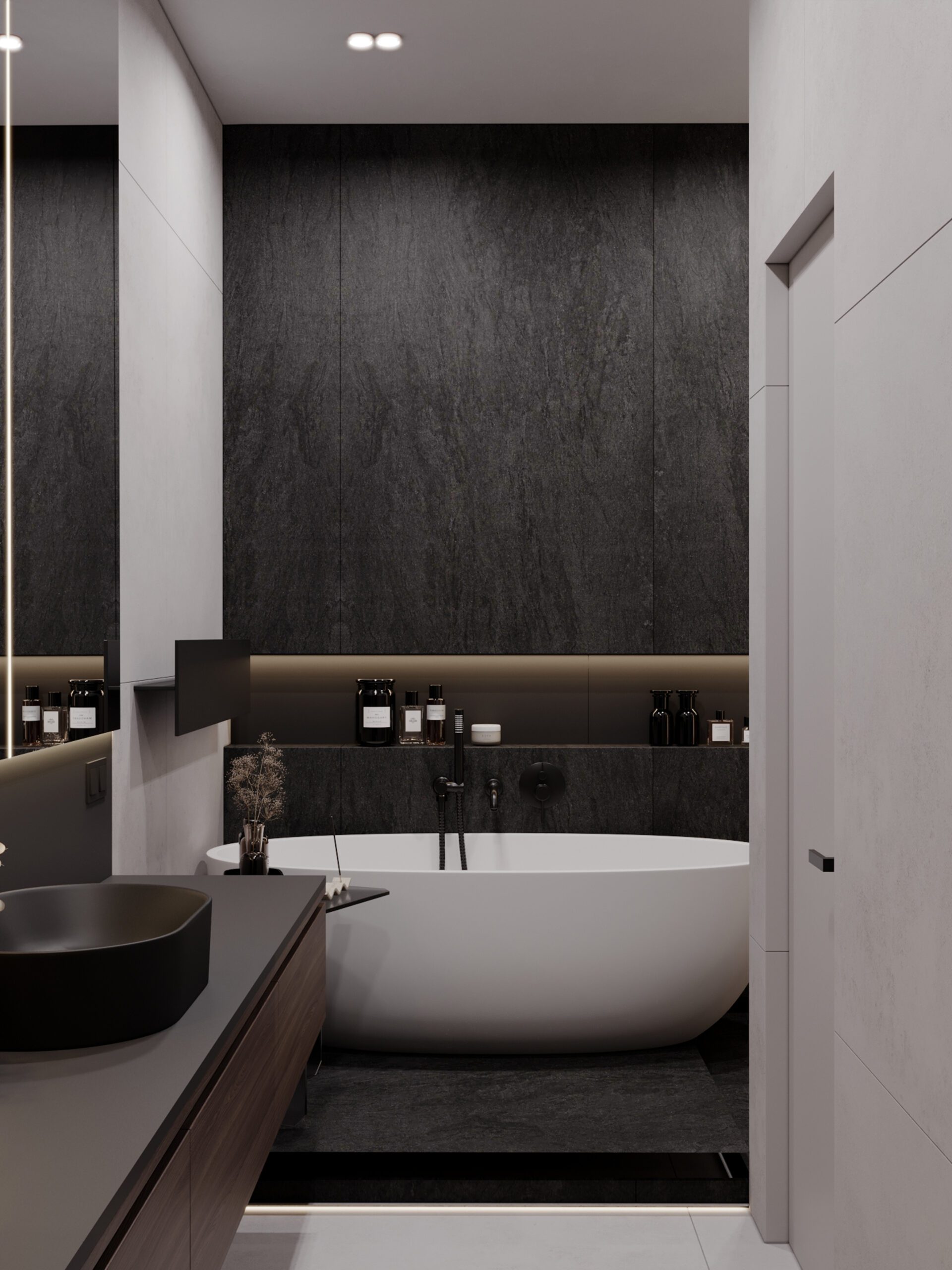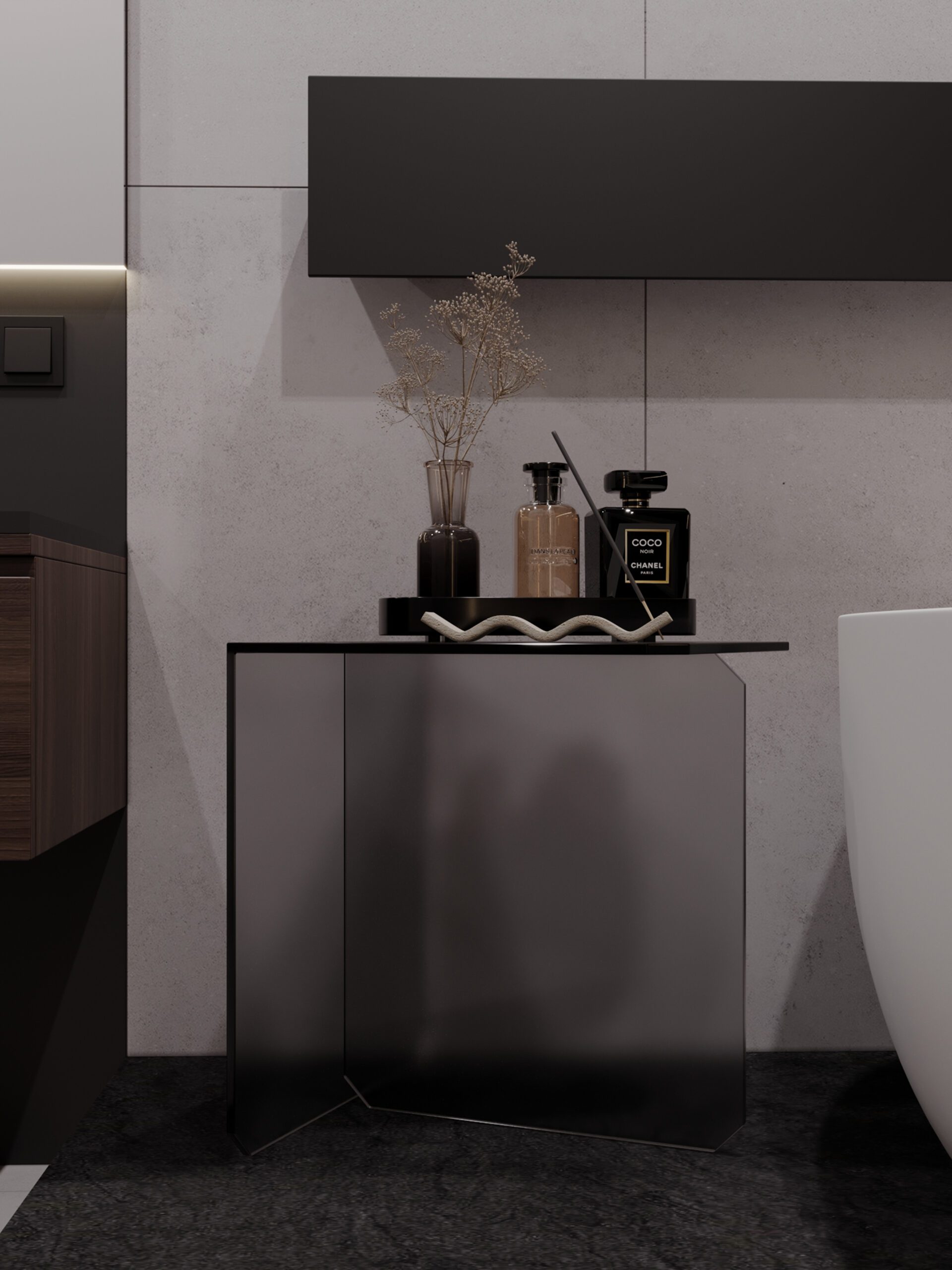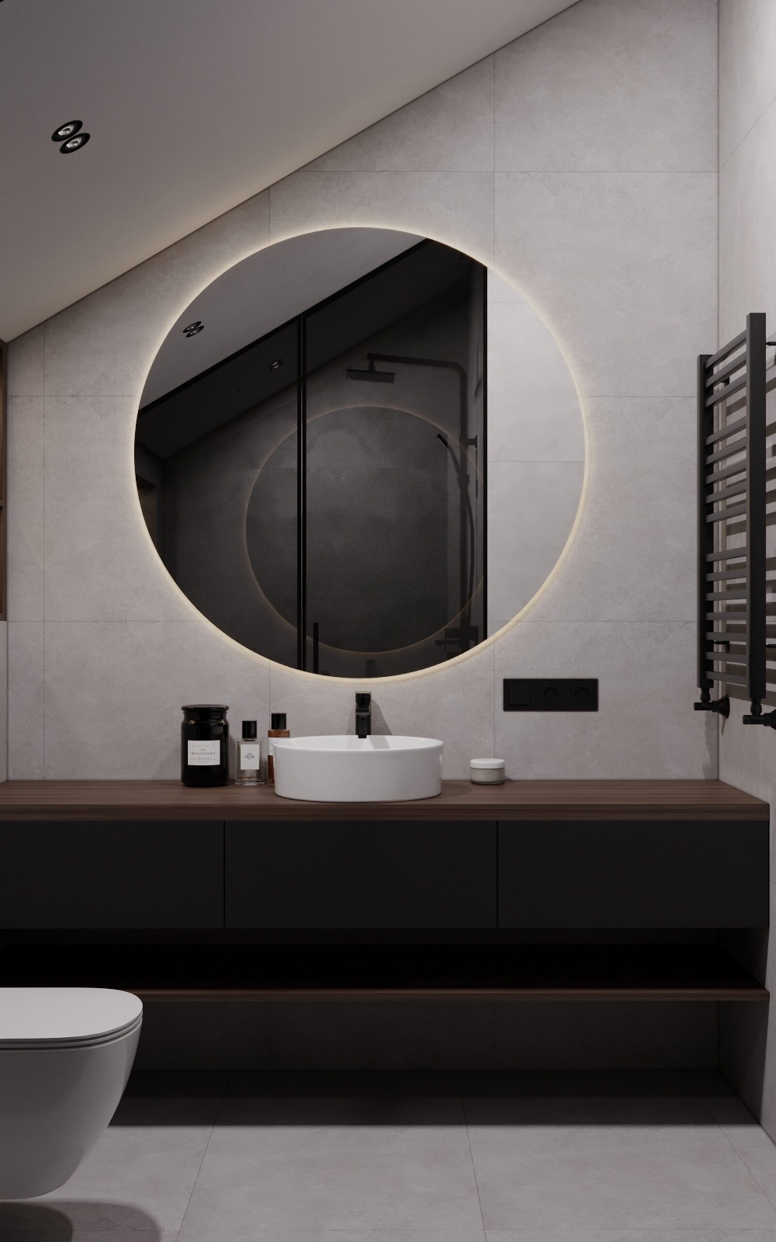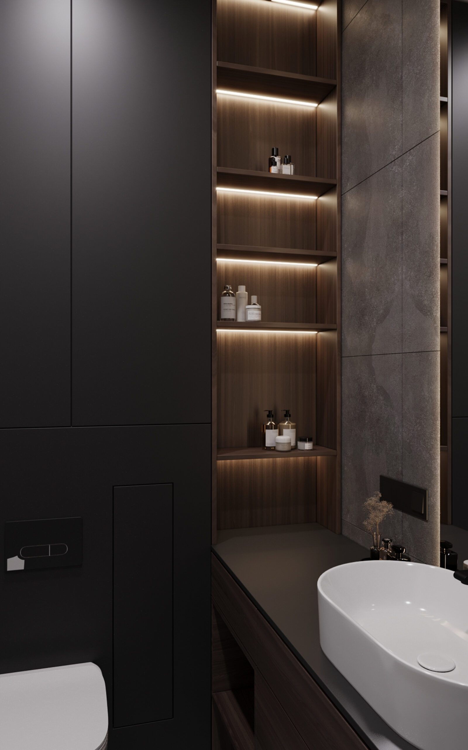 Łazienka łączy wyrafinowaną prostotę z industrialnym charakterem. Szare, matowe płytki tworzą stonowaną bazę, którą ożywia ciemne drewno zastosowane na podłodze i zabudowie. Dyskretne oświetlenie LED subtelnie podkreśla faktury powierzchni, a minimalistyczna armatura wpisuje się w harmonijną całość. To przestrzeń, w której każdy element został przemyślany, zapewniając wygodę użytkowania i estetyczny efekt, jednocześnie zachowując chłodną elegancję wnętrza.