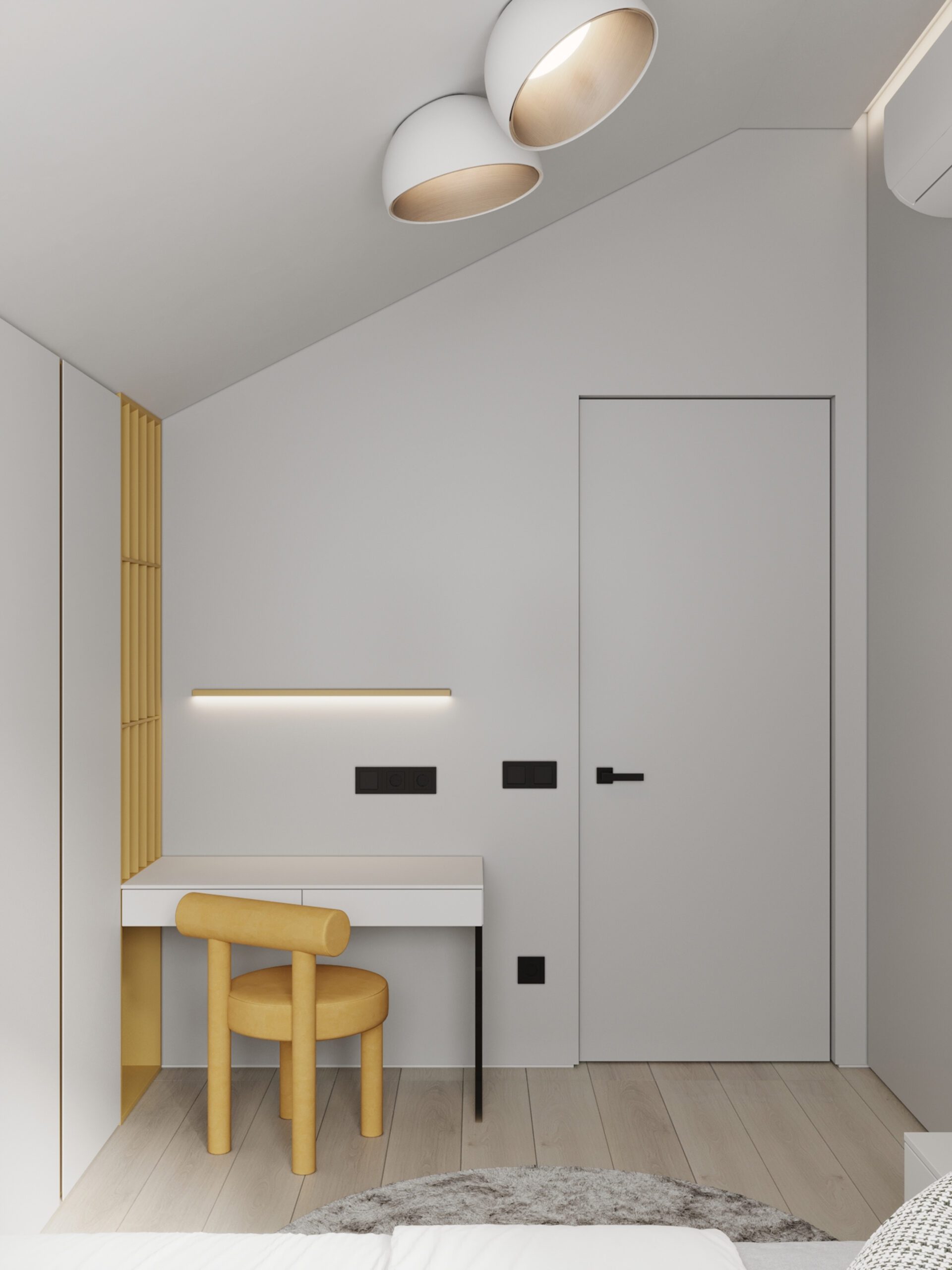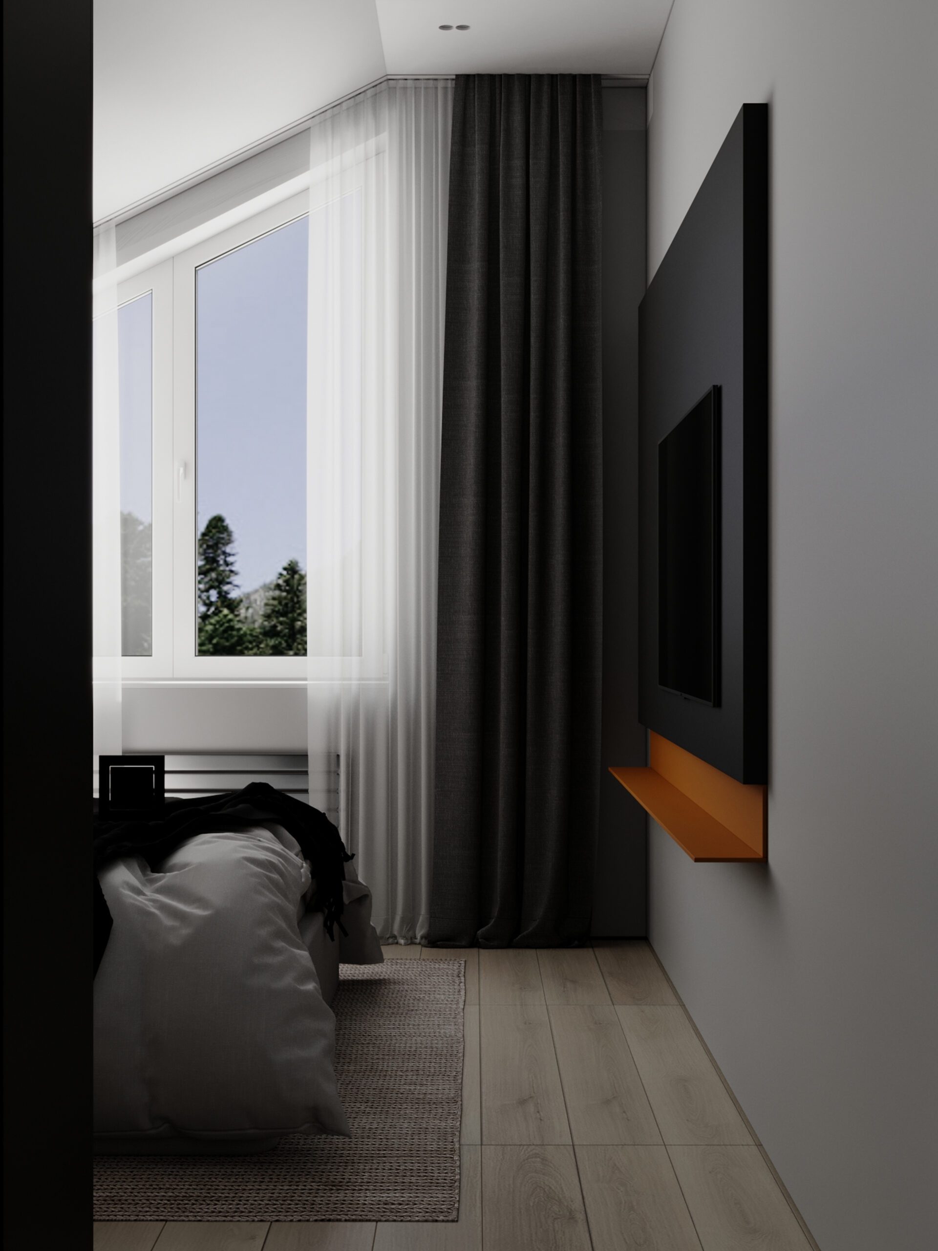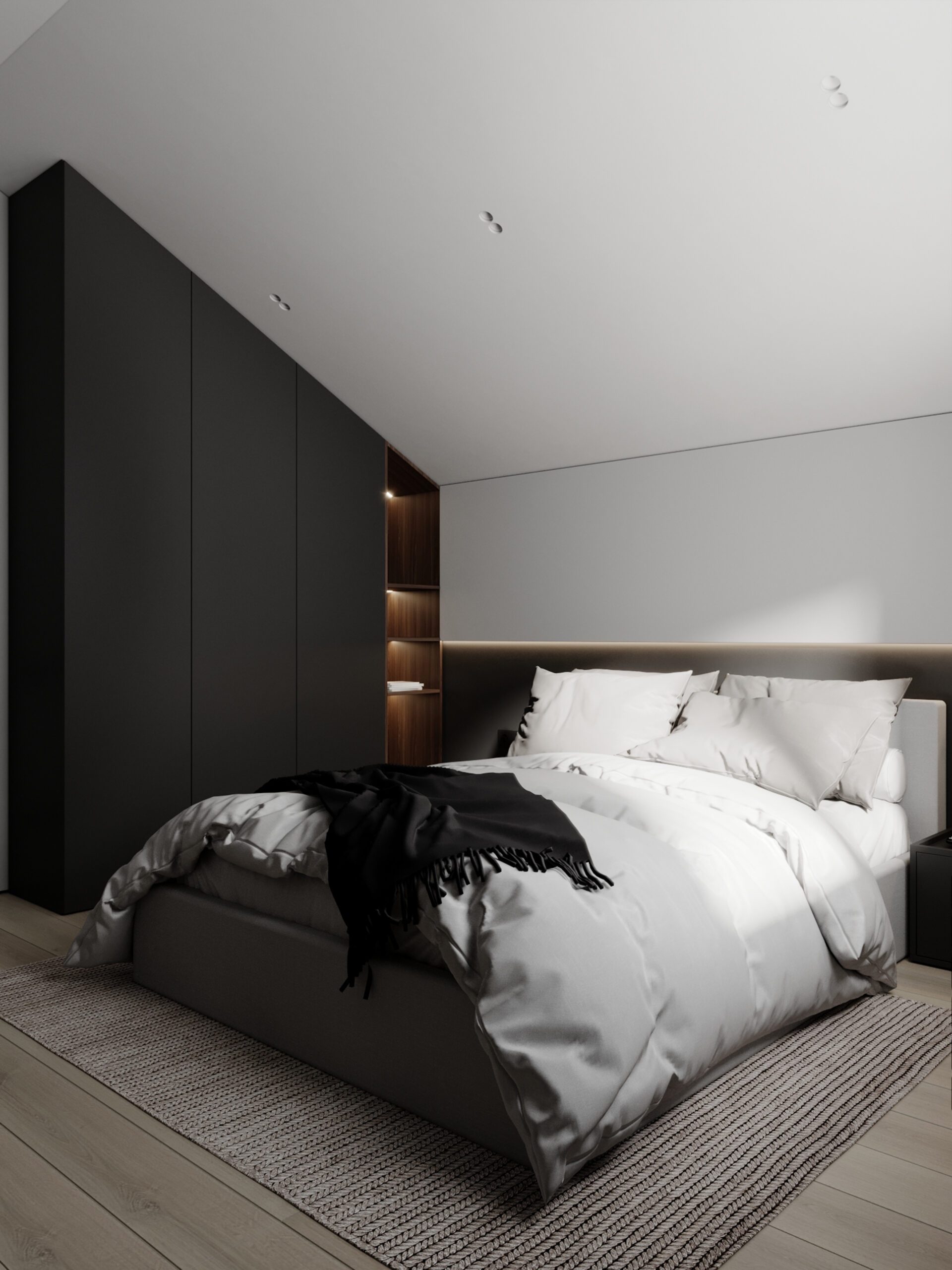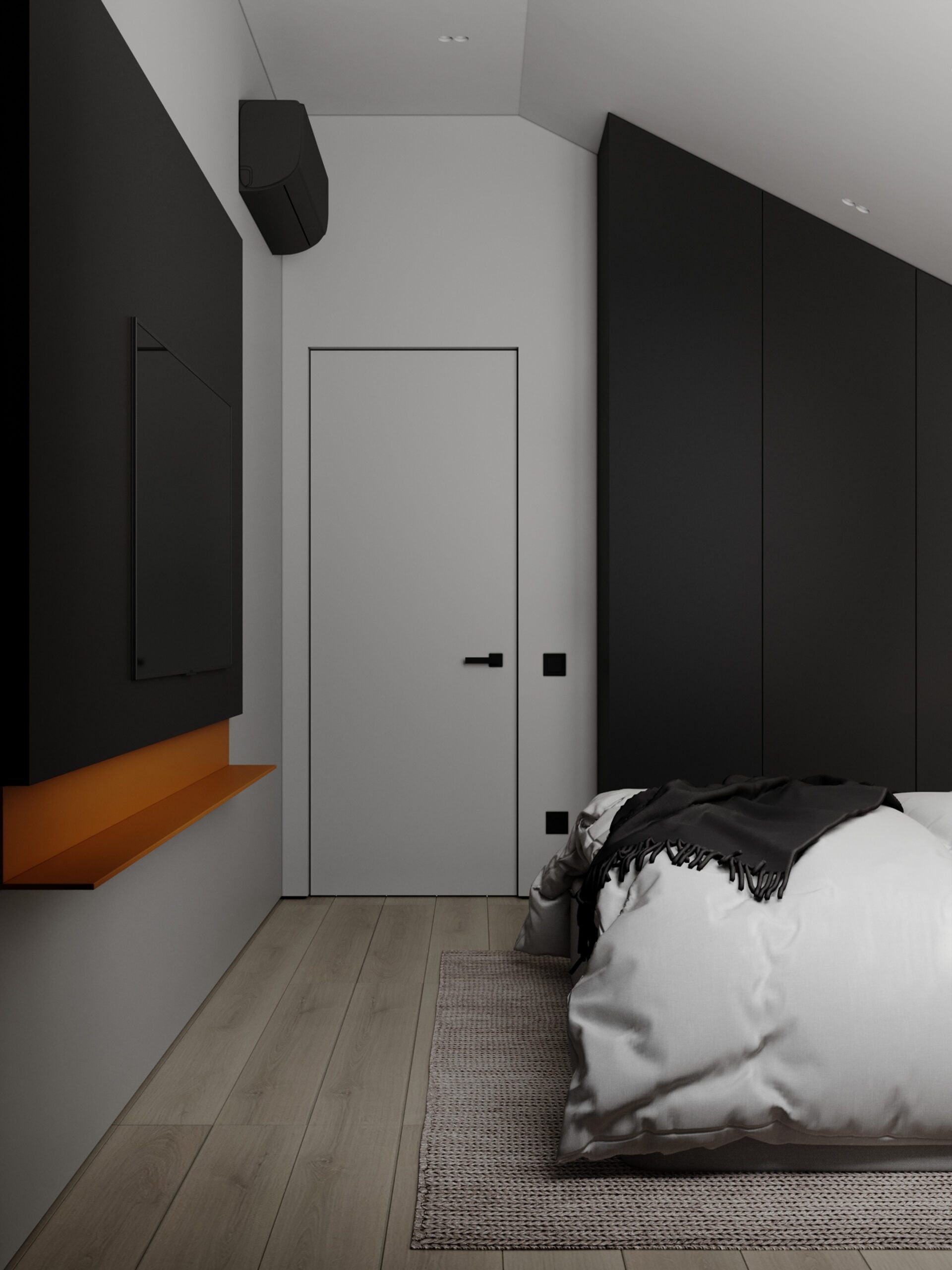 W pokoju zredukowana paleta barw grafitu i czerni łączy się z ciepłem ciemnego drewna, nadając przestrzeni spokojny, ale wyrazisty charakter. Jasne akcenty i dyskretne źródła światła podkreślają geometrię wnętrza, a nowoczesne meble o minimalistycznych formach zapewniają wygodę użytkowania. To miejsce, które sprzyja koncentracji i relaksowi, zachowując przy tym elegancję i wysmakowany design.