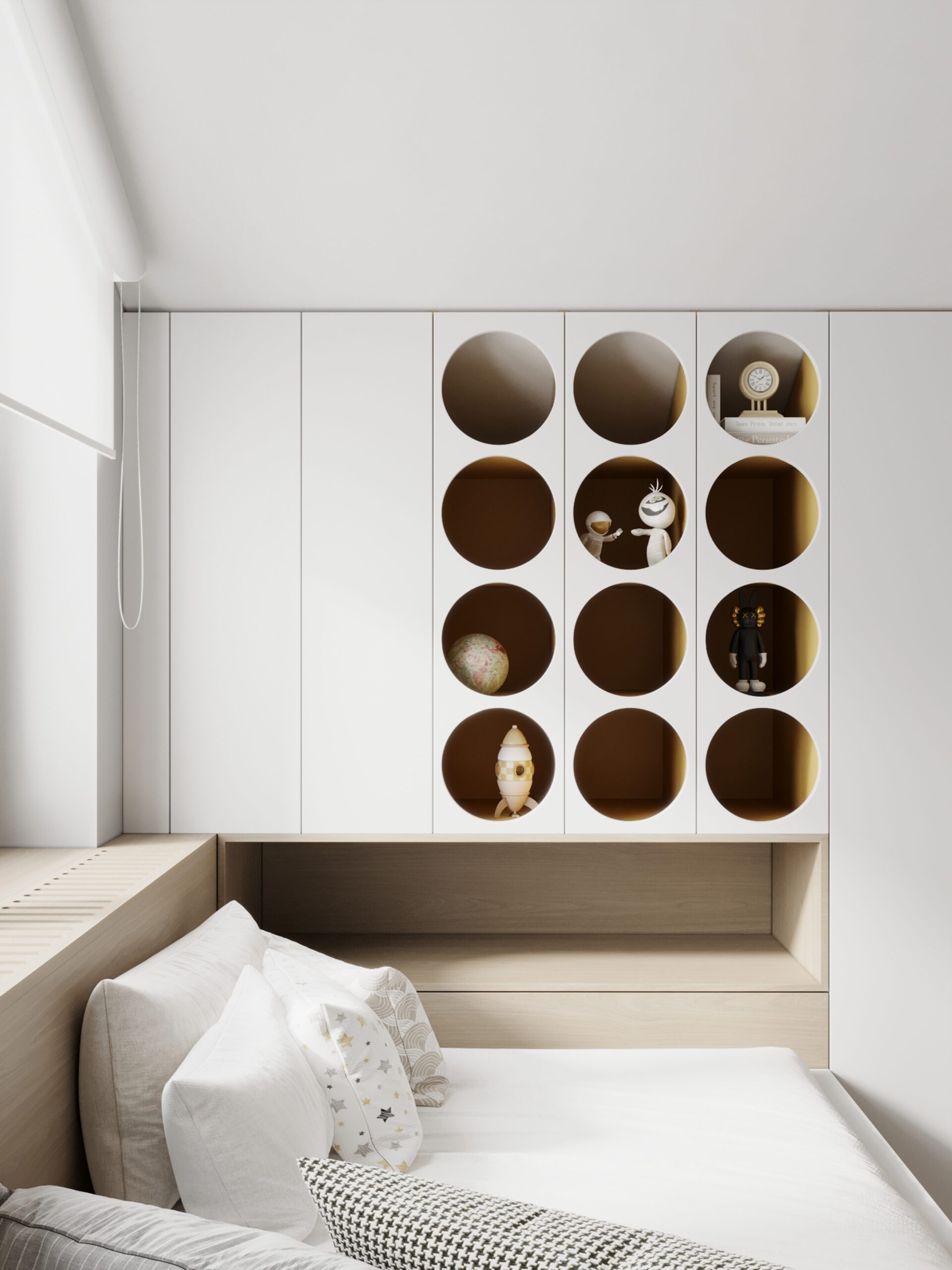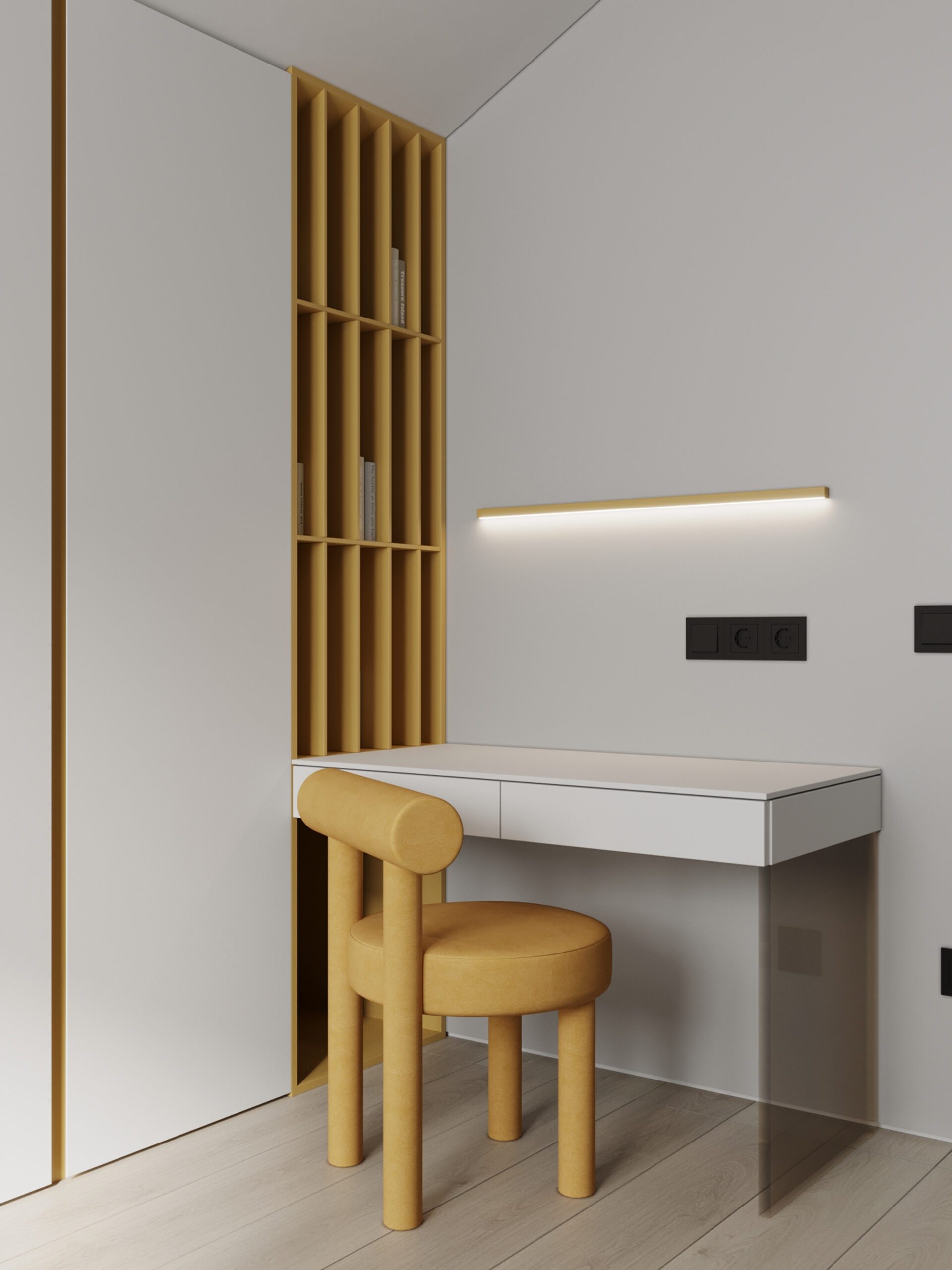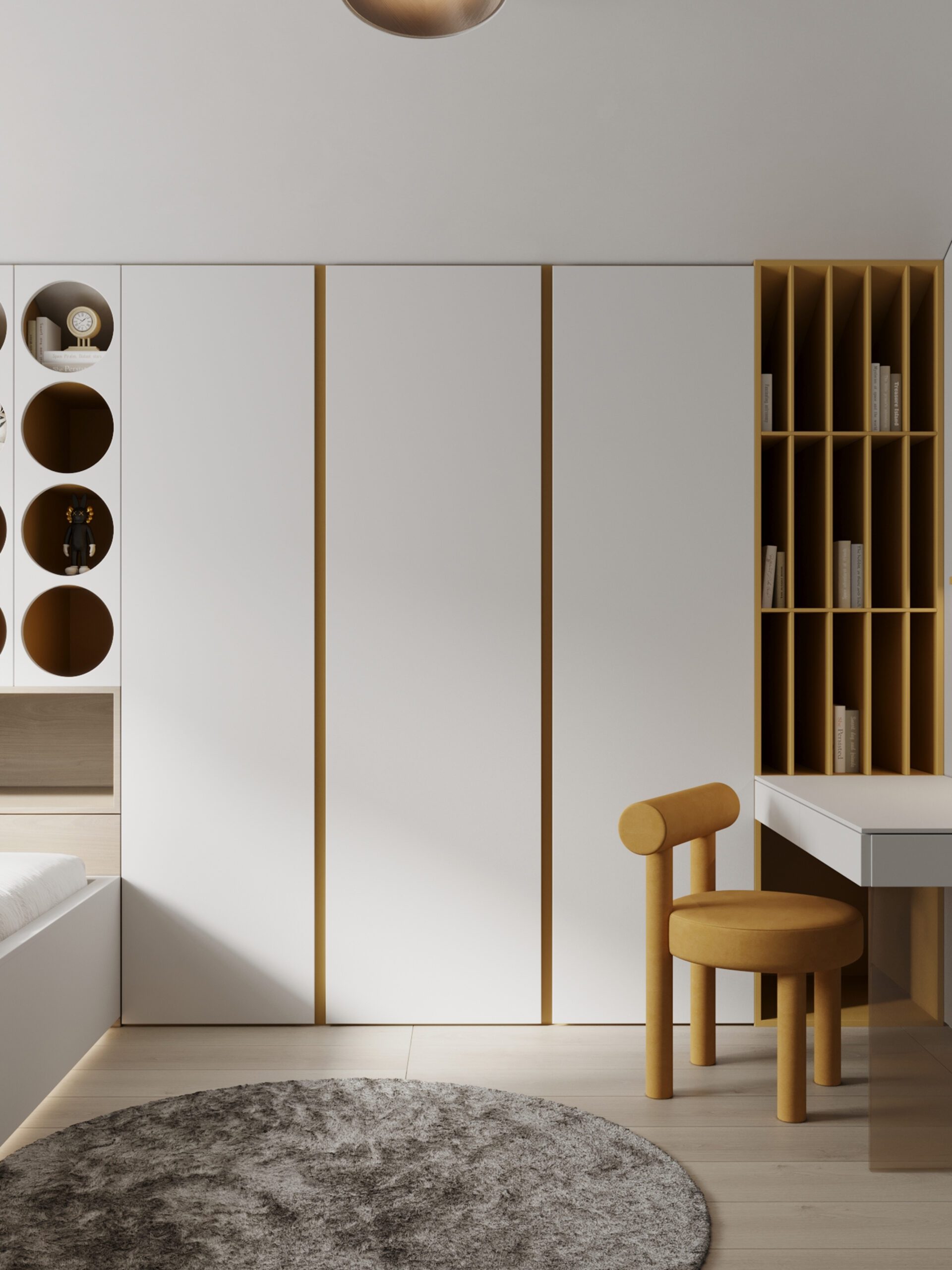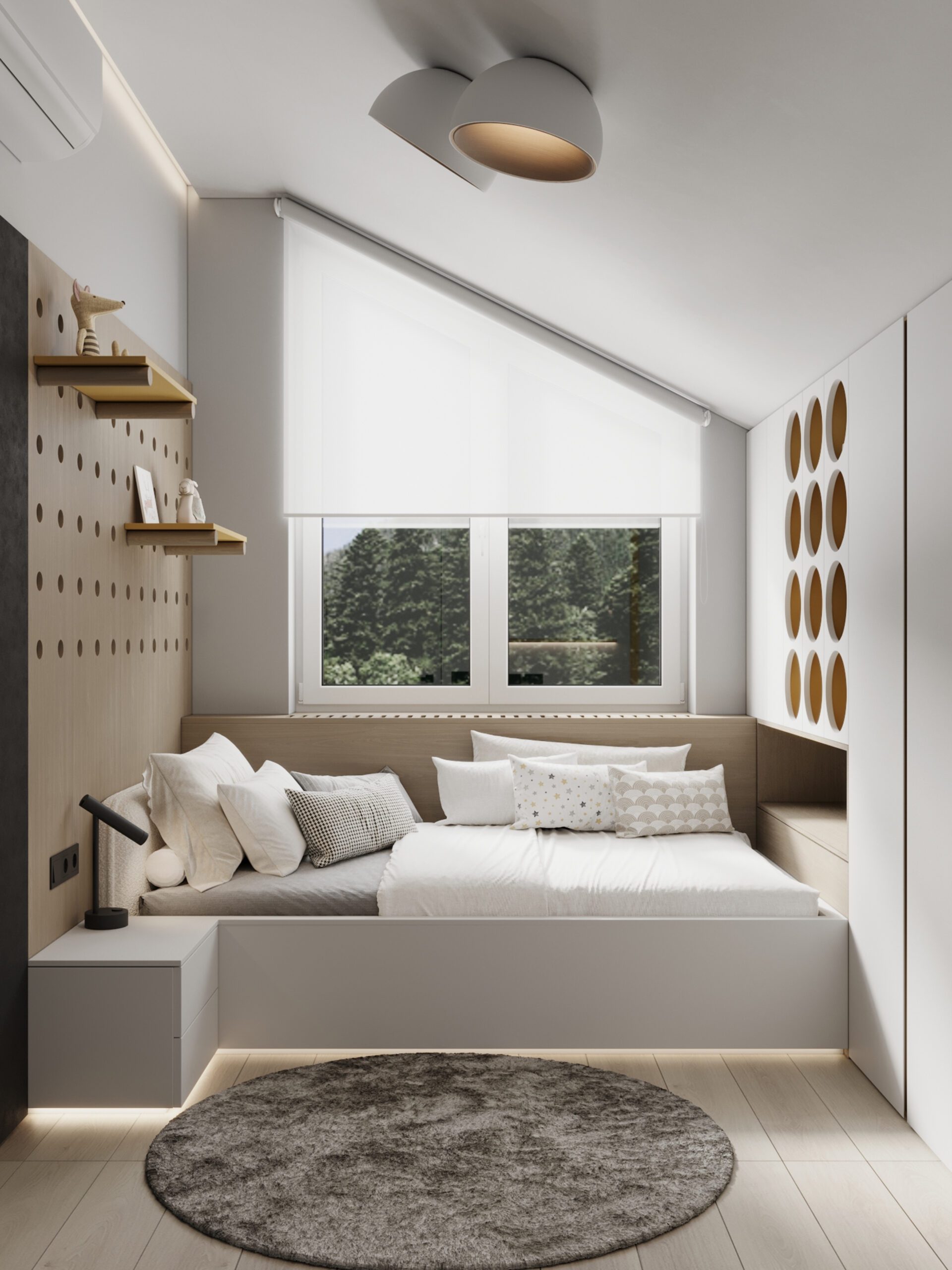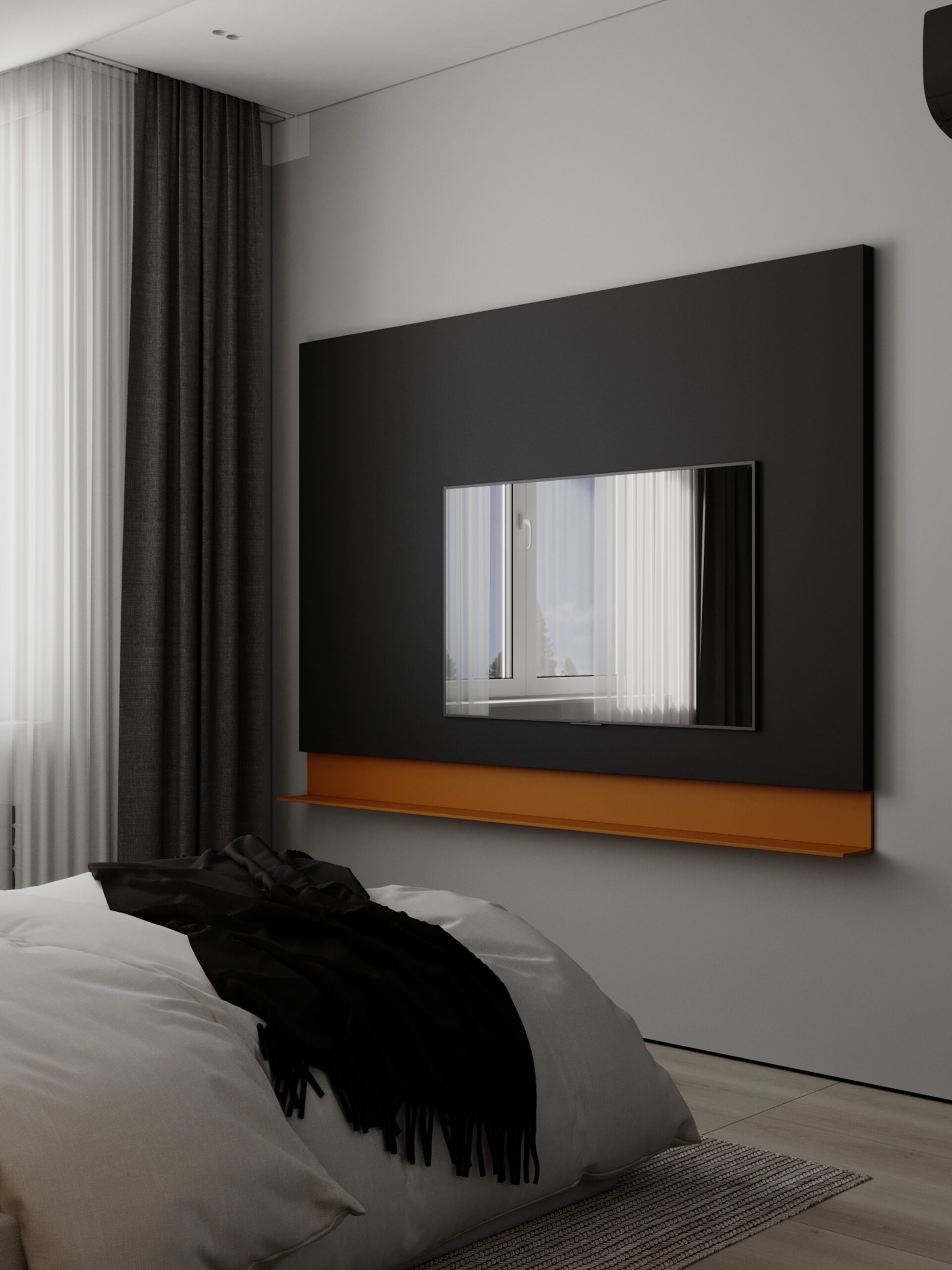 W pokoju zredukowana paleta barw grafitu i czerni łączy się z ciepłem ciemnego drewna, nadając przestrzeni spokojny, ale wyrazisty charakter. Jasne akcenty i dyskretne źródła światła podkreślają geometrię wnętrza, a nowoczesne meble o minimalistycznych formach zapewniają wygodę użytkowania. To miejsce, które sprzyja koncentracji i relaksowi, zachowując przy tym elegancję i wysmakowany design.