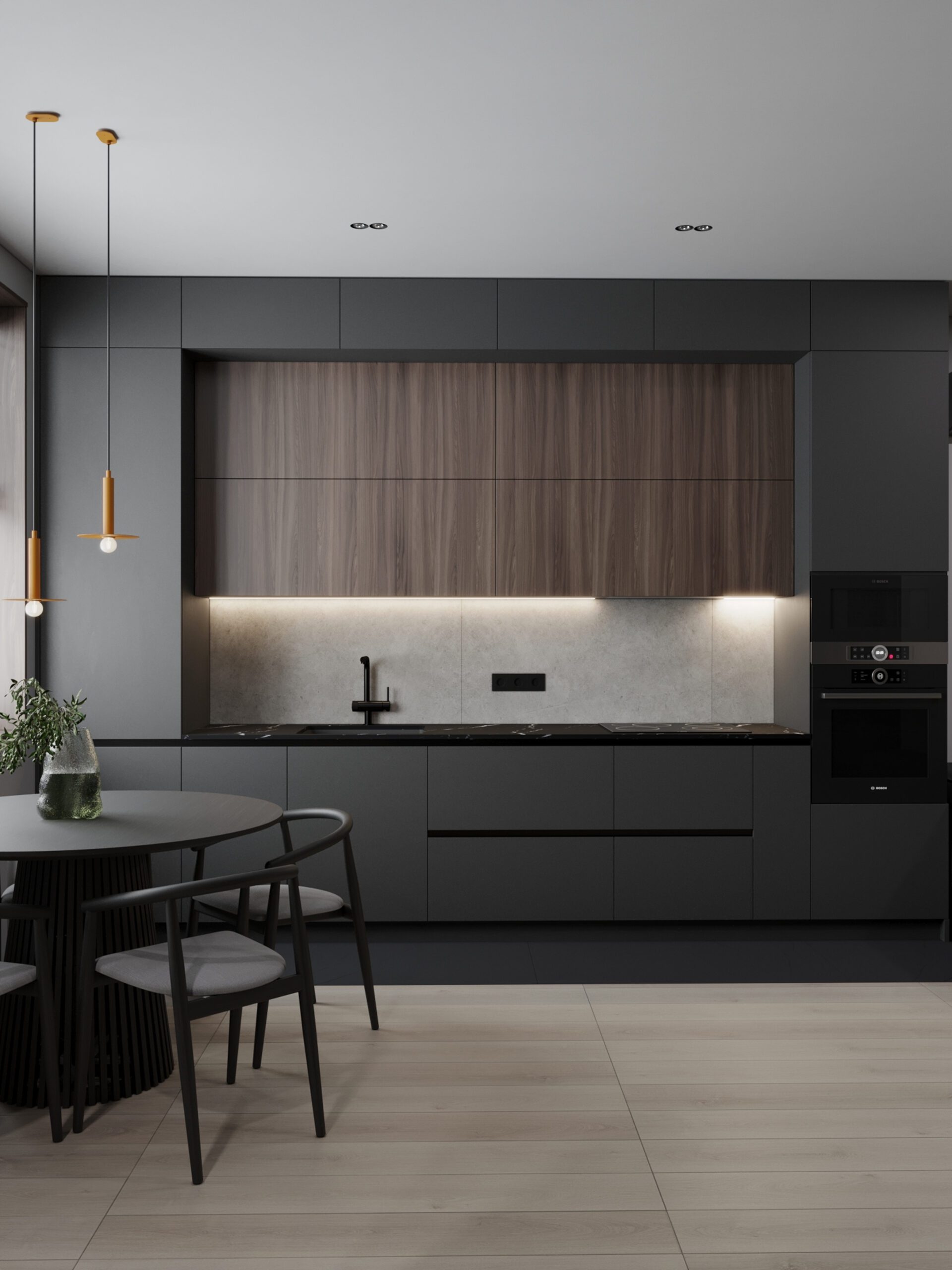 Kuchnia zachwyca precyzyjnym wykonaniem i harmonijnym zestawieniem materiałów. Czarne blaty i bateria tworzą spójną, minimalistyczną kompozycję, a ściana z betonu wprowadza surową, loftową estetykę. Zabudowa z matowymi frontami bez uchwytów oraz zintegrowane sprzęty AGD podkreślają elegancję i ergonomię wnętrza, tworząc przestrzeń sprzyjającą gotowaniu w komfortowych i stylowych warunkach.