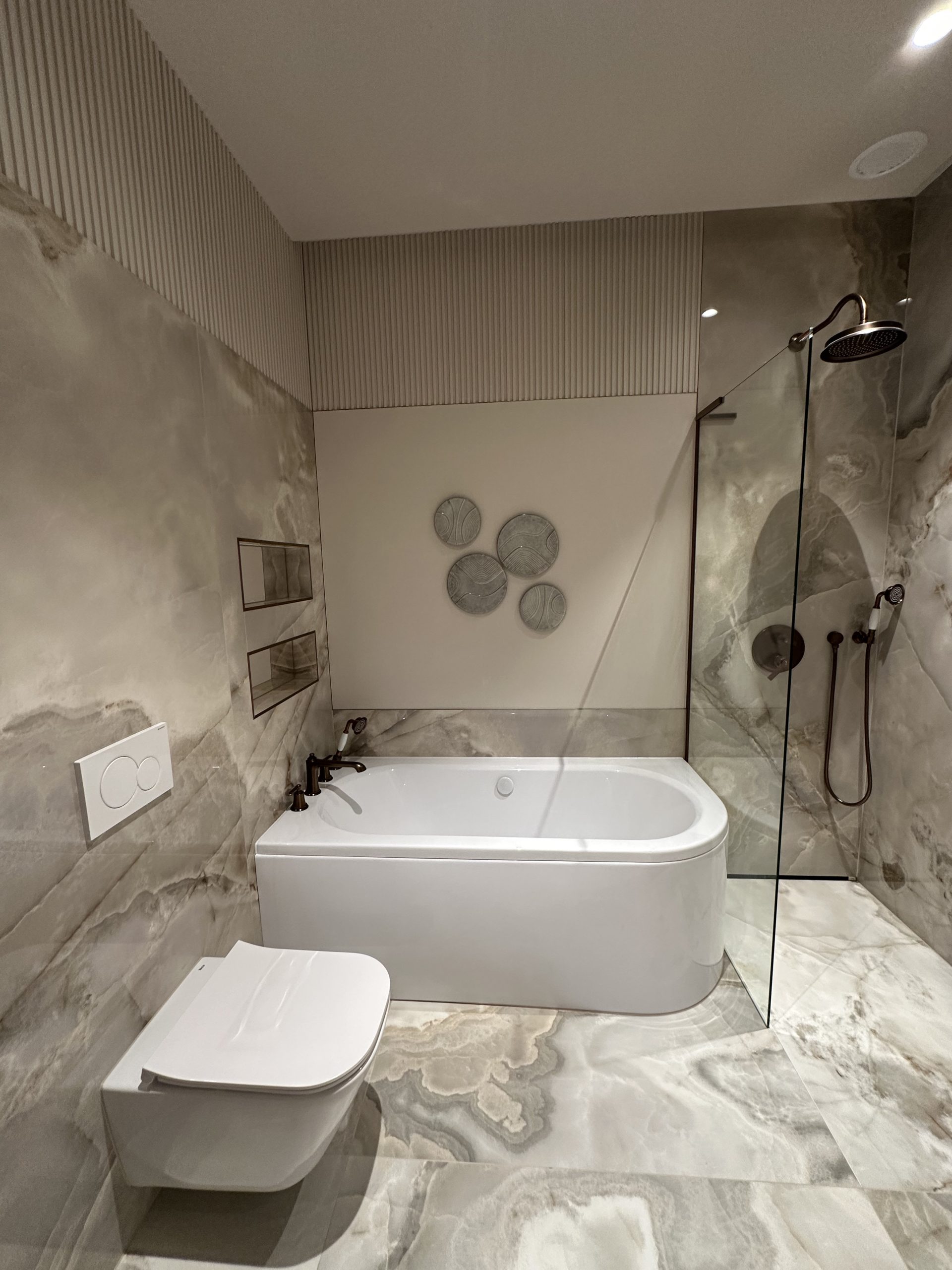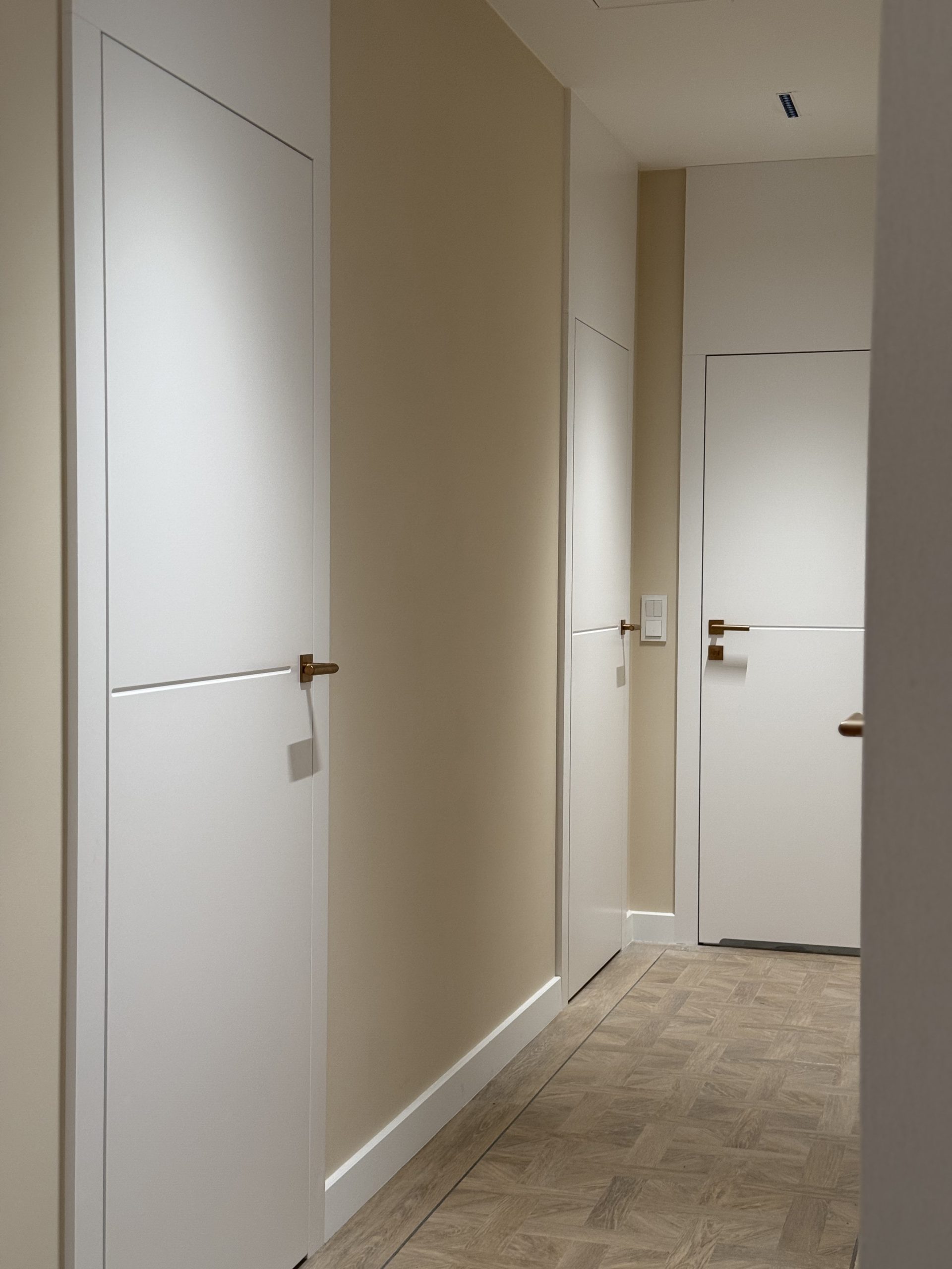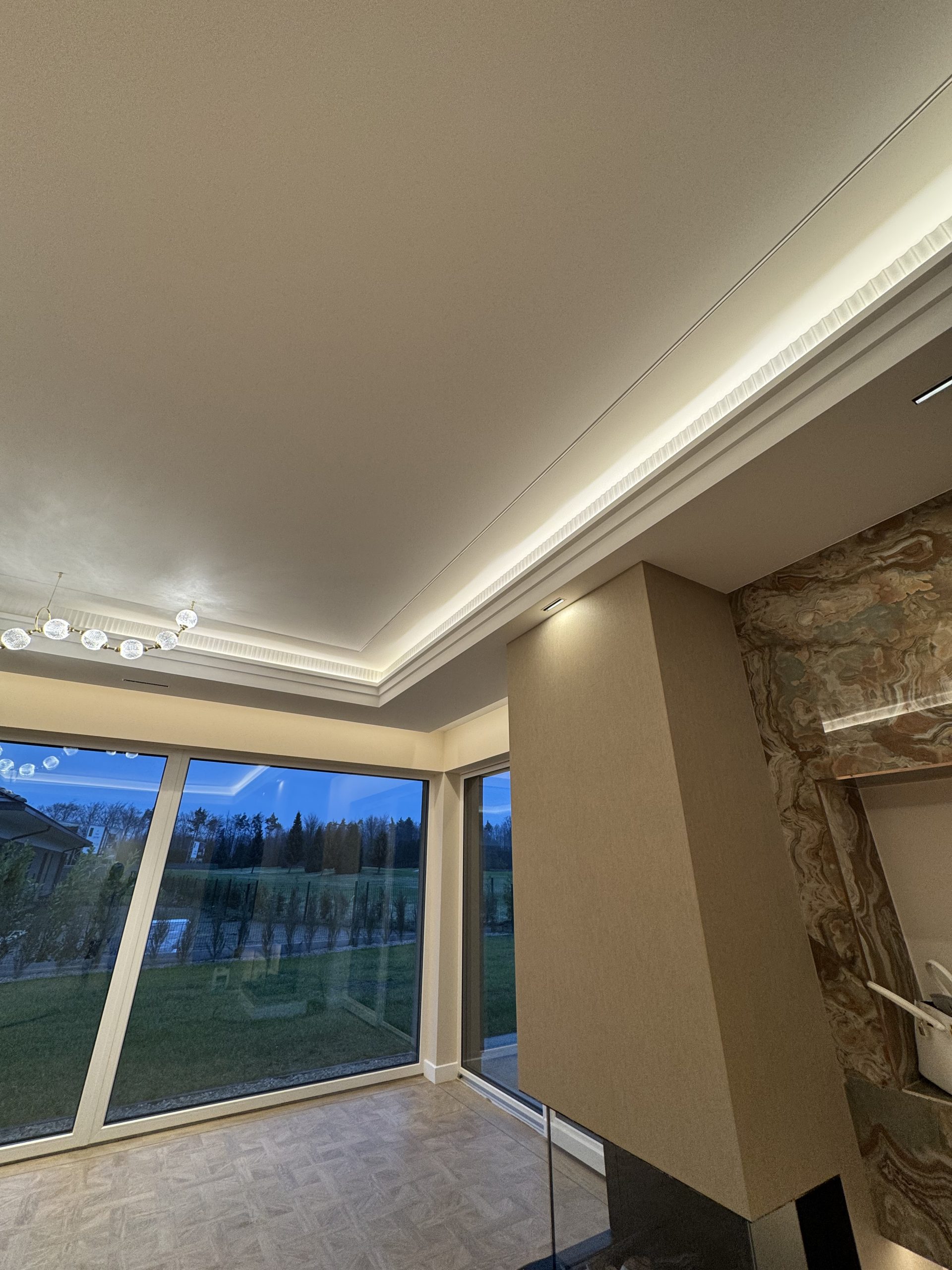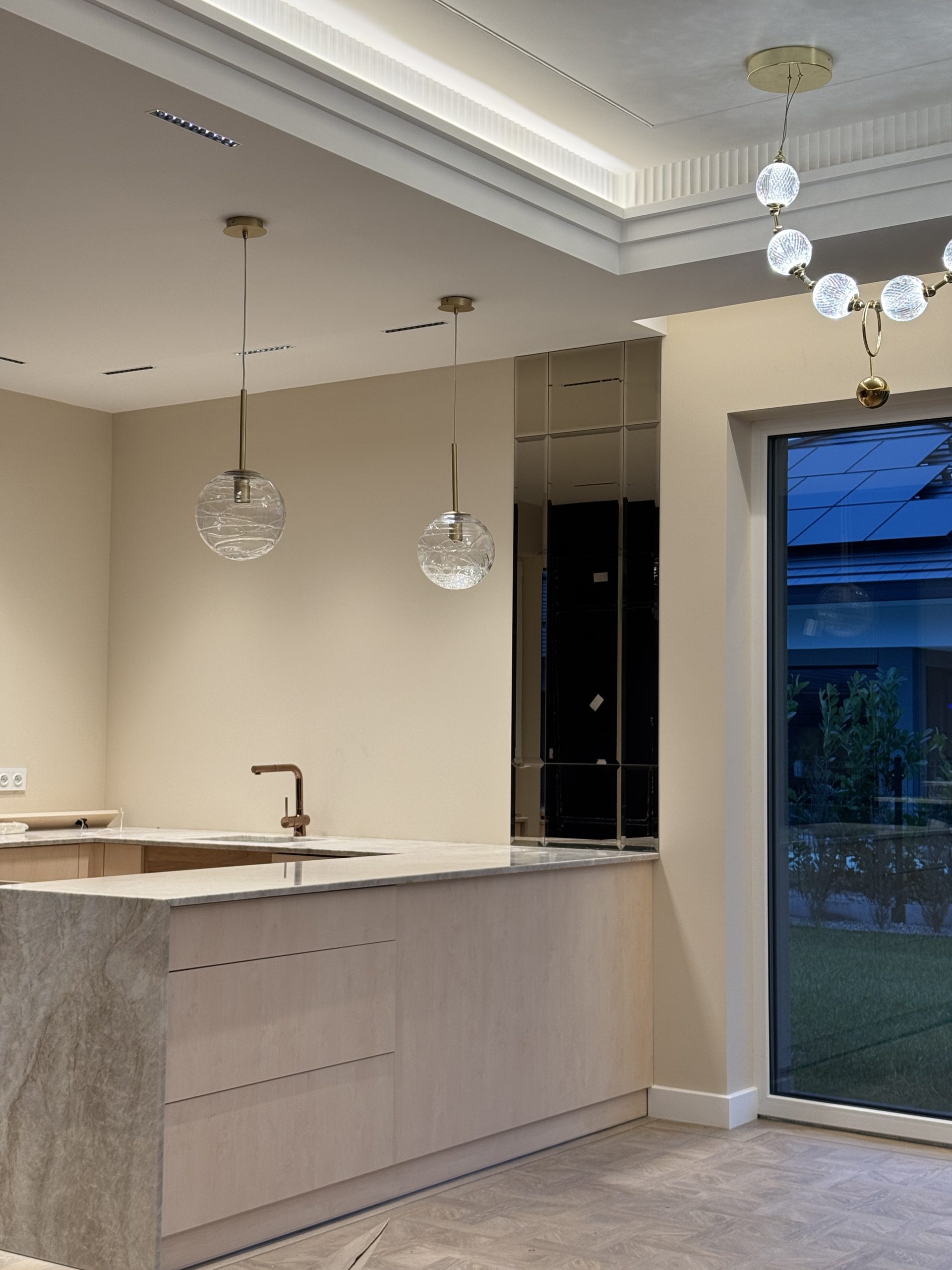 Montaż sztukaterii ściennej i sufitowej, wykonanie zabudowy kominkowej z płyt wielkoformatowych, układanie płyt gresowych 120×280 na ścianach i podłogach w strefach reprezentacyjnych oraz łazience, układanie podłogi winylowej, montaż drzwi bezprzylgowych lakierowanych, cekolowanie i malowanie ścian farbami dekoracyjnymi klasy premium, montaż armatury podtynkowej z serii luksusowej, montaż oświetlenia liniowego LED i lamp designerskich, montaż osprzętu elektrycznego w kolorze miedzi, czarnym lub antracytowym, montaż listew przypodłogowych lakierowanych w kolorze ściany.