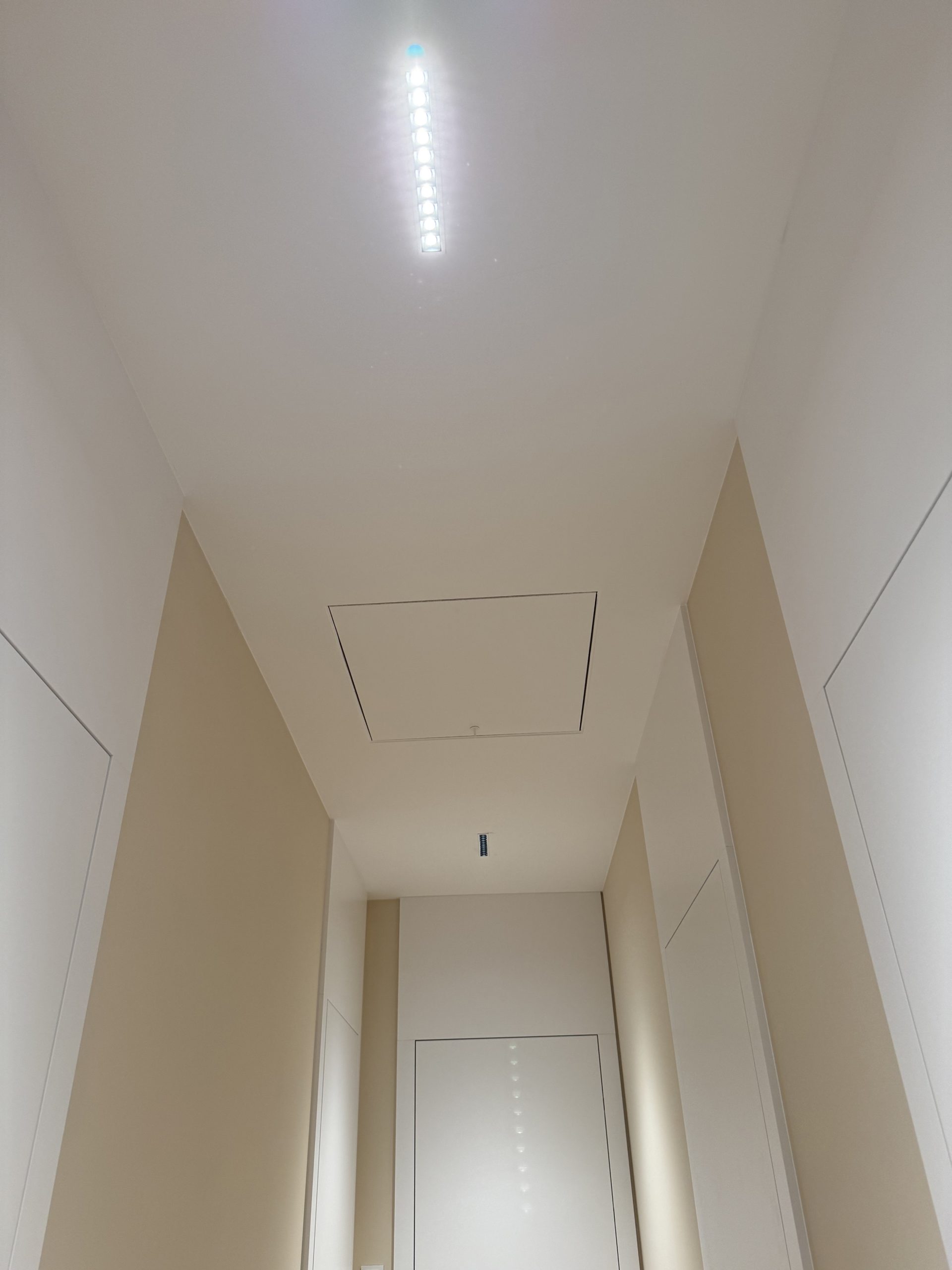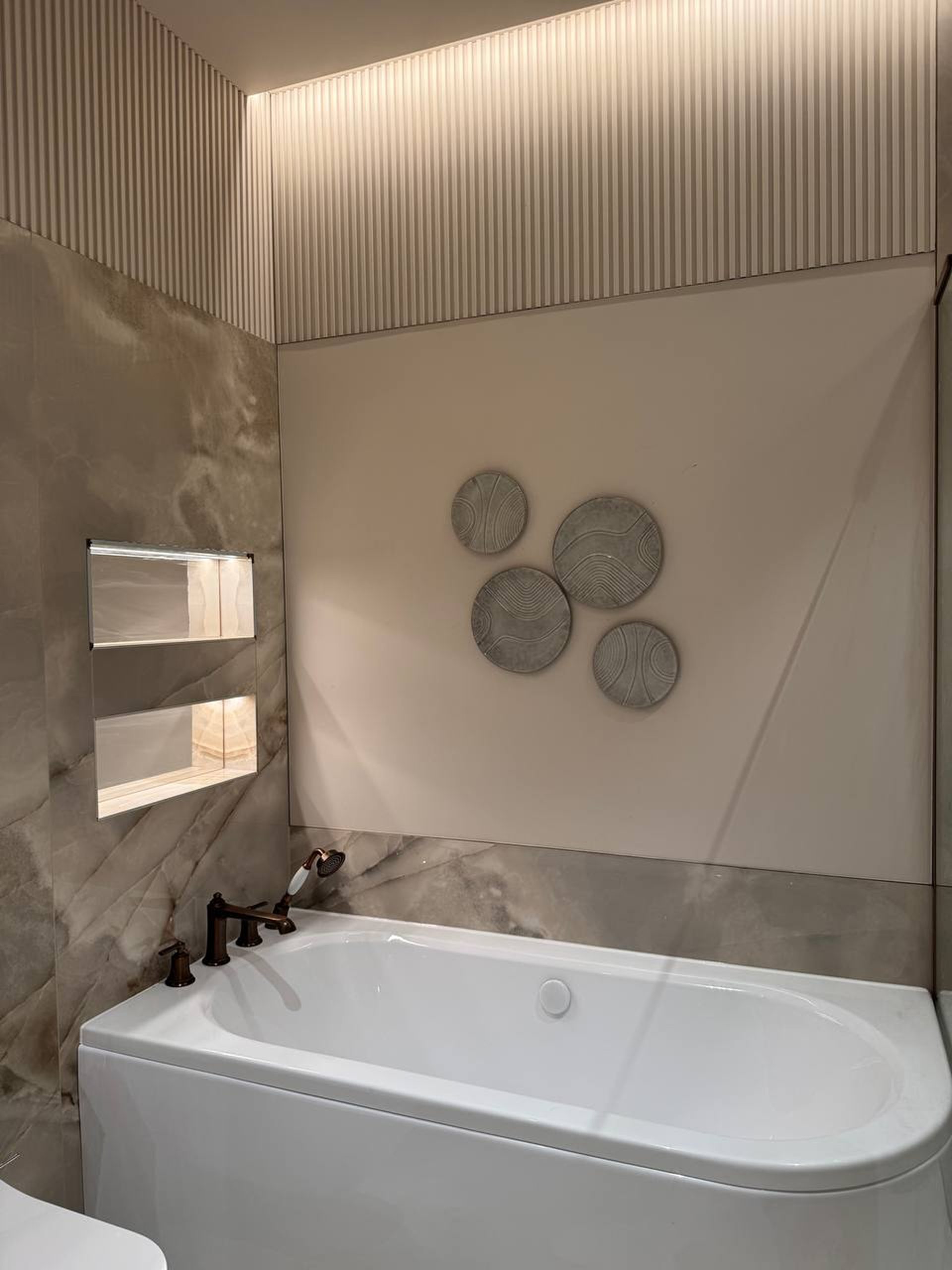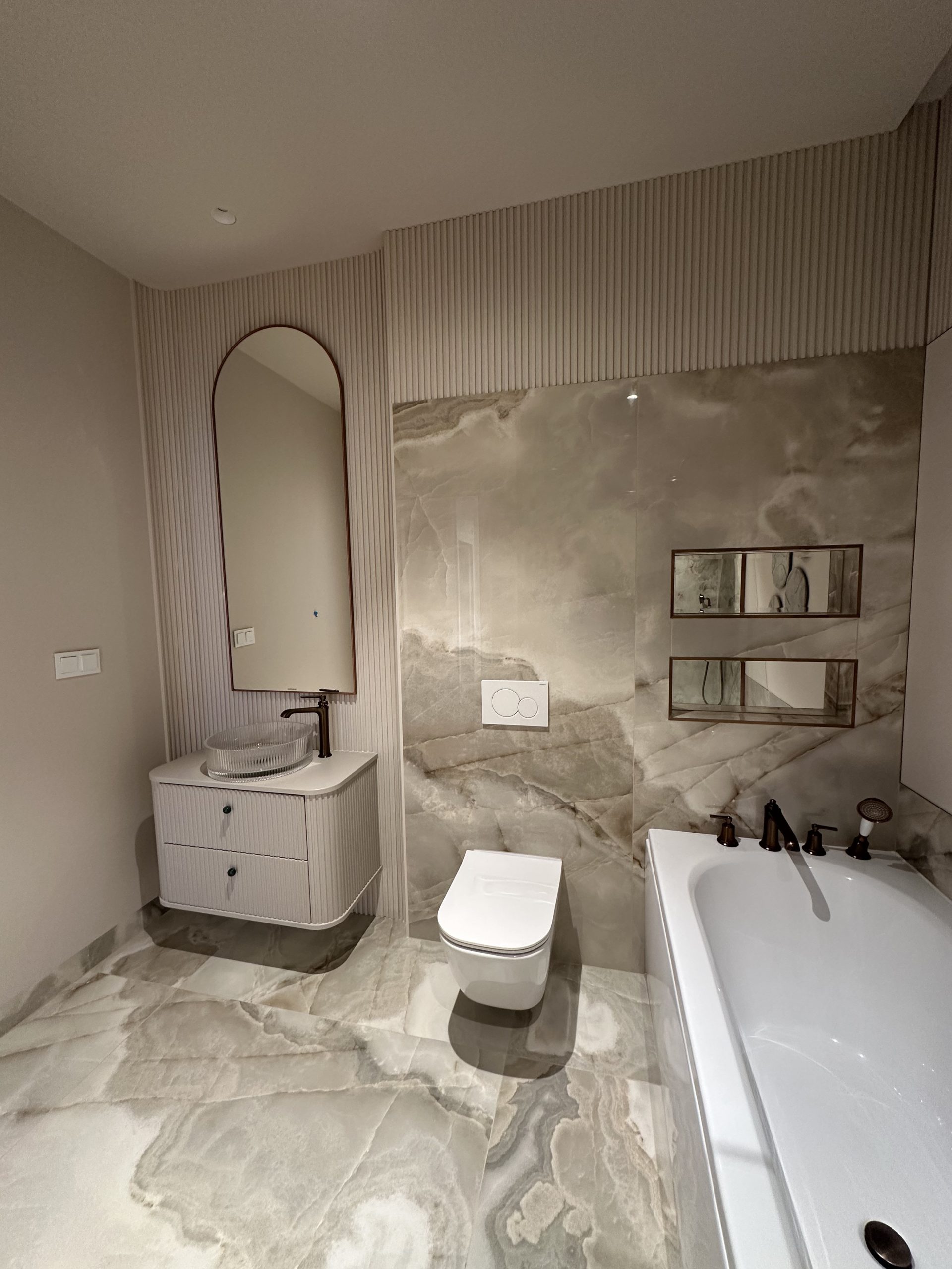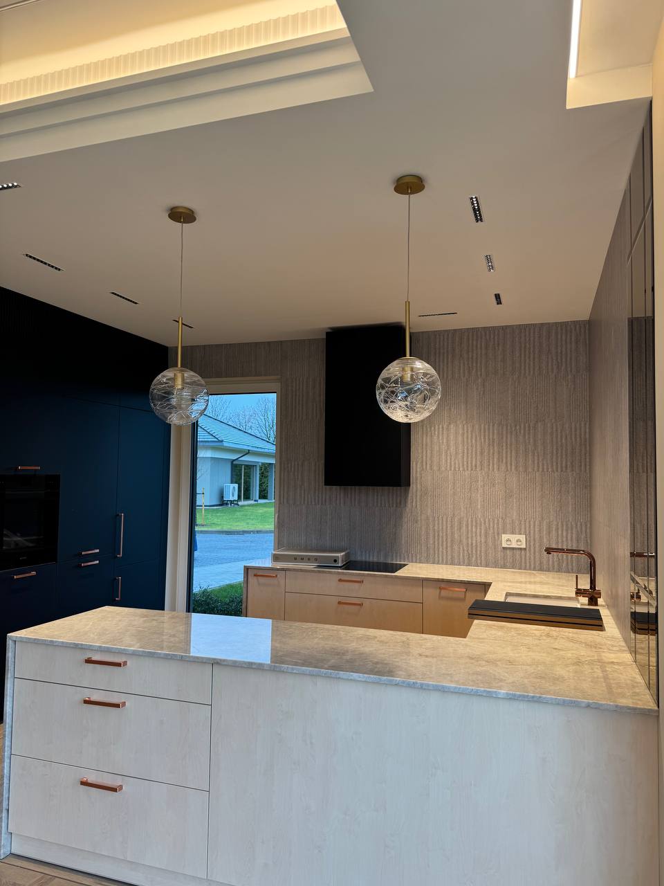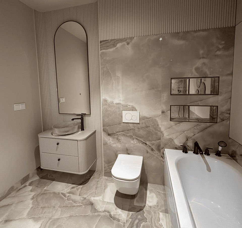 Montaż sztukaterii ściennej i sufitowej, wykonanie zabudowy kominkowej z płyt wielkoformatowych, układanie płyt gresowych 120×280 na ścianach i podłogach w strefach reprezentacyjnych oraz łazience, układanie podłogi winylowej, montaż drzwi bezprzylgowych lakierowanych, cekolowanie i malowanie ścian farbami dekoracyjnymi klasy premium, montaż armatury podtynkowej z serii luksusowej, montaż oświetlenia liniowego LED i lamp designerskich, montaż osprzętu elektrycznego w kolorze miedzi, czarnym lub antracytowym, montaż listew przypodłogowych lakierowanych w kolorze ściany.