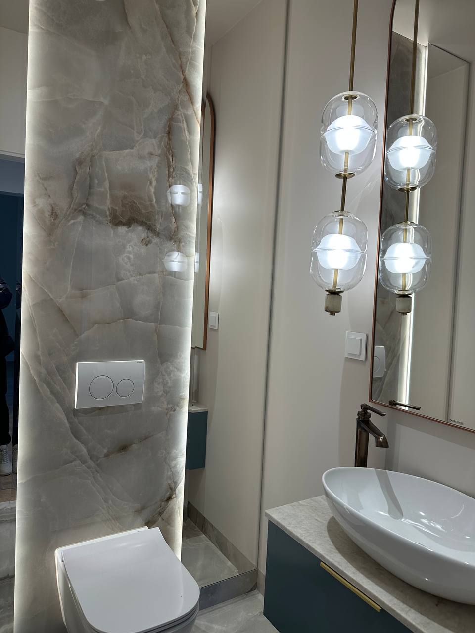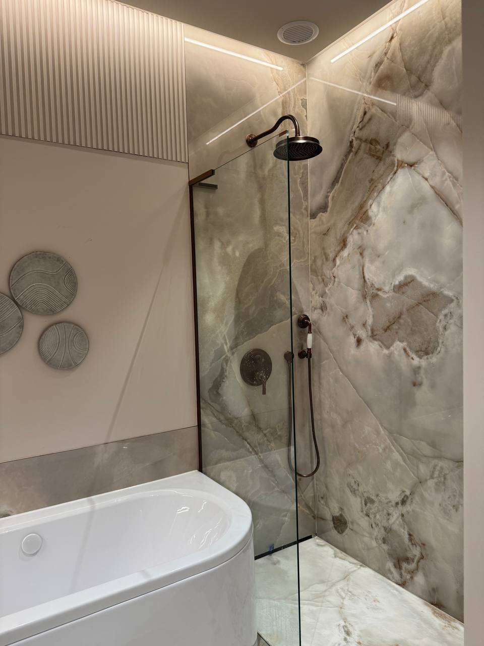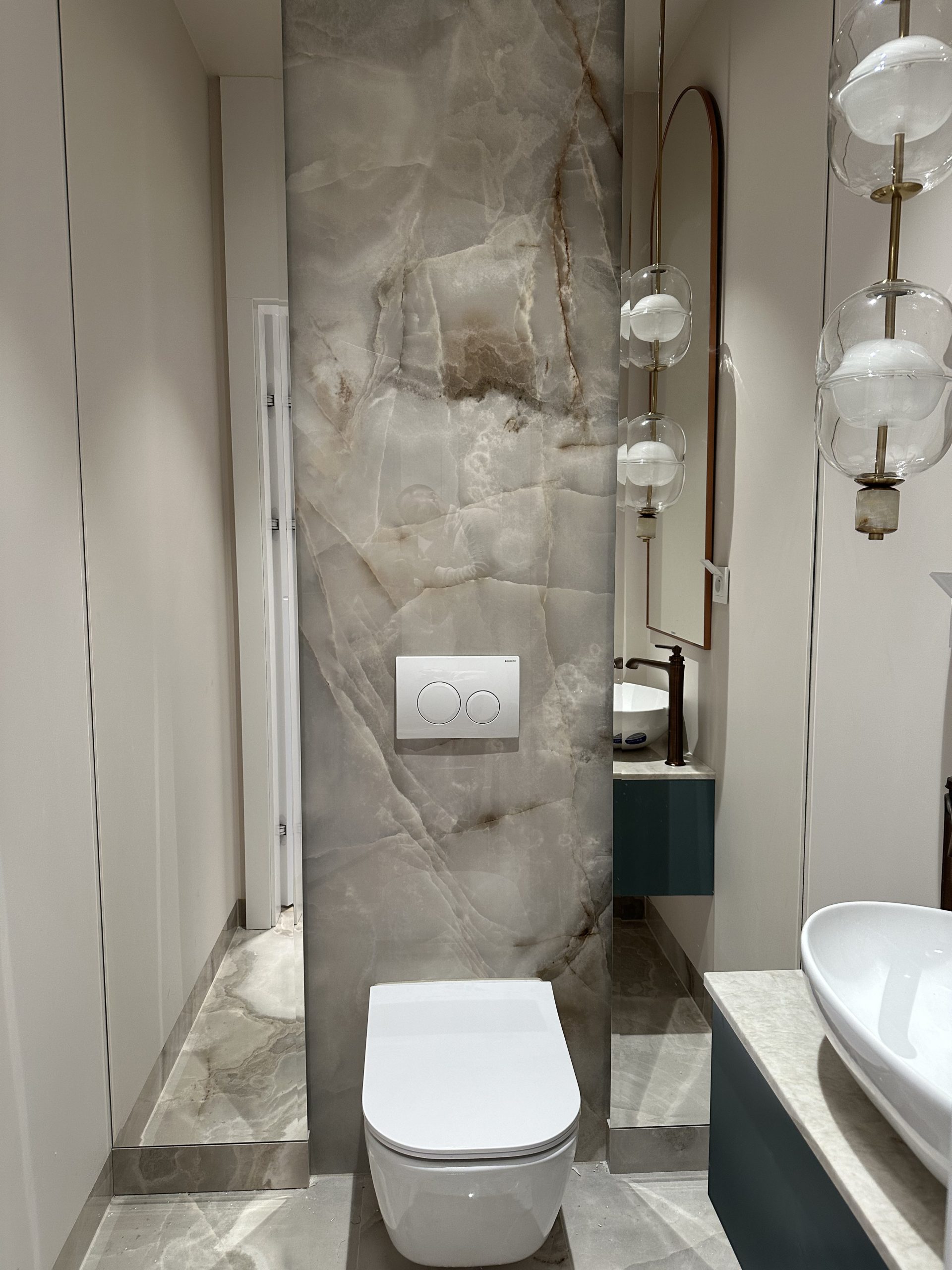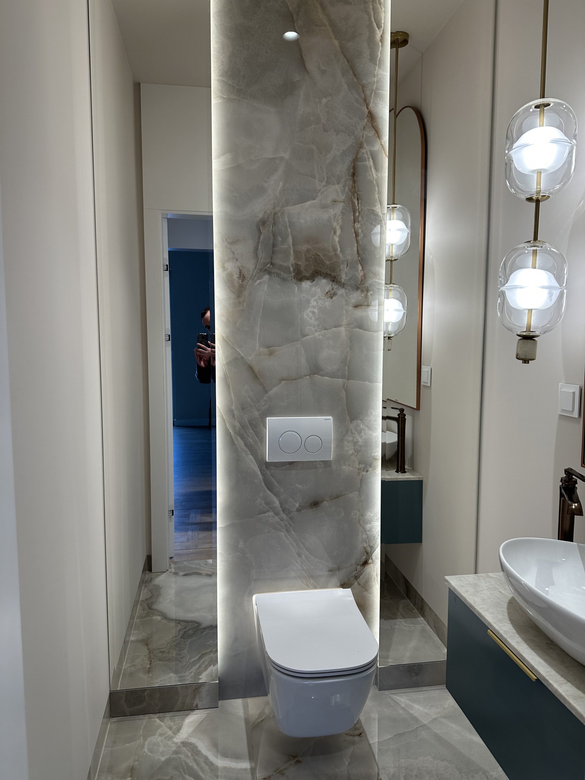 Montaż sztukaterii ściennej i sufitowej, wykonanie zabudowy kominkowej z płyt wielkoformatowych, układanie płyt gresowych 120×280 na ścianach i podłogach w strefach reprezentacyjnych oraz łazience, układanie podłogi winylowej, montaż drzwi bezprzylgowych lakierowanych, cekolowanie i malowanie ścian farbami dekoracyjnymi klasy premium, montaż armatury podtynkowej z serii luksusowej, montaż oświetlenia liniowego LED i lamp designerskich, montaż osprzętu elektrycznego w kolorze miedzi, czarnym lub antracytowym, montaż listew przypodłogowych lakierowanych w kolorze ściany.